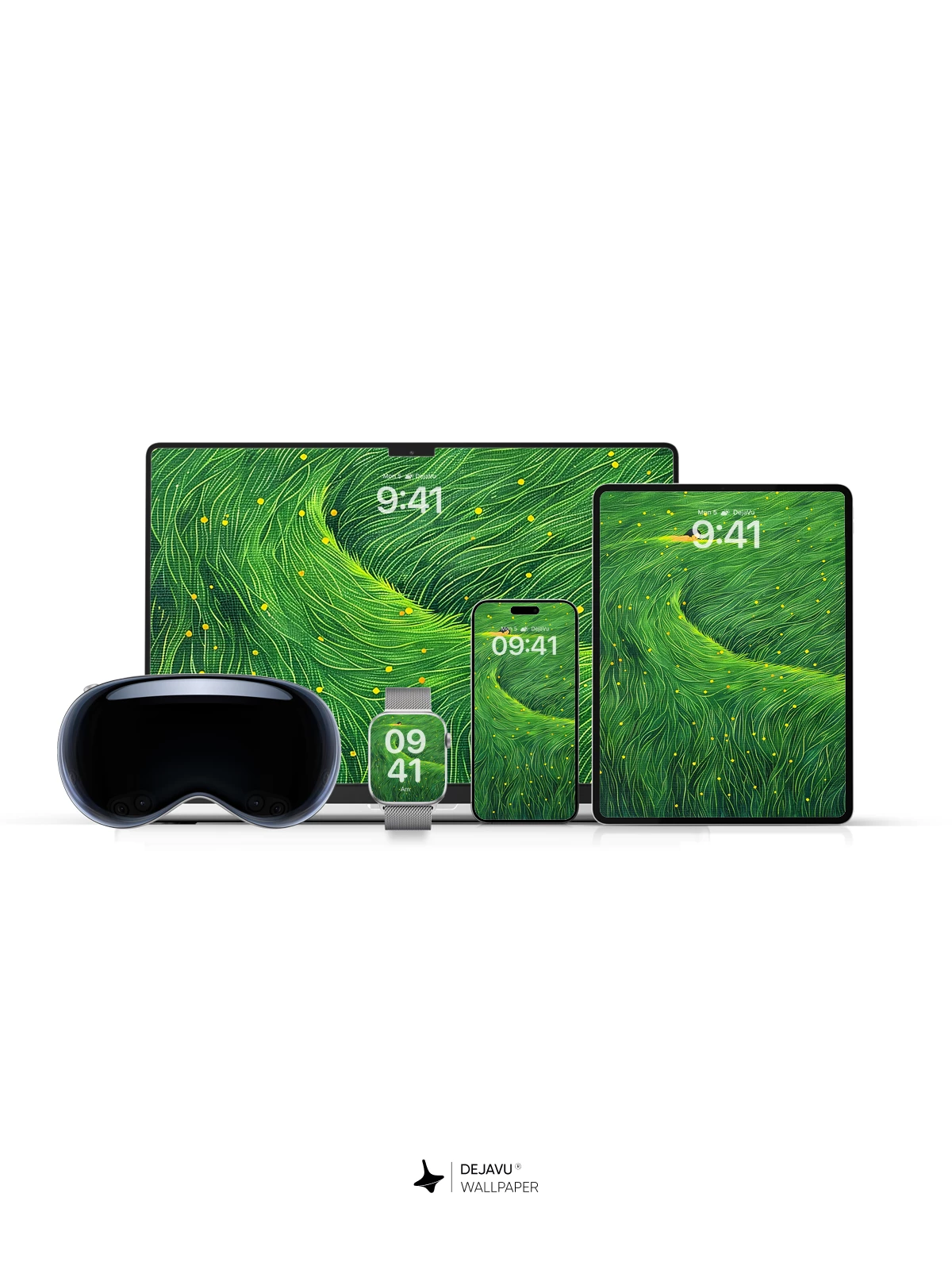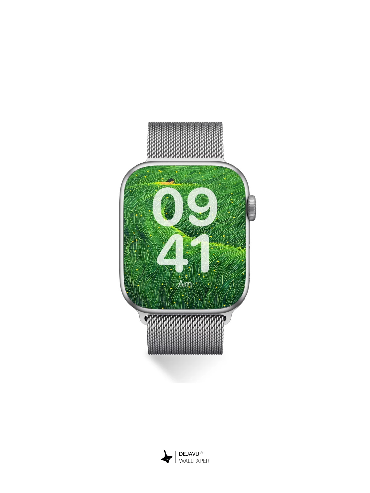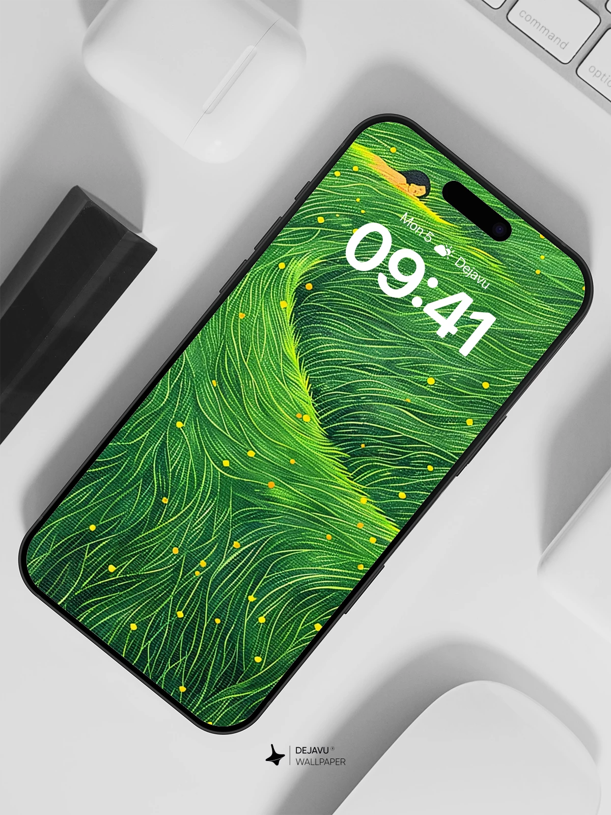This mesmerizing artwork blends surrealism with nature’s rhythm, depicting a figure nestled in undulating green waves dotted with golden lights—evoking mystery and serenity. Ideal for iPhone, Android, or tablet backgrounds, this 8K wallpaper transforms your device into a portal to tranquil imagination.