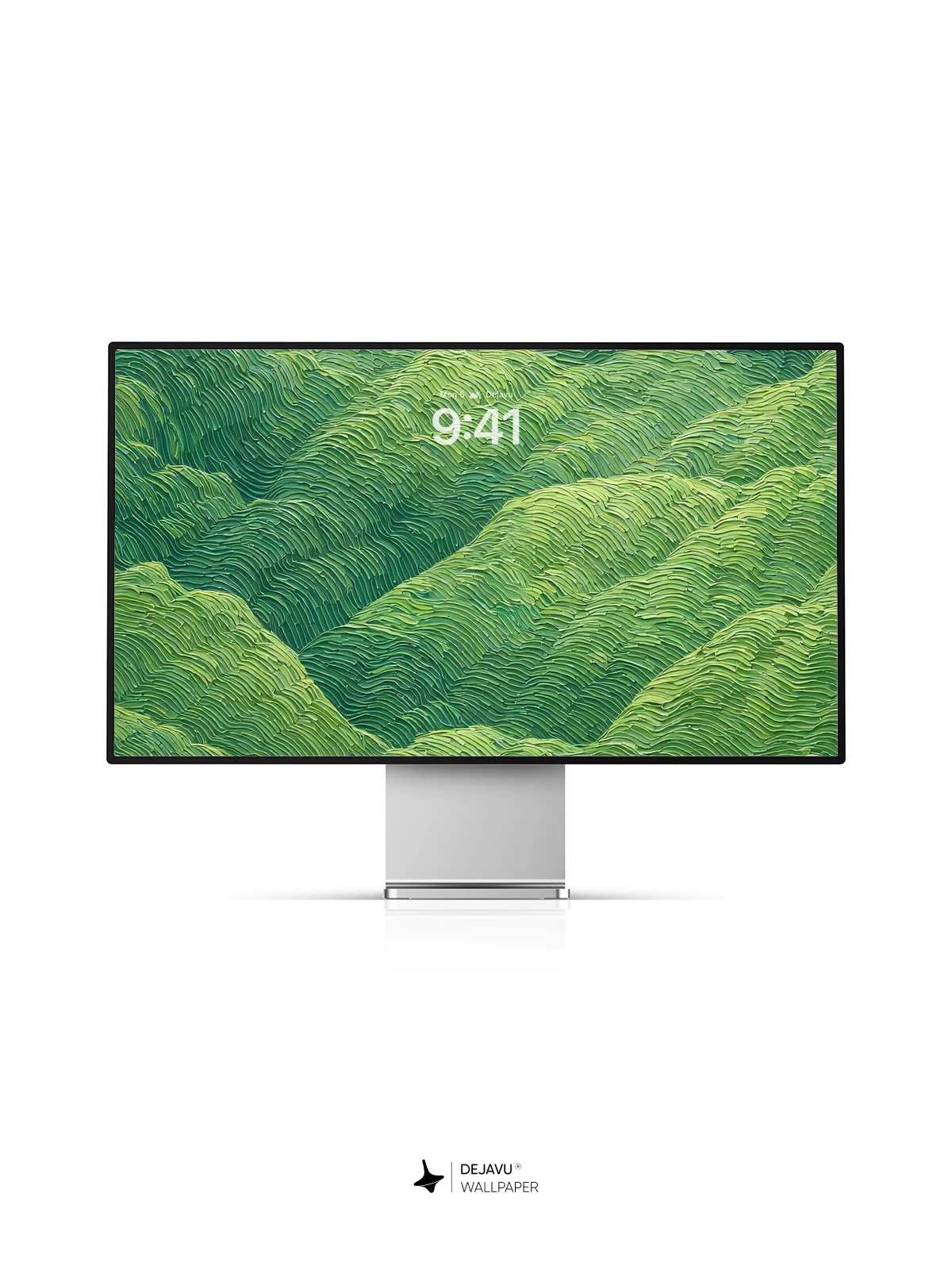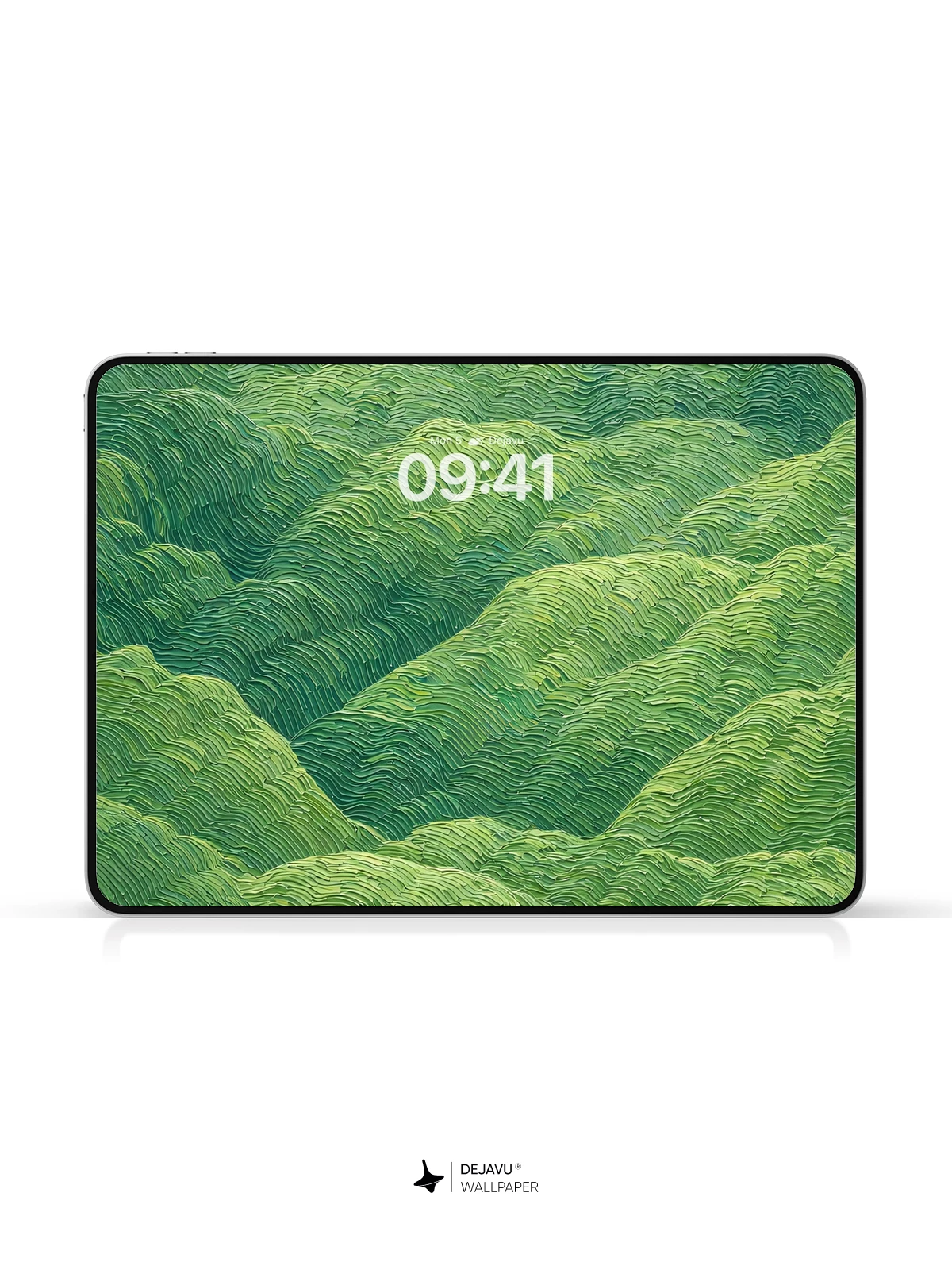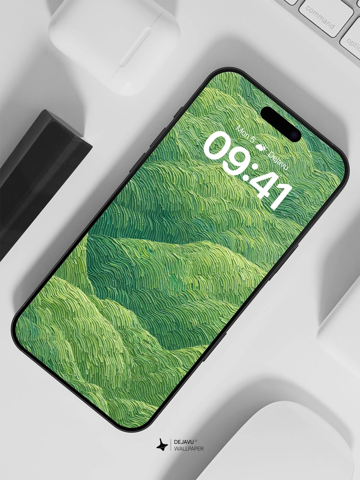 This mesmerizing 8K wallpaper captures a surreal seascape of undulating green hills, rendered in a painterly style reminiscent of modern impressionism. The rhythmic waves of texture evoke a sense of endless movement and natural harmony, creating a tranquil yet dynamic backdrop. Ideal for iPhone, Android, tablets, or desktops, this design transforms your device into a portal to a serene, dreamlike world where nature meets artistry.