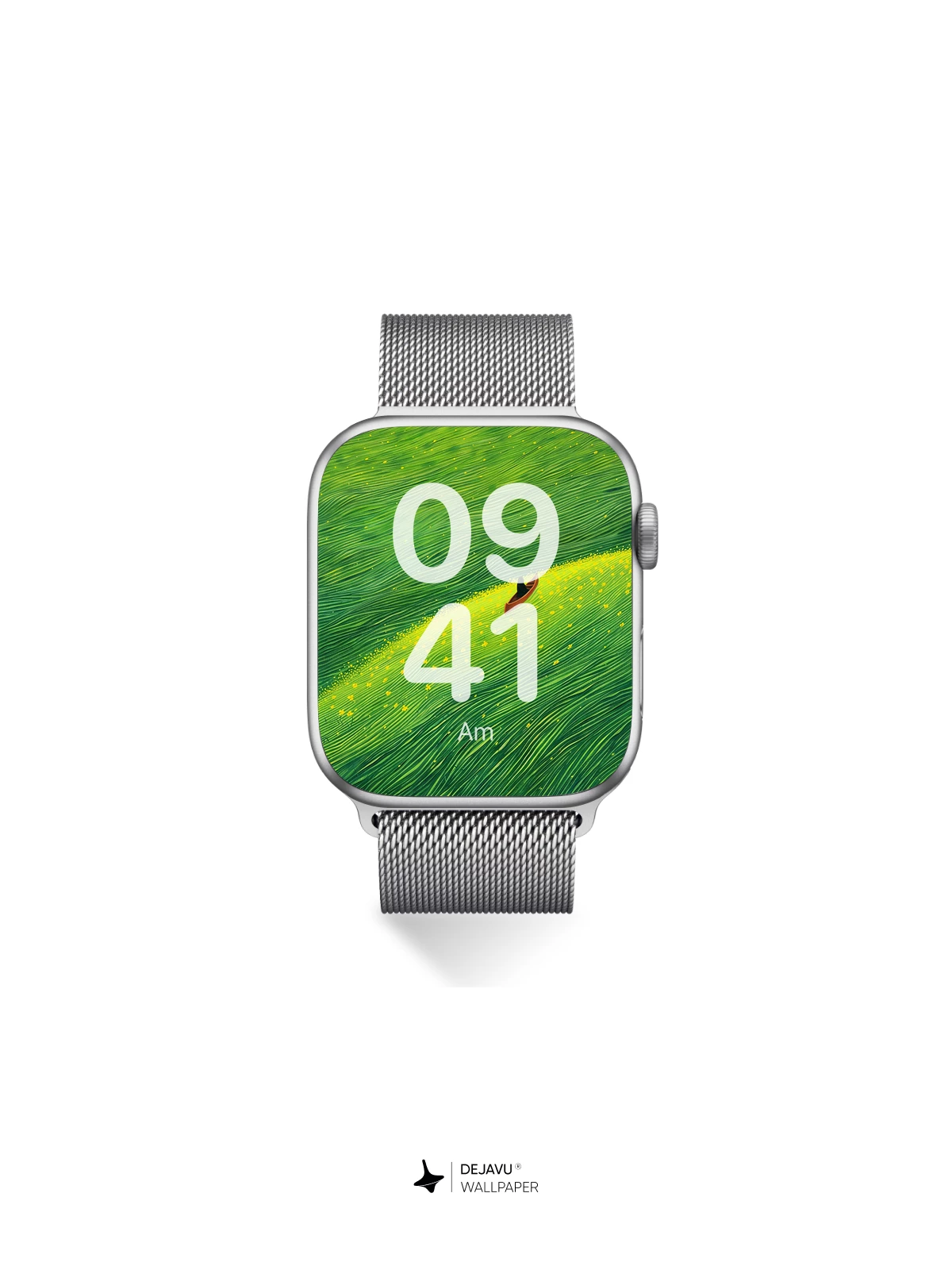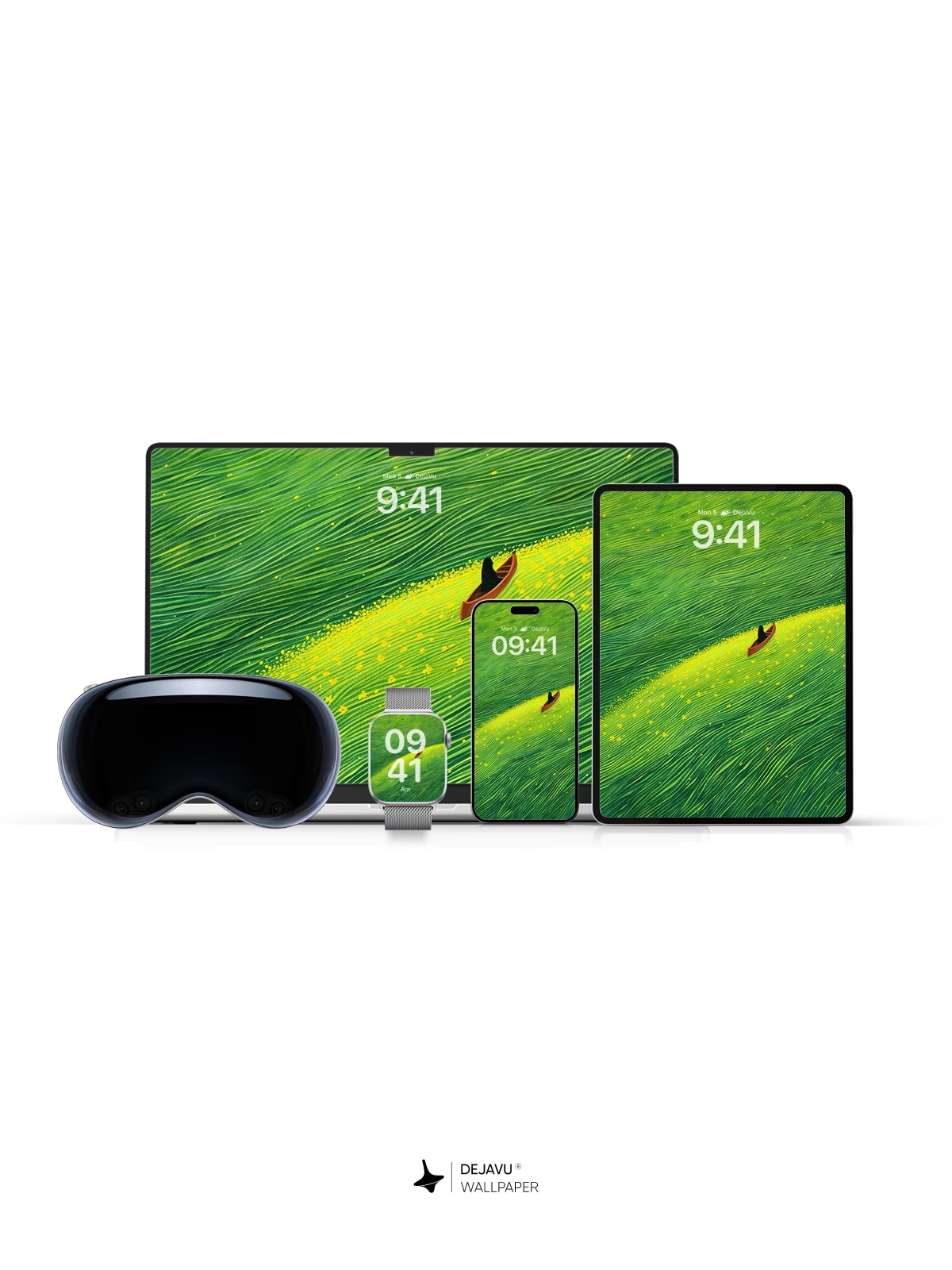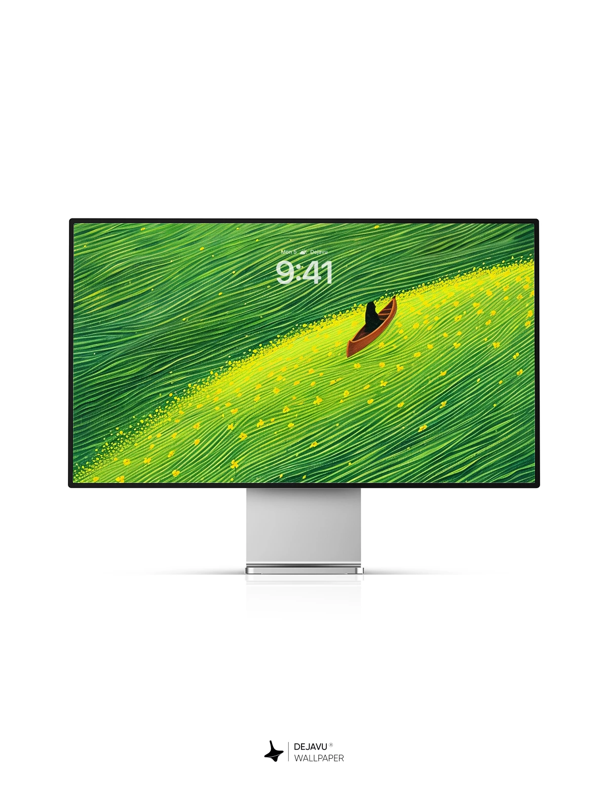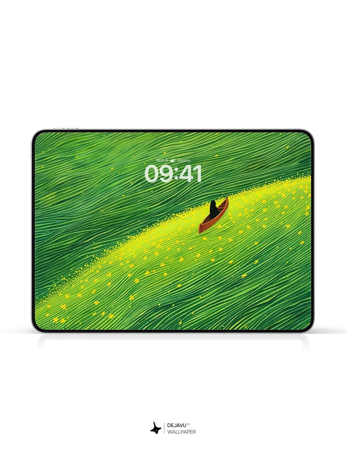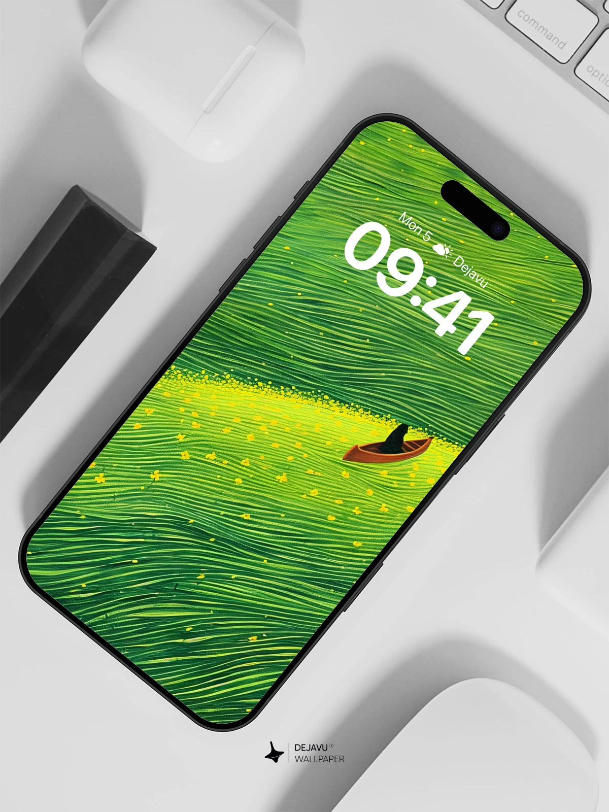 This mesmerizing 8K wallpaper captures a surreal vision of undulating green fields resembling ocean waves, punctuated by golden flowers and a solitary canoe gliding through the scene. Evoking a sense of peaceful solitude and timeless wonder, it blends natural beauty with artistic imagination. Ideal for iPhone, Android, and tablets, this high-resolution design transforms your device into a portal to a tranquil, otherworldly realm.