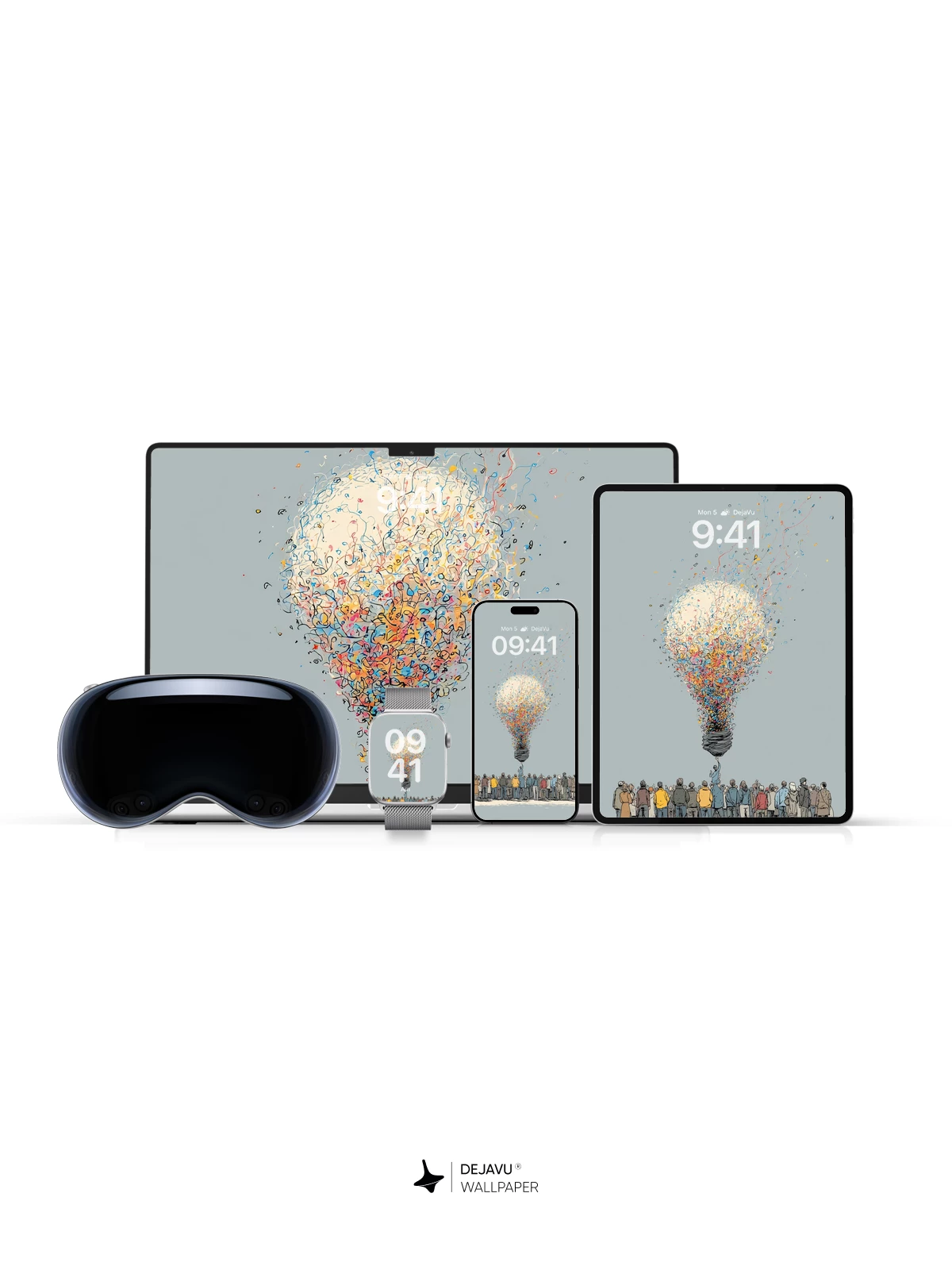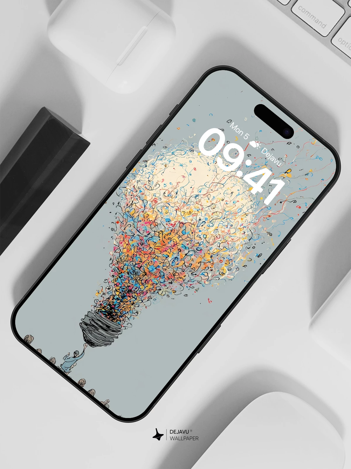 Inspired by surreal art, this striking image depicts a group of people standing in awe beneath a massive lightbulb erupting into a cascade of vibrant confetti. The whimsical yet profound scene symbolizes collective inspiration and creativity, making it an ideal high-resolution 8K wallpaper for iPhone, Android, and tablets. With its delicate linework and ethereal atmosphere, the artwork transforms any device screen into a portal of imagination.