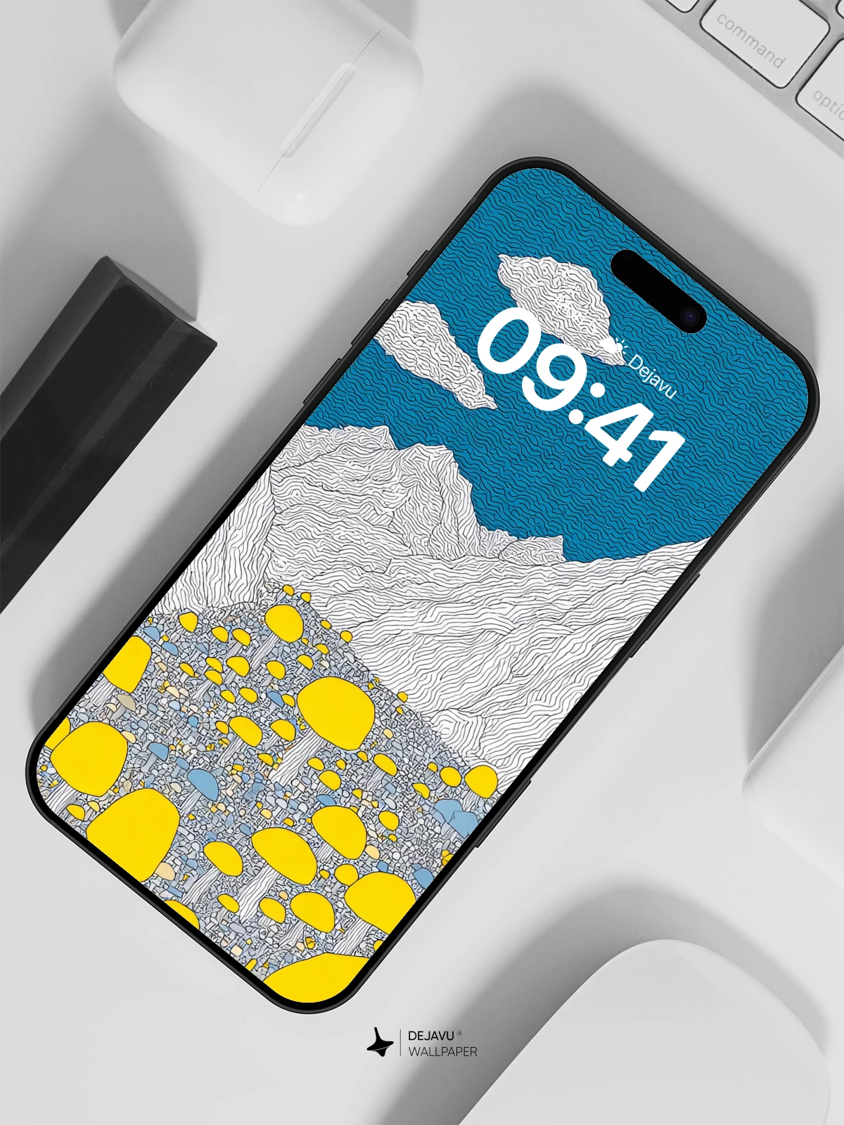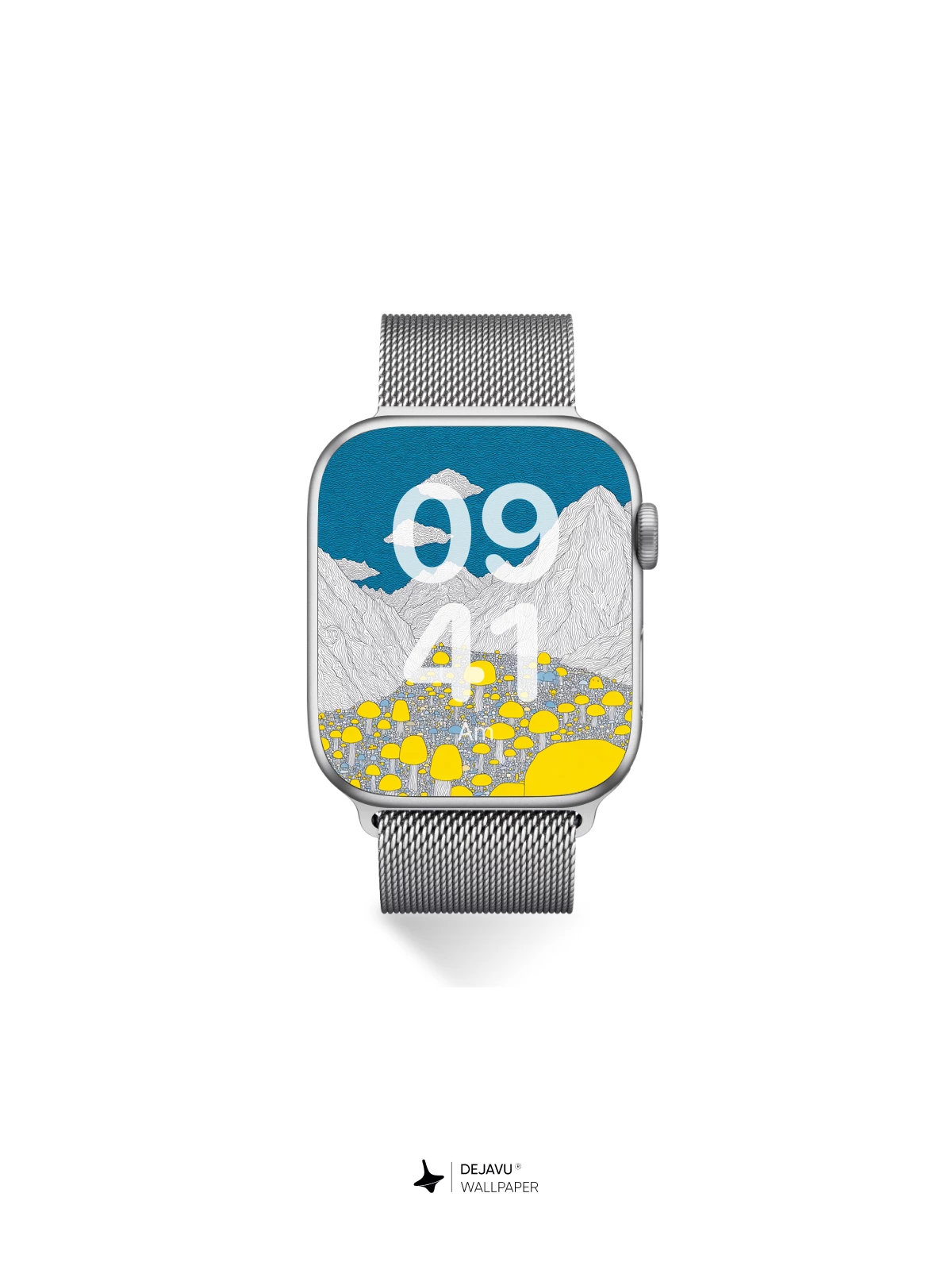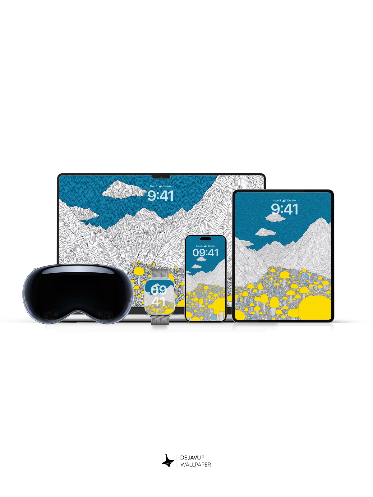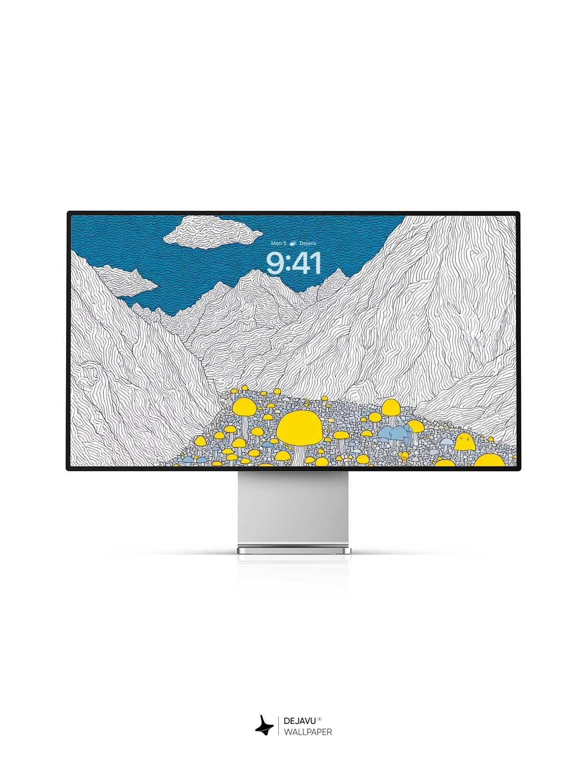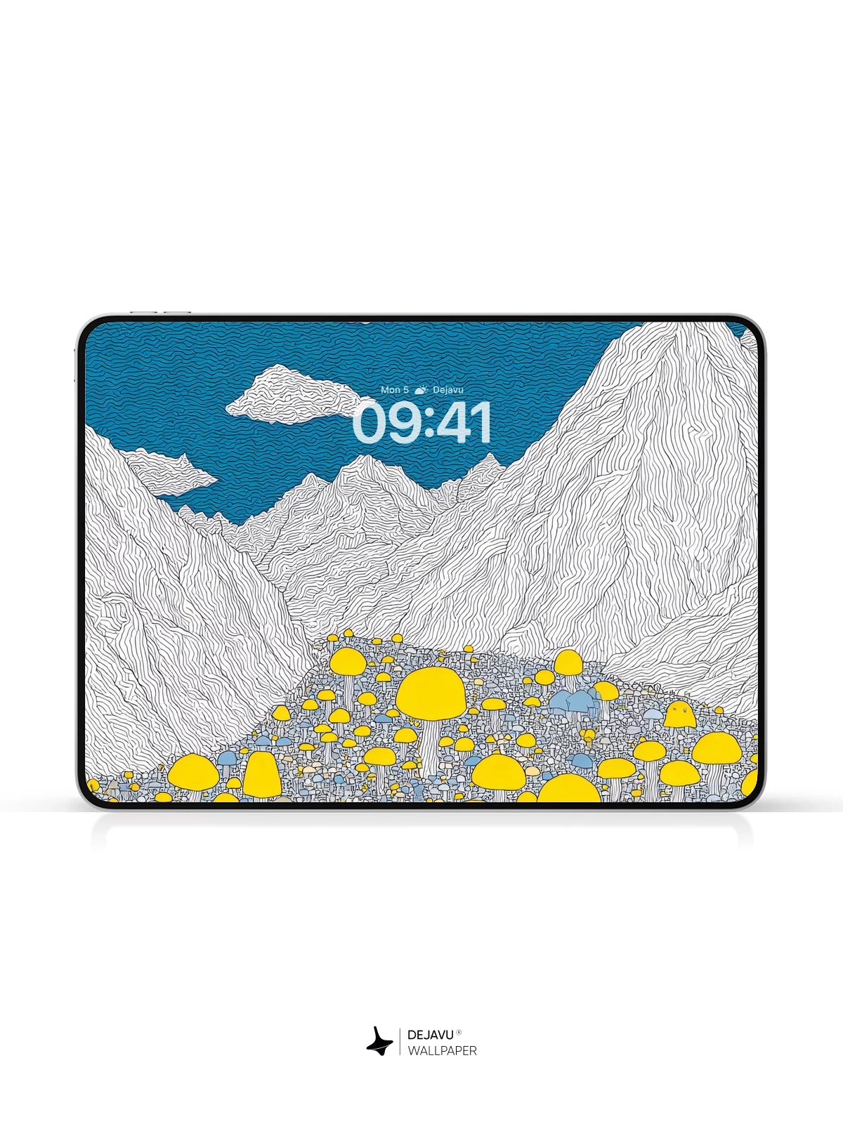 This enchanting 8K wallpaper transports you to a surreal landscape where luminous yellow mushrooms bloom across a mystical valley, framed by towering white mountains beneath a deep blue sky. Inspired by whimsical fantasy art, the scene evokes wonder and serenity, perfect for iPhone, Android, or tablet screens. The intricate linework and vibrant contrast create a mesmerizing visual experience that feels both otherworldly and peaceful—ideal for those who love imaginative design with a touch of magic.”.
