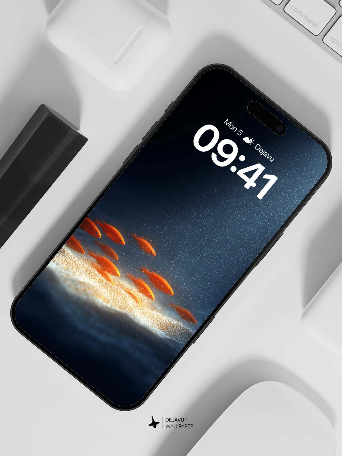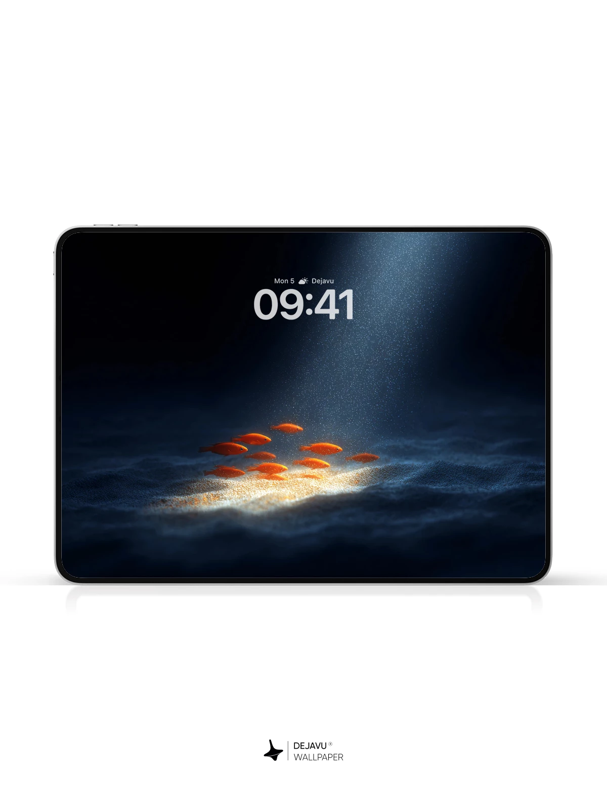 In the depths of a dark ocean, a divine beam of light pierces the abyss, illuminating a school of vibrant orange fish gliding over a shimmering sandy patch. This surreal composition evokes a sense of wonder and solitude, blending natural elements with otherworldly lighting. Ideal as a high-resolution 8K wallpaper for iPhone, Android, or tablets, it transforms your device into a portal of calm and imagination. The interplay of shadow and glow creates a poetic atmosphere, inviting viewers into a quiet moment of reflection beneath the waves.