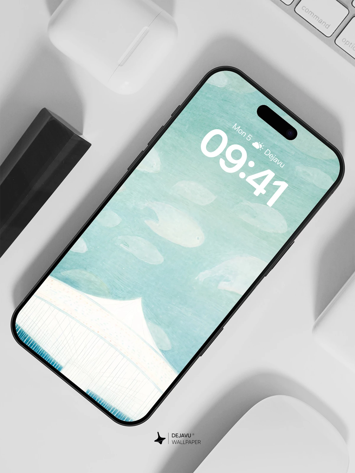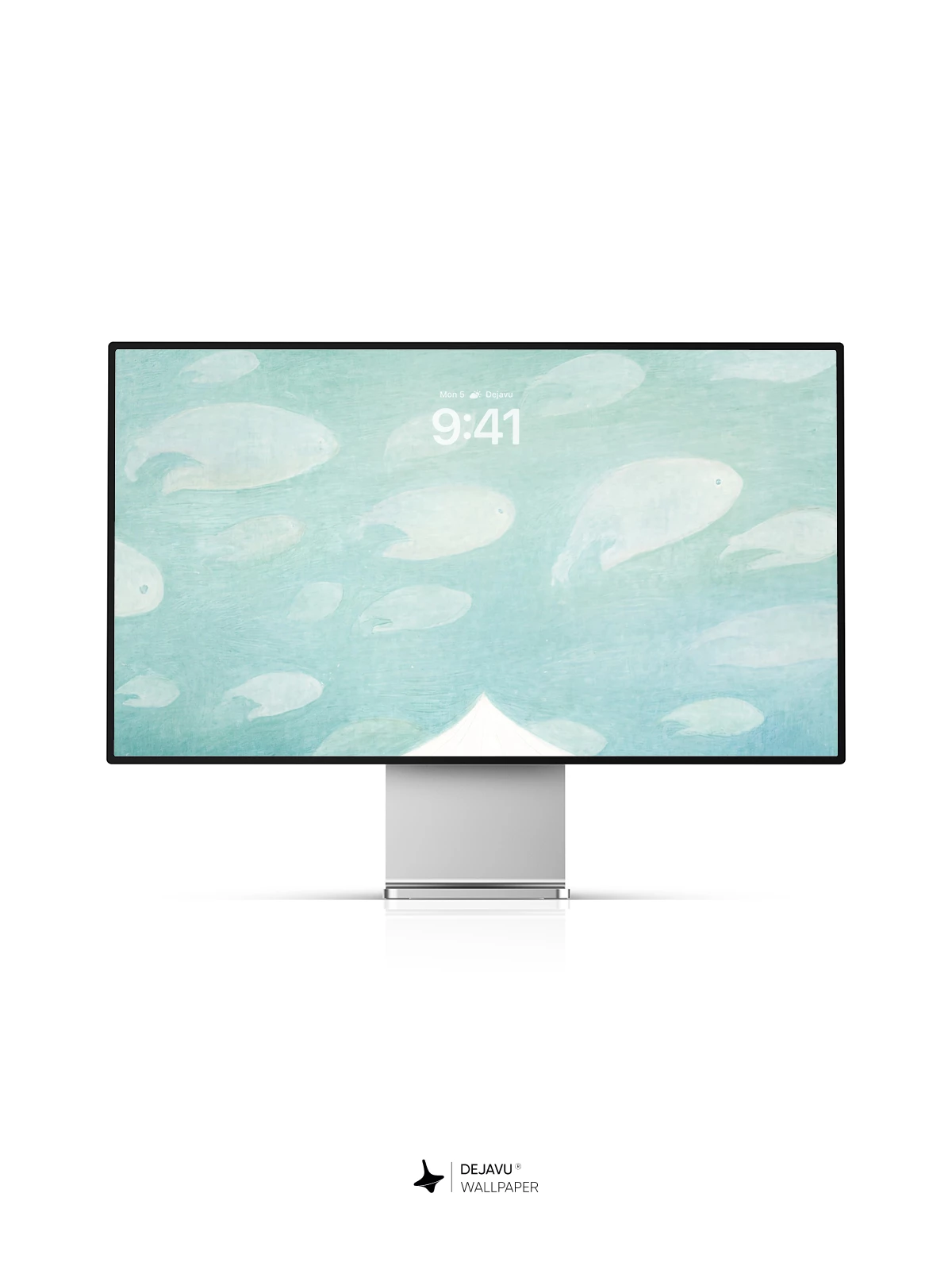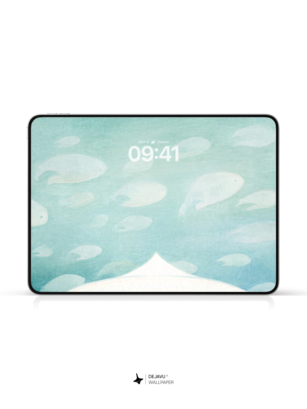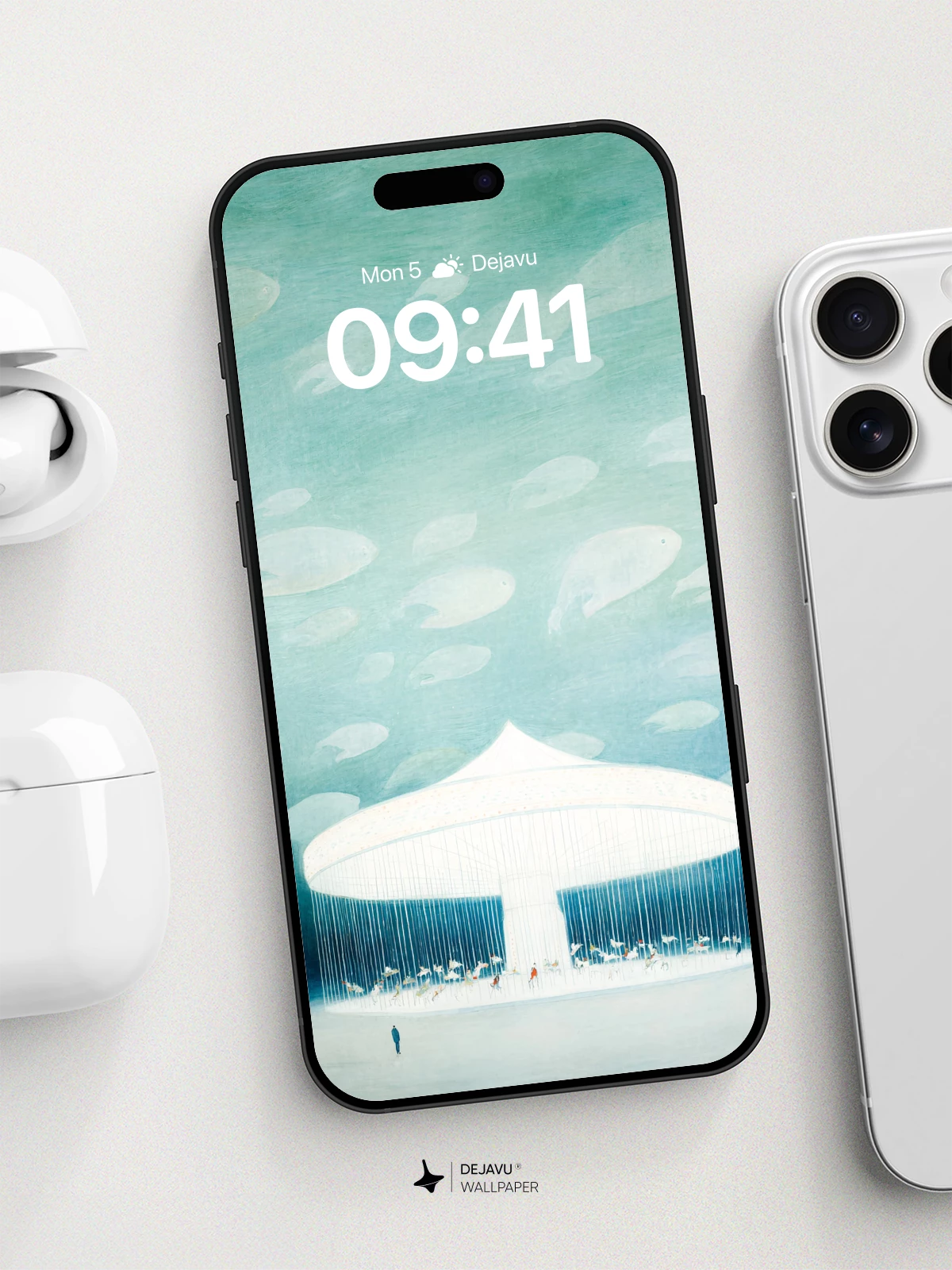 This ethereal artwork features a luminous white pavilion suspended in a tranquil turquoise sky, where ghostly fish float like clouds above. Inspired by surrealist visions, the scene evokes a sense of wonder and quiet solitude. The delicate rain-like lines cascading from the structure create a mystical atmosphere, while tiny figures gather below, adding scale and narrative depth. Ideal as an 8K wallpaper for iPhone, Android, or tablets, this piece transforms any device into a portal to a peaceful, otherworldly realm.
