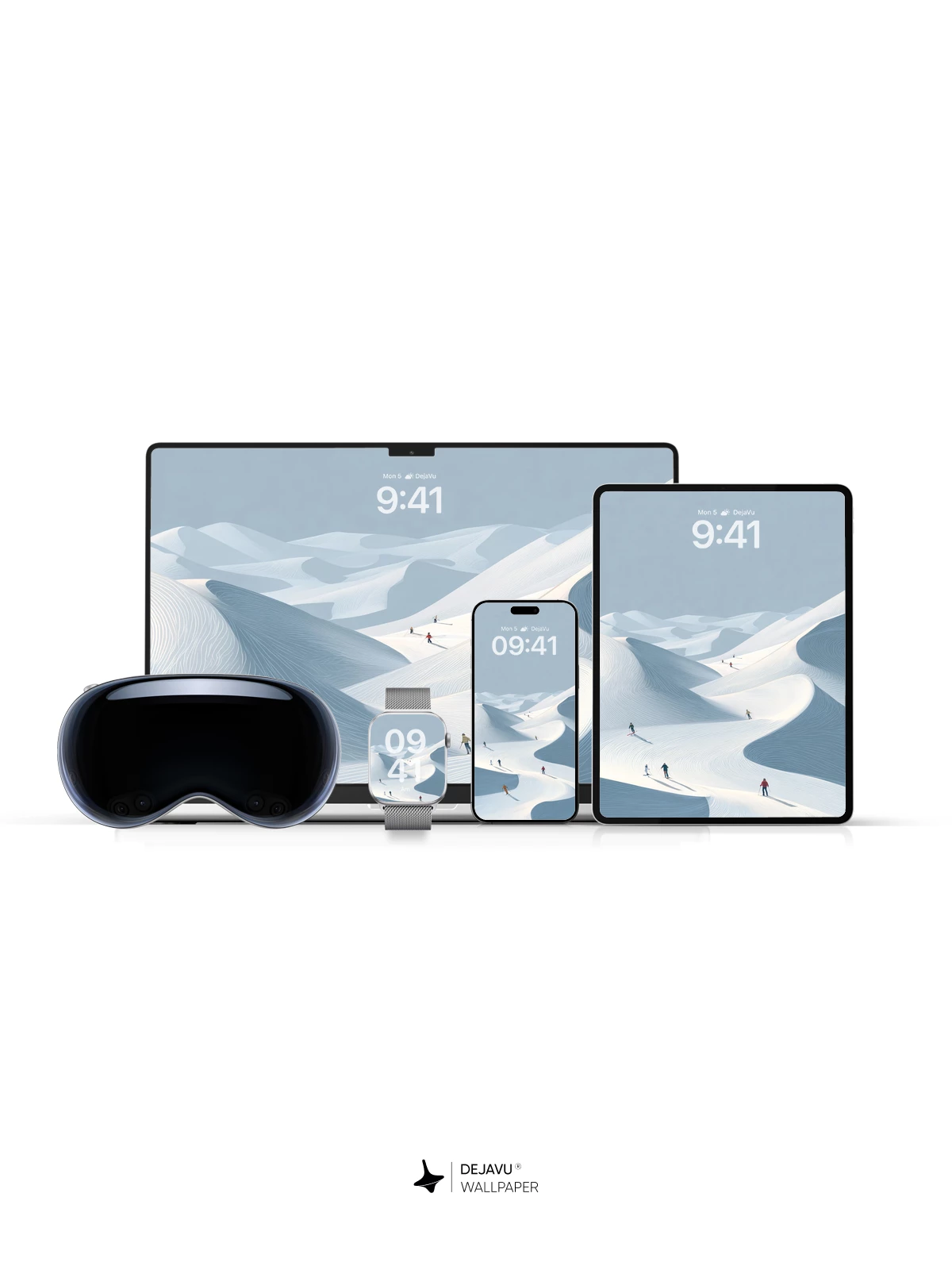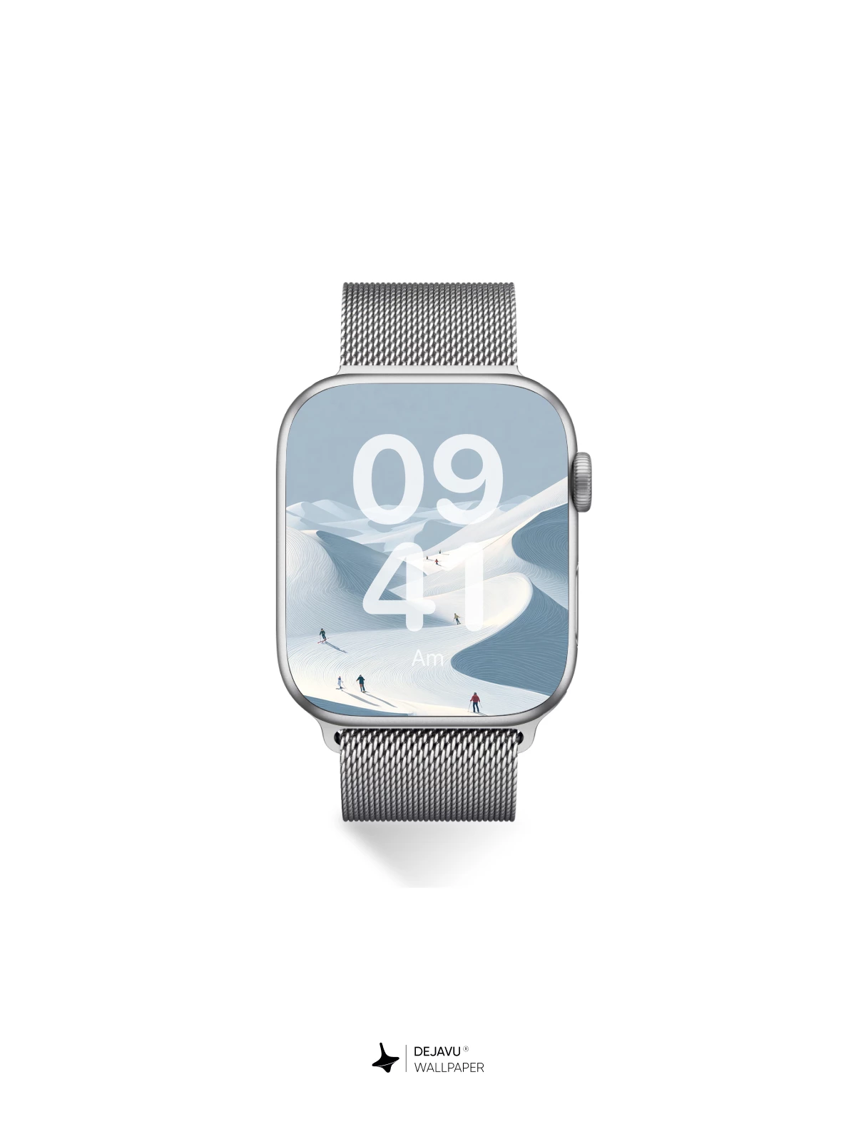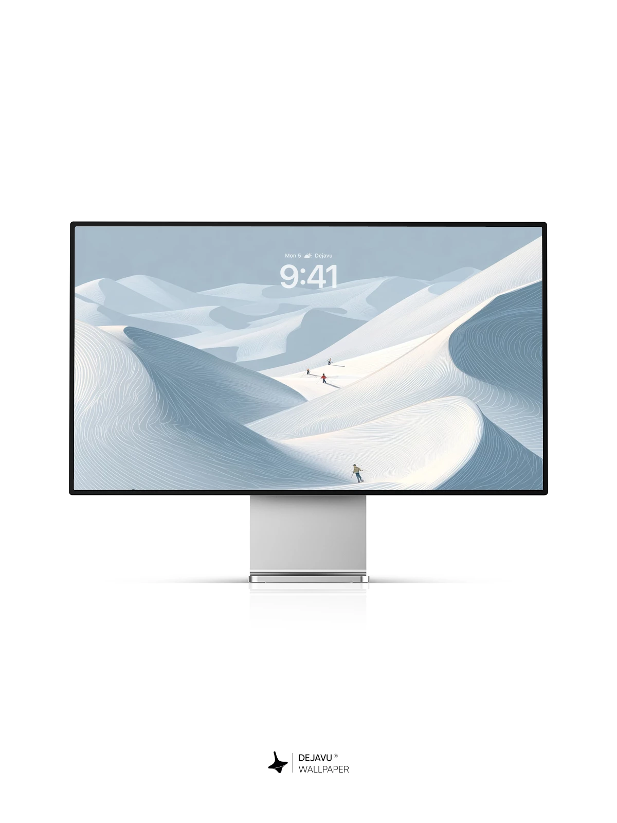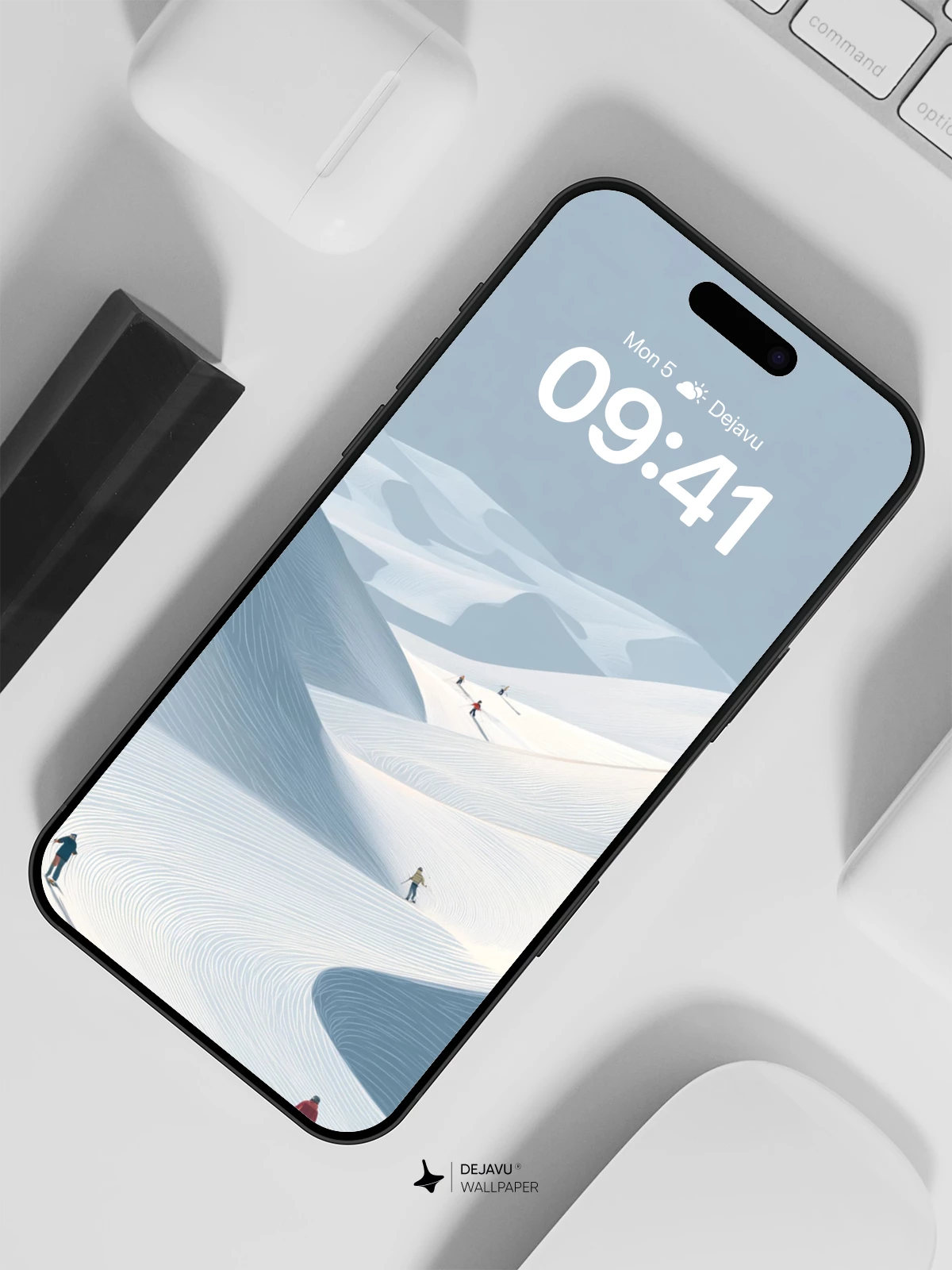 This stunning 8K wallpaper captures a dreamlike alpine landscape of smooth, wave-like snow dunes sculpted by wind and light. Inspired by the minimalist elegance of modern design, it features skiers traversing the pristine terrain, their colorful silhouettes adding subtle contrast to the cool palette. The image evokes a sense of calm solitude and timeless motion, ideal for iPhone, Android, or tablet screens seeking a peaceful, artistic backdrop. With its flowing contours and soft shadows, it transforms any device into a window to a serene winter realm.