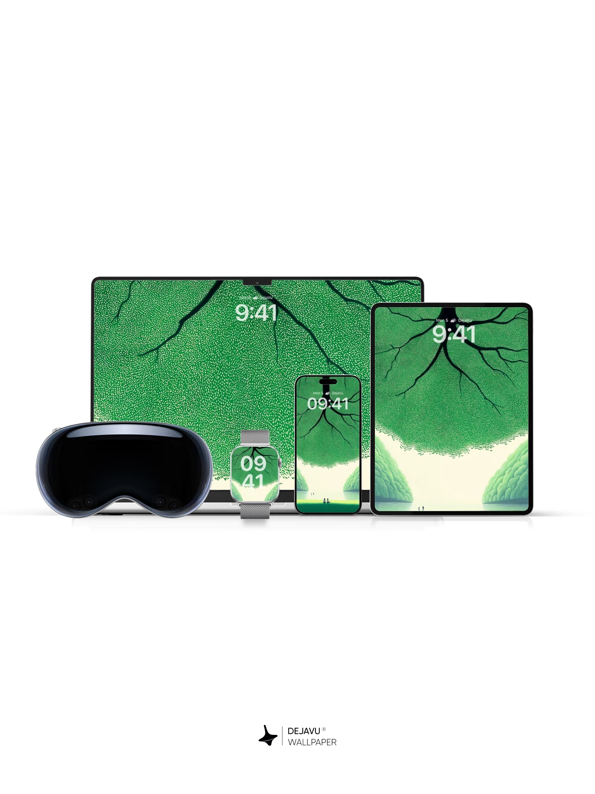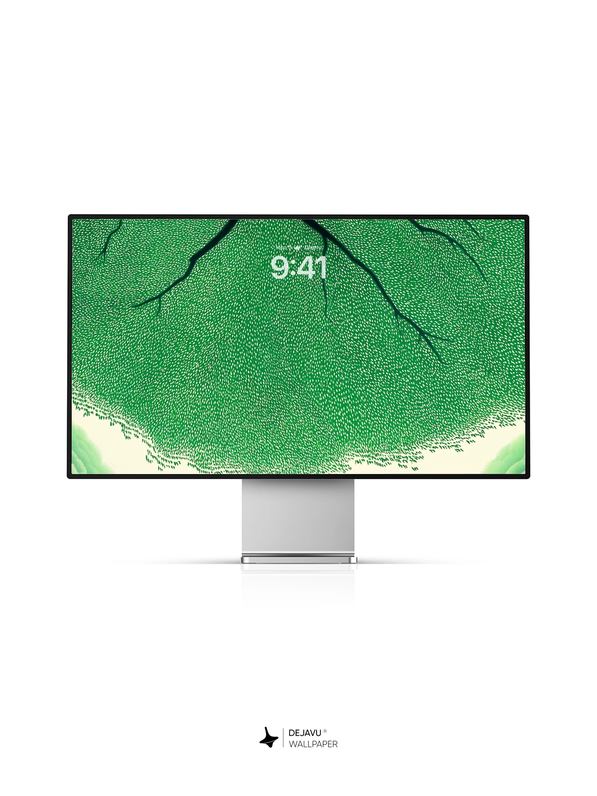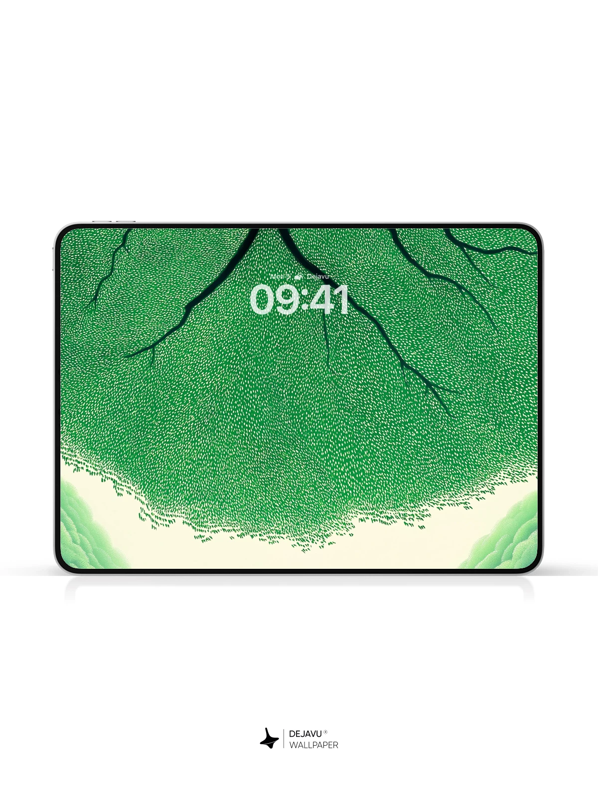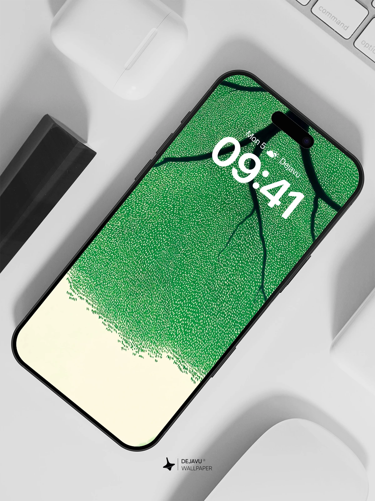 This mesmerizing 8K wallpaper captures a surreal landscape where a massive, leafy tree forms a natural dome over a serene lake, flanked by rolling green hills. Inspired by dreamlike environmental art, the image evokes a sense of peace and timeless connection to nature. Two small figures sit in contemplation at the water’s edge, emphasizing scale and solitude. Ideal for iPhone, Android, and tablets, this high-resolution design brings a touch of ethereal beauty to any mobile device.