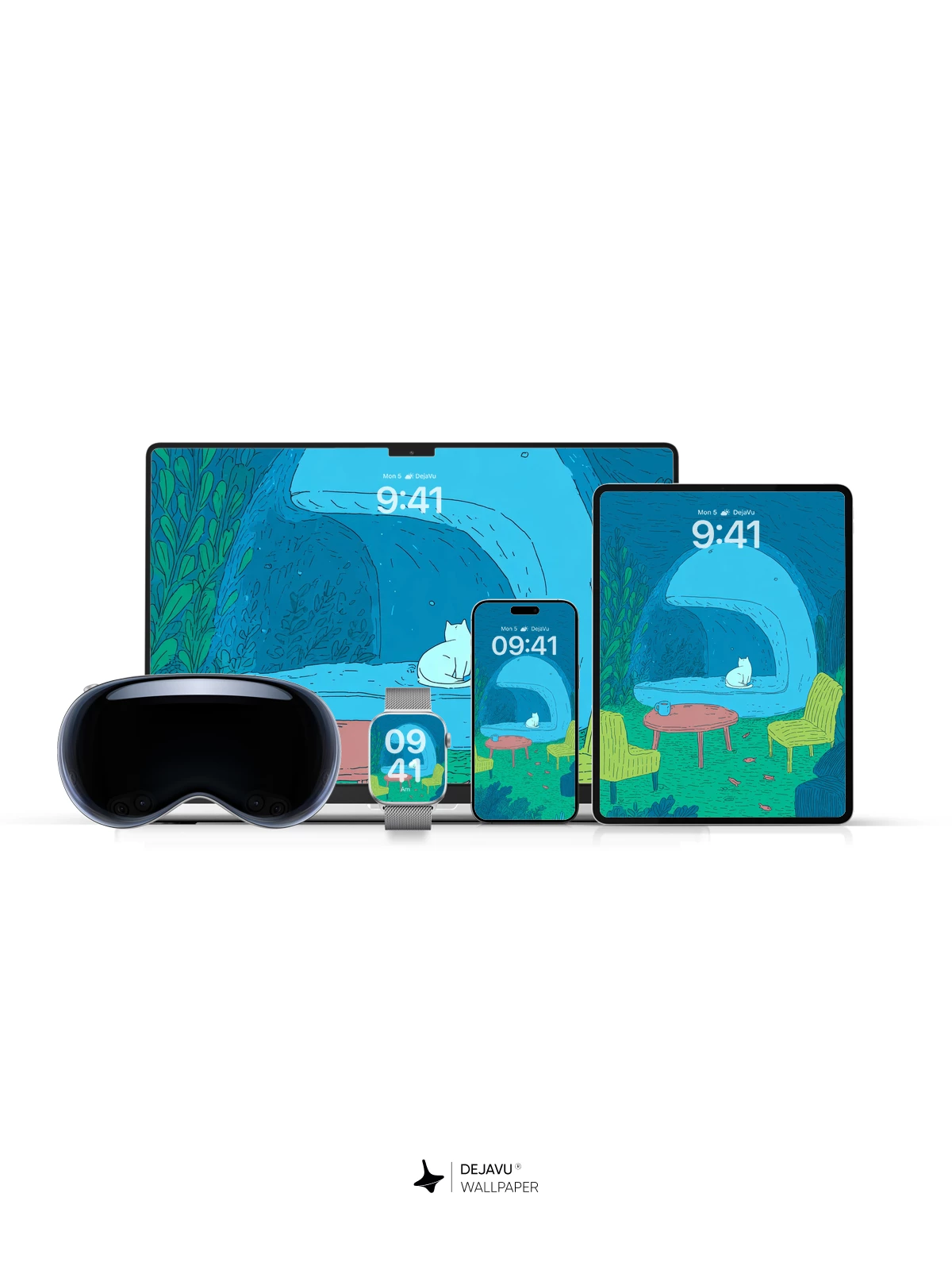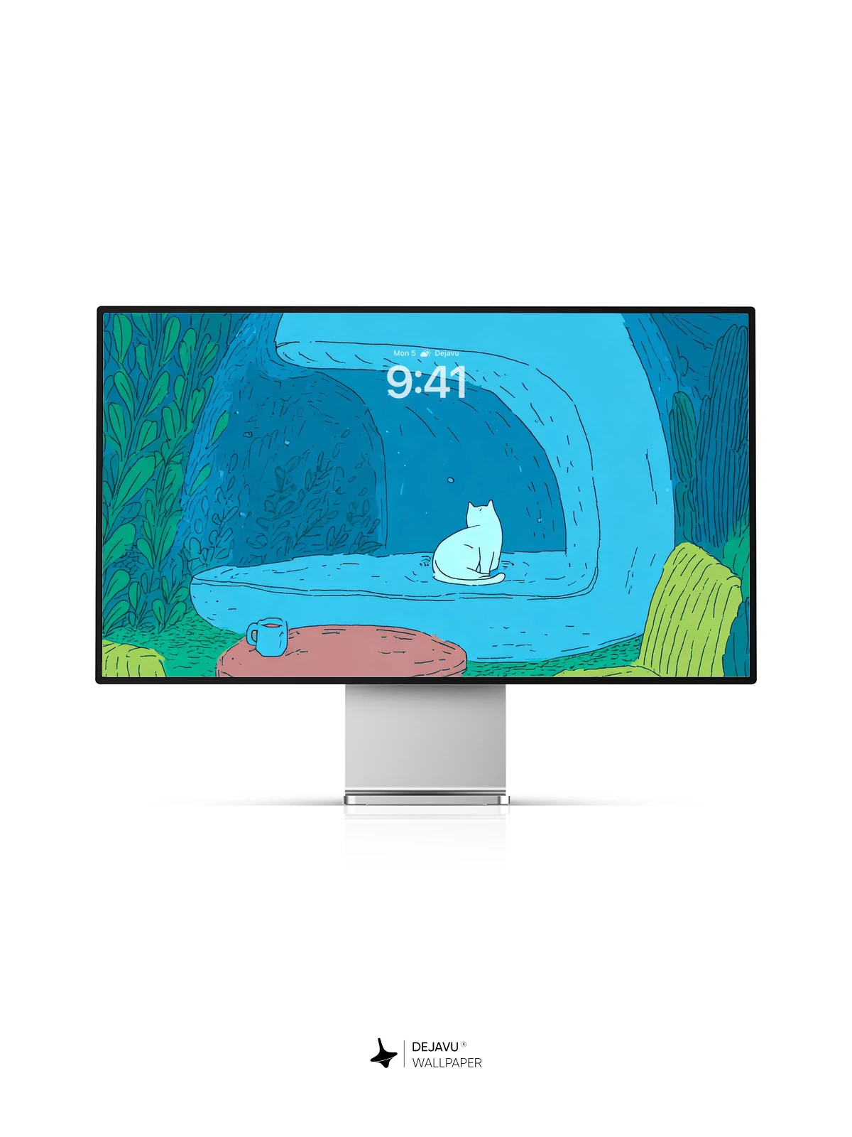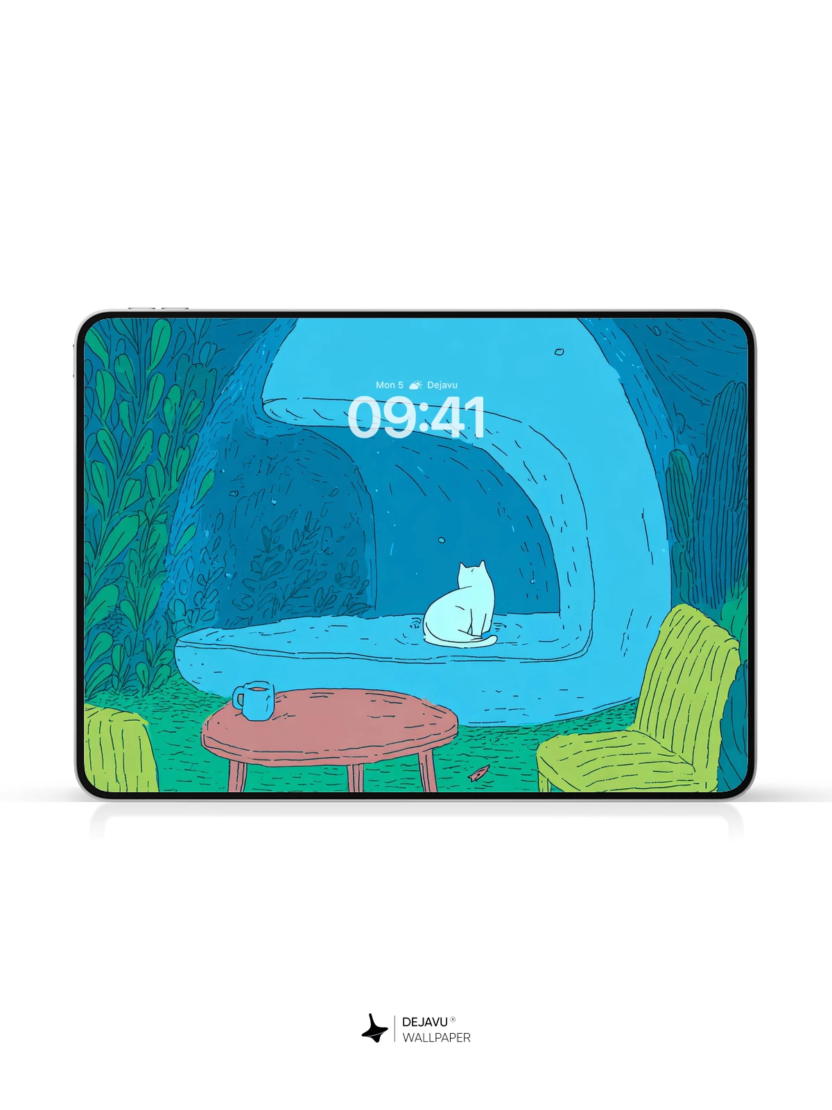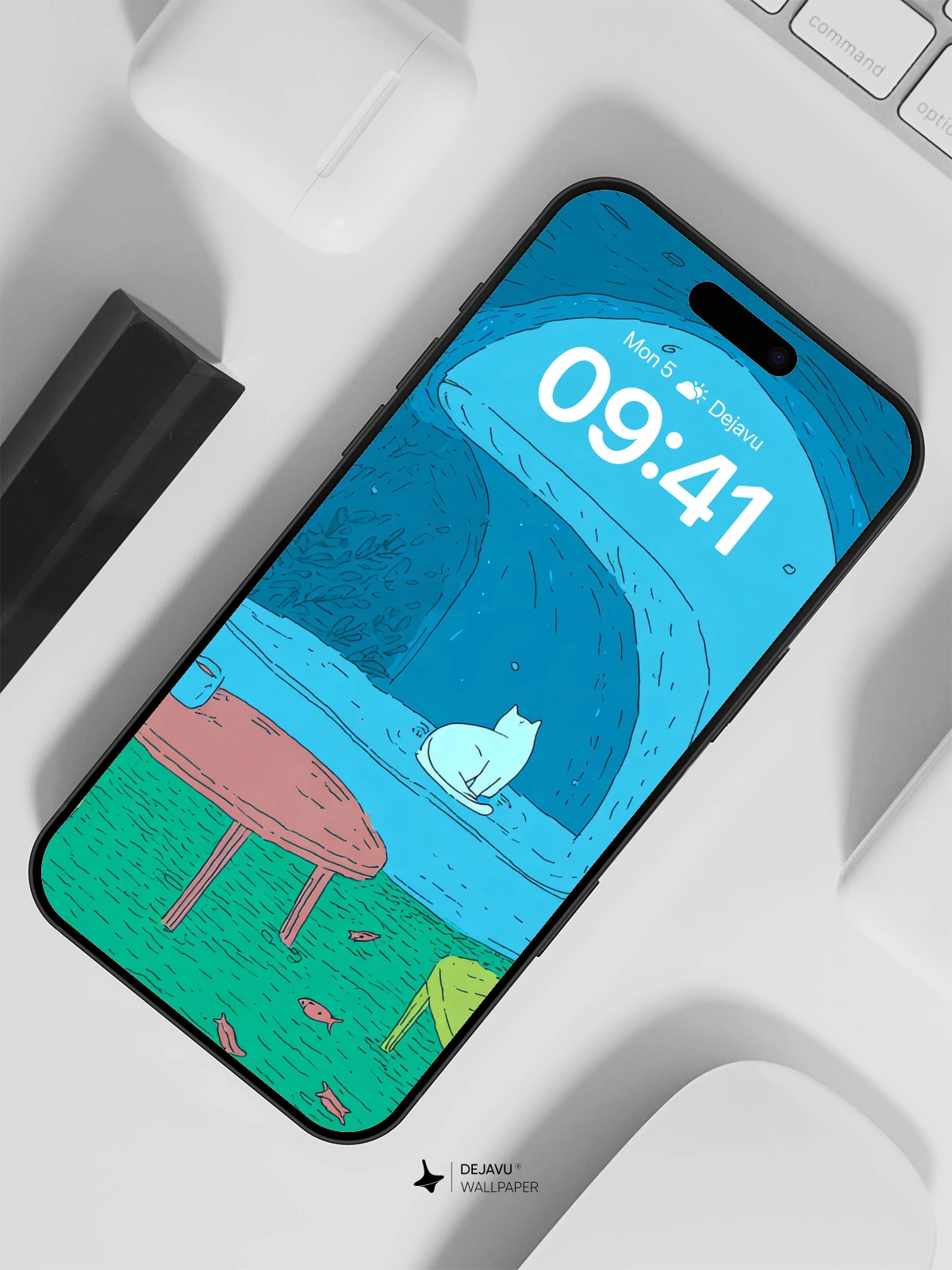 Immerse yourself in this whimsical underwater scene where a serene white cat rests inside a luminous blue igloo, nestled among lush aquatic plants and scattered fish. The surreal atmosphere evokes a sense of quiet wonder and mystical calm, blending fantasy and nature in a vivid, hand-drawn style. Ideal for iPhone, Android, and tablets, this 8K wallpaper transforms your device into a portal to an enchanted ocean realm.