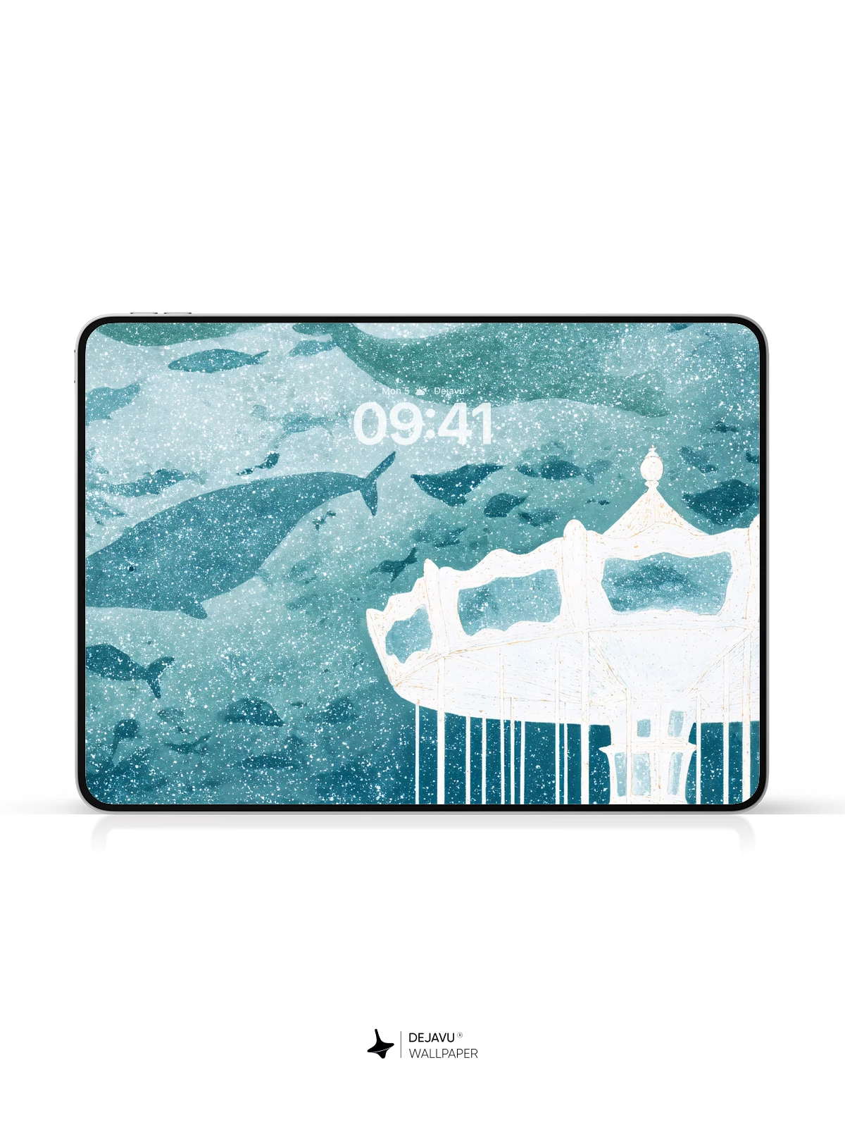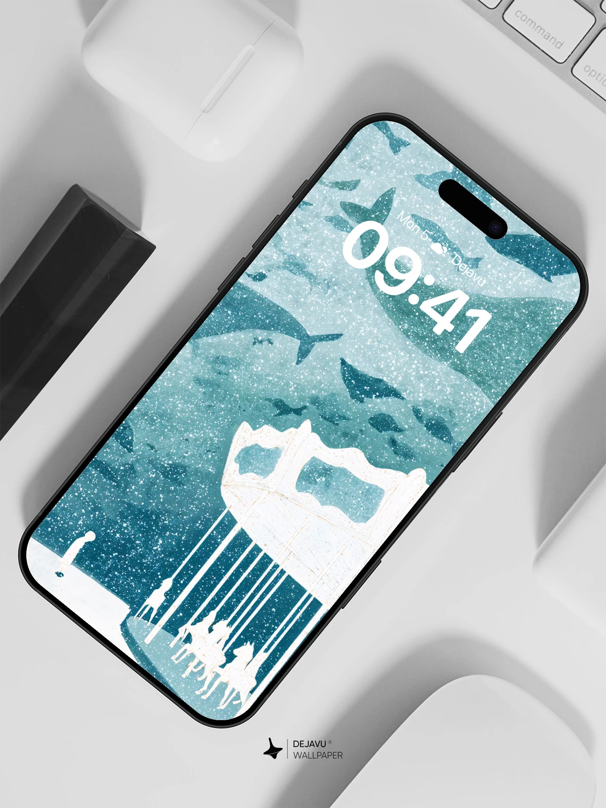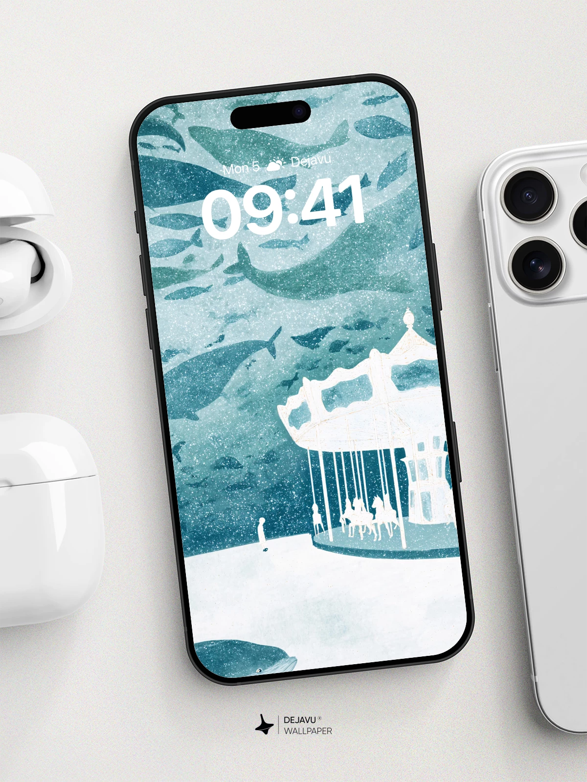 This surreal illustration blends the whimsy of a vintage carousel with the vast mystery of the ocean, as whales swim through a snowy sky above a frozen landscape. The ethereal blue palette and delicate snowflakes evoke a sense of quiet wonder, making it ideal as an 8K wallpaper for iPhone, Android, or any mobile device. Inspired by dreamlike narratives and poetic imagery, this artwork captures the magic of imagination meeting nature, perfect for those who love fantasy and visual storytelling on their screens.