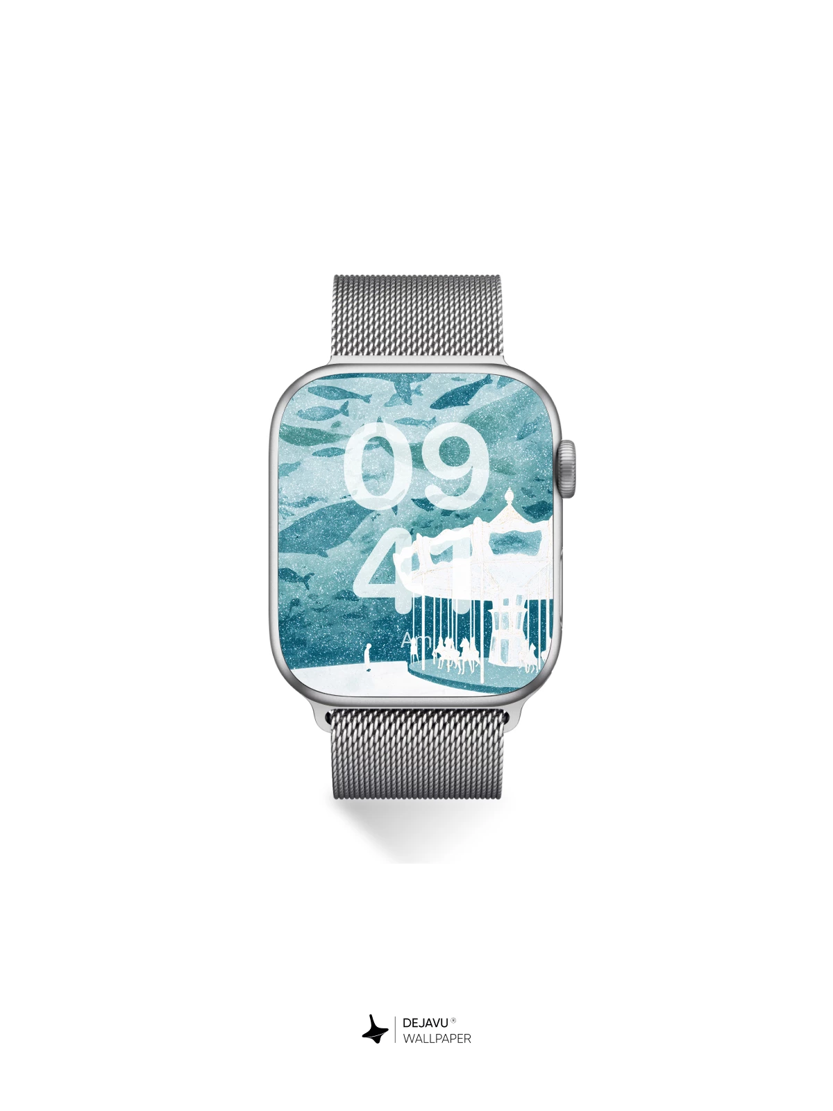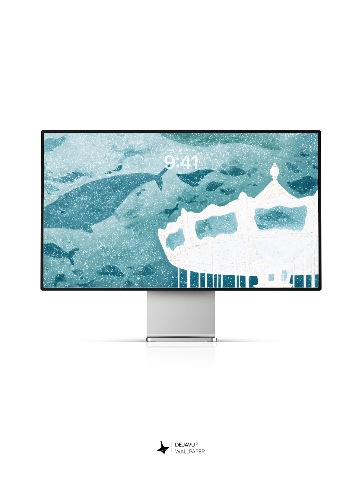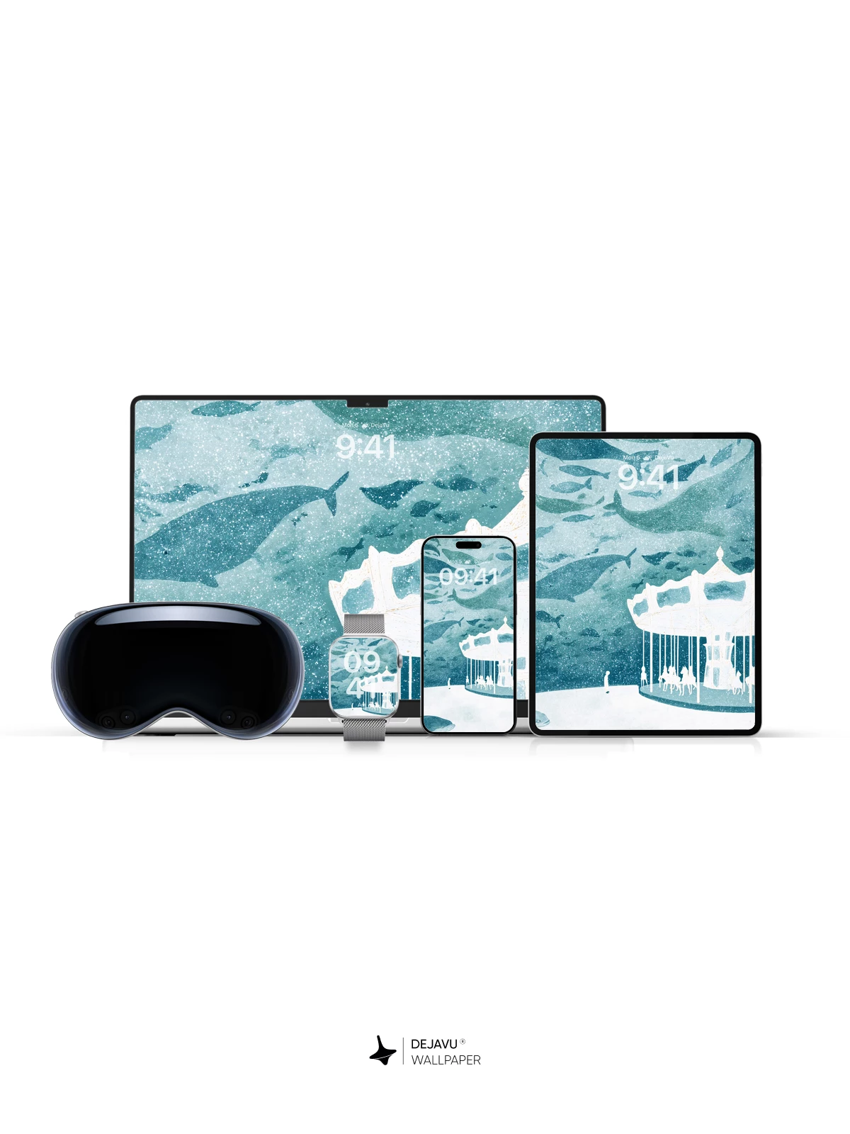 This surreal illustration blends the whimsy of a vintage carousel with the vast mystery of the ocean, as whales swim through a snowy sky above a frozen landscape. The ethereal blue palette and delicate snowflakes evoke a sense of quiet wonder, making it ideal as an 8K wallpaper for iPhone, Android, or any mobile device. Inspired by dreamlike narratives and poetic imagery, this artwork captures the magic of imagination meeting nature, perfect for those who love fantasy and visual storytelling on their screens.