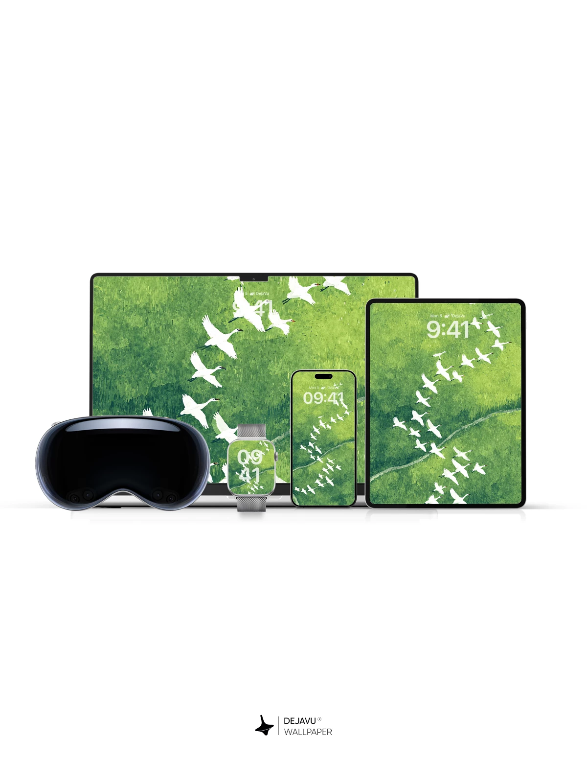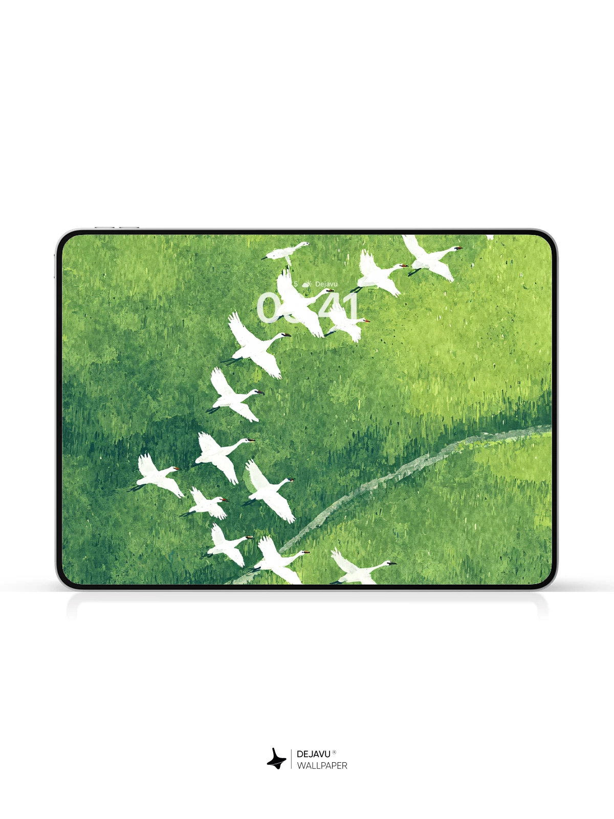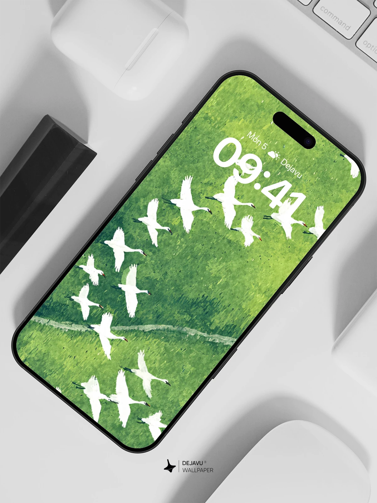 This breathtaking 8K wallpaper captures a graceful flock of white cranes soaring in elegant formation across a vibrant green landscape, evoking a sense of harmony and natural rhythm. Inspired by the poetic elegance of traditional East Asian art, the image blends movement and stillness in a tranquil composition that brings calm to any device screen. Ideal for iPhone, Android, and tablets, this high-resolution artwork transforms your mobile background into a moment of peaceful contemplation.