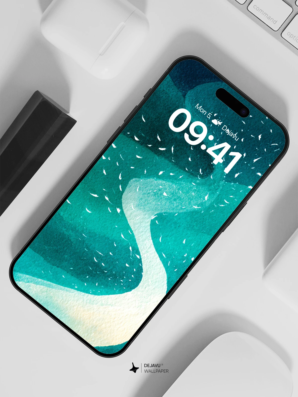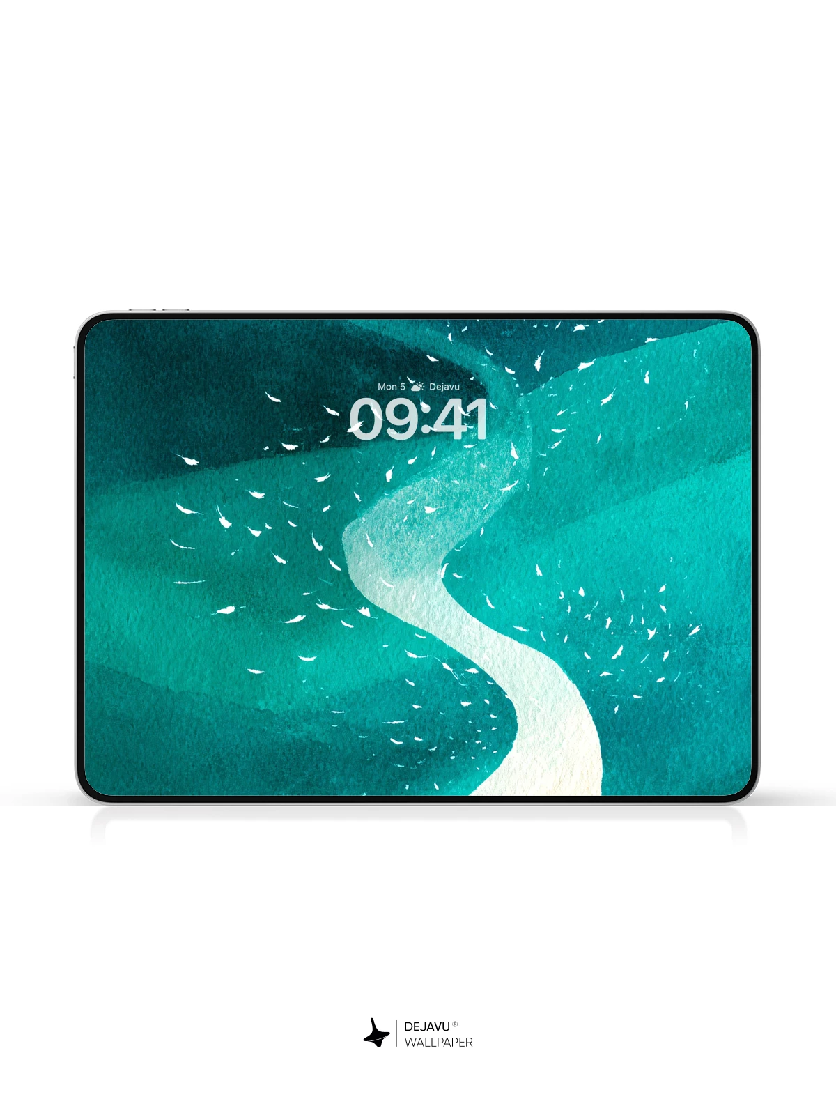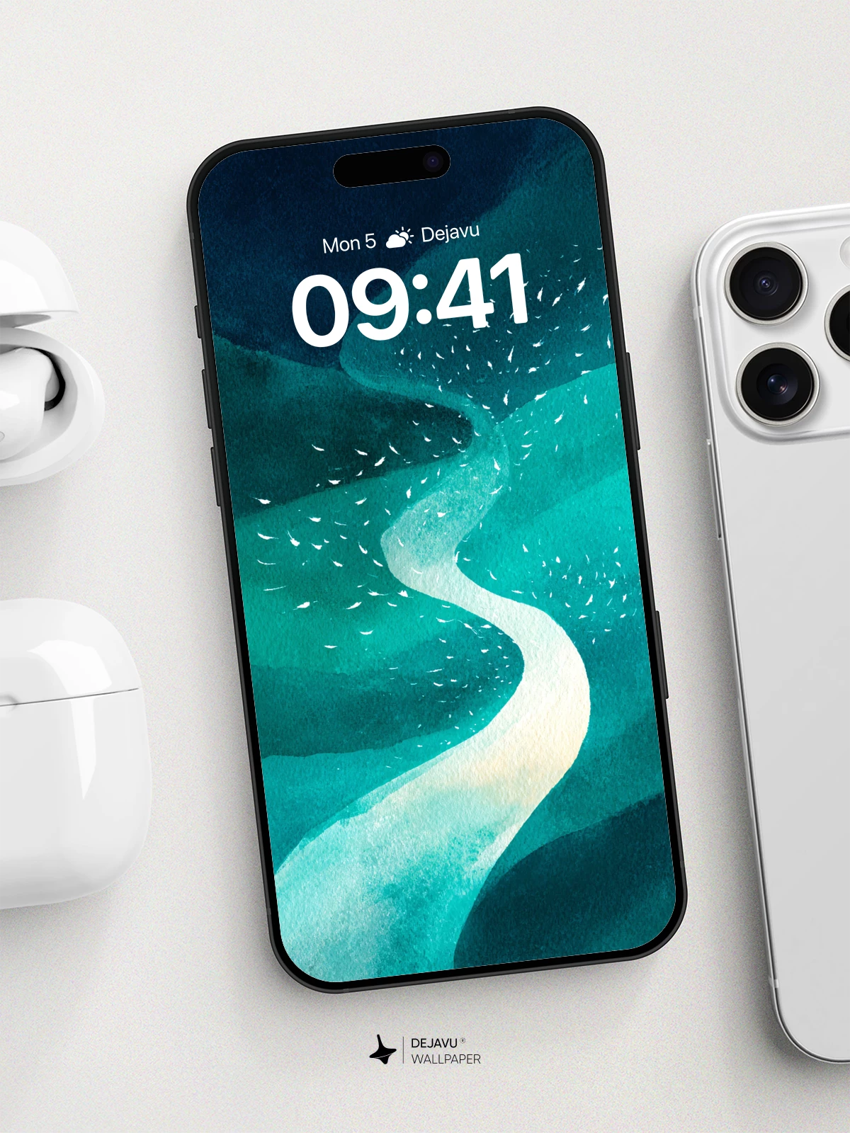 This wallpaper features a soothing abstract river motif in shades of teal, accented by scattered white speckles resembling gentle ripples. The fluid composition evokes a sense of calm and movement, making it ideal for personalizing your iPhone, Android, or tablet screen with a touch of modern elegance.