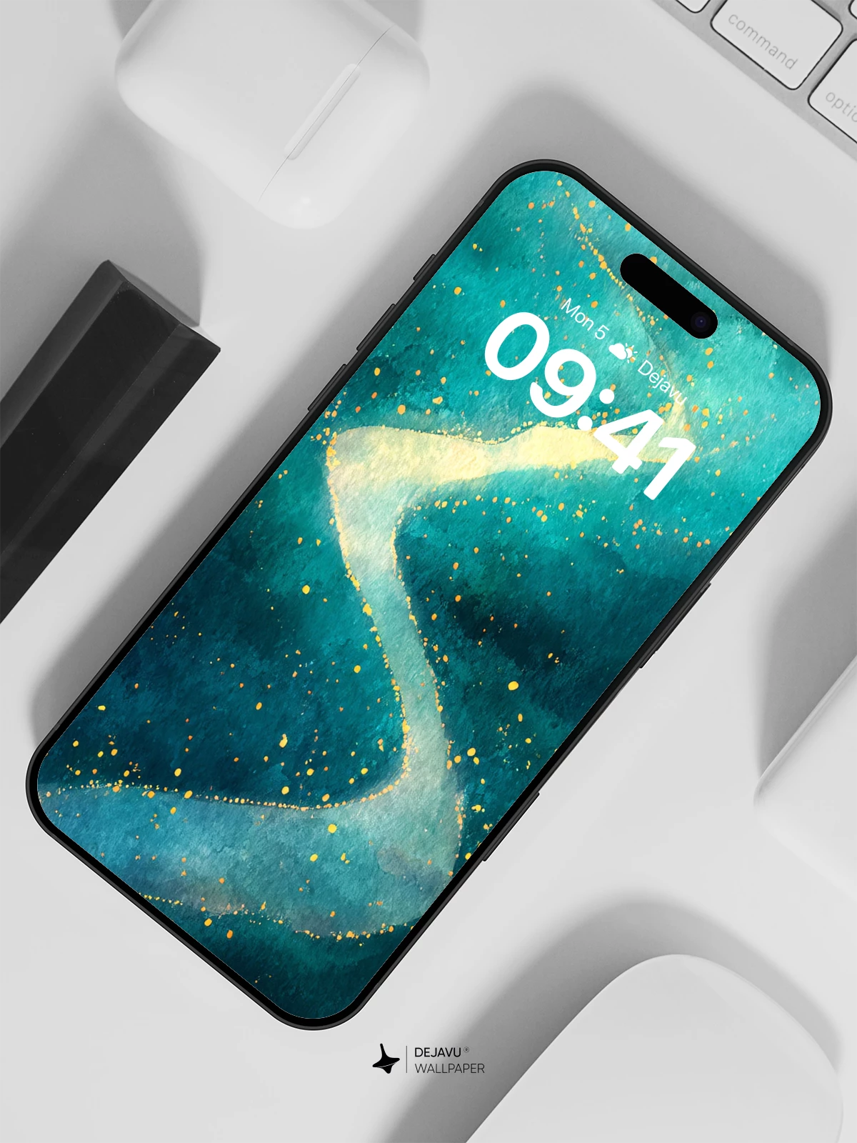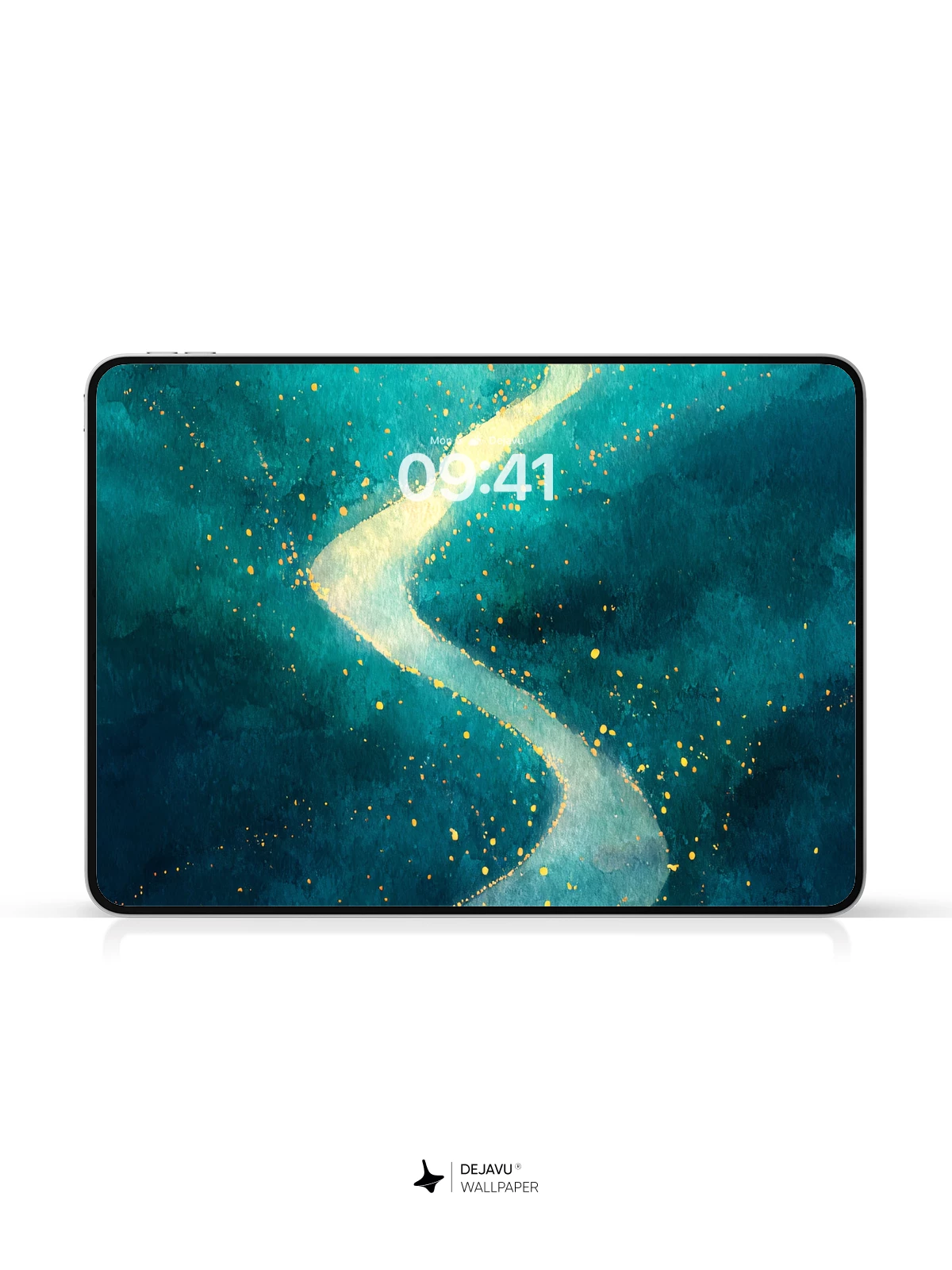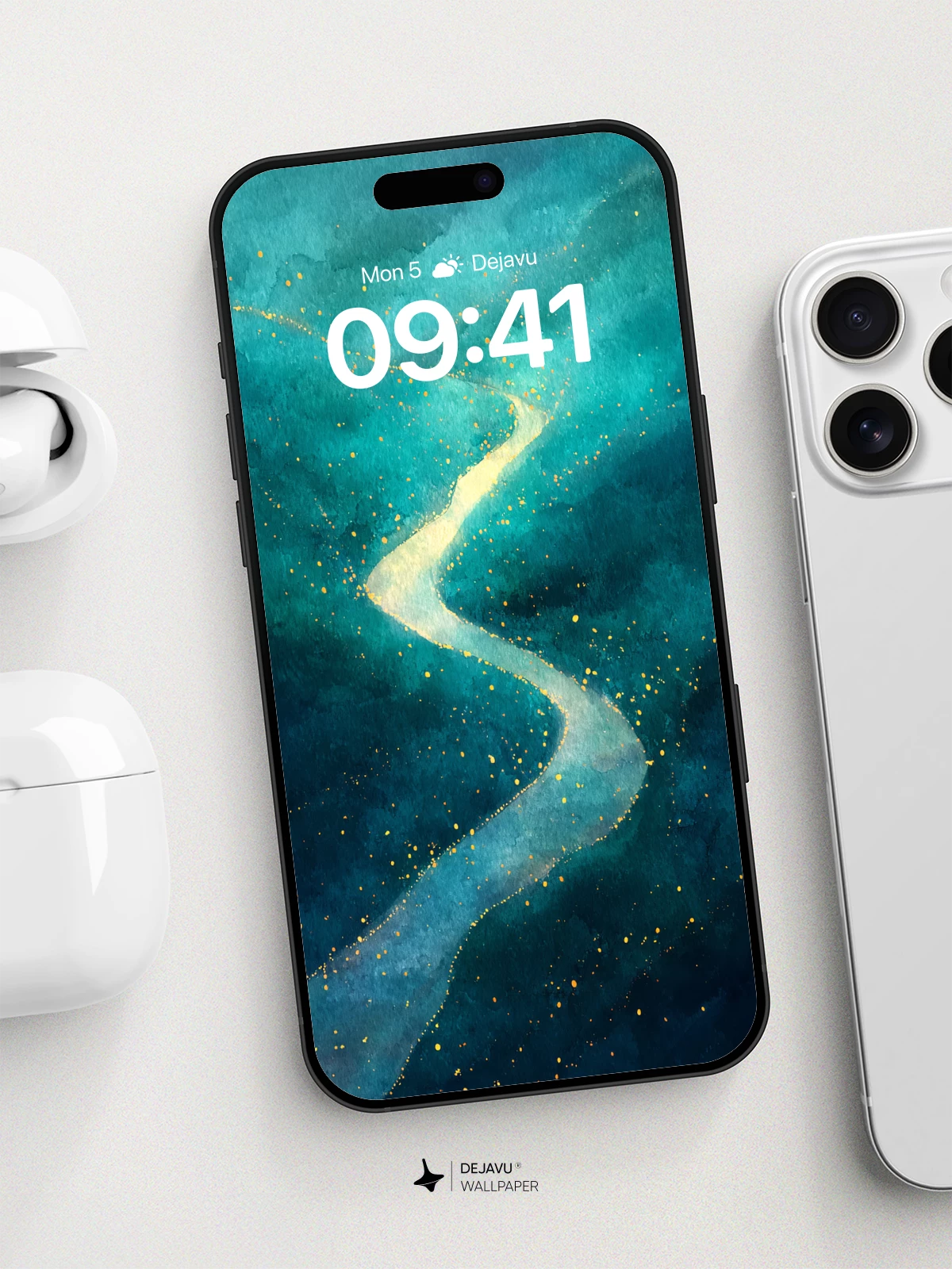 This wallpaper features a serene teal watercolor path adorned with shimmering gold specks, creating a tranquil and enchanting atmosphere. The design is ideal for adding a touch of elegance to your iPhone, Android, or tablet screen.