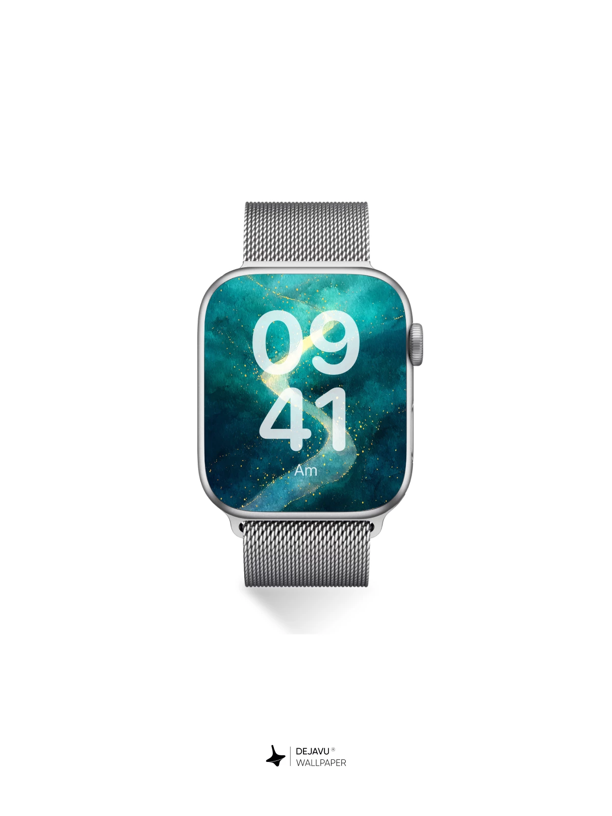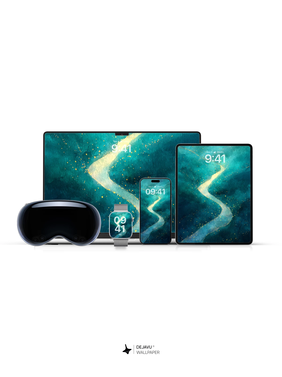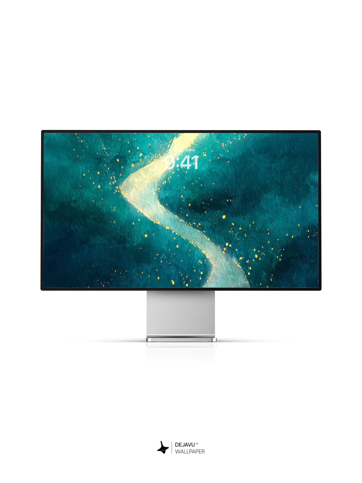 This wallpaper features a serene teal watercolor path adorned with shimmering gold specks, creating a tranquil and enchanting atmosphere. The design is ideal for adding a touch of elegance to your iPhone, Android, or tablet screen.