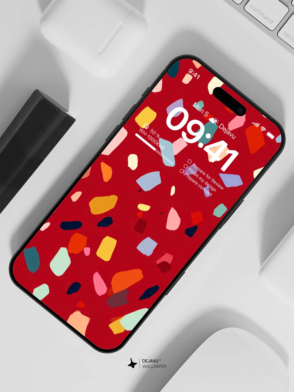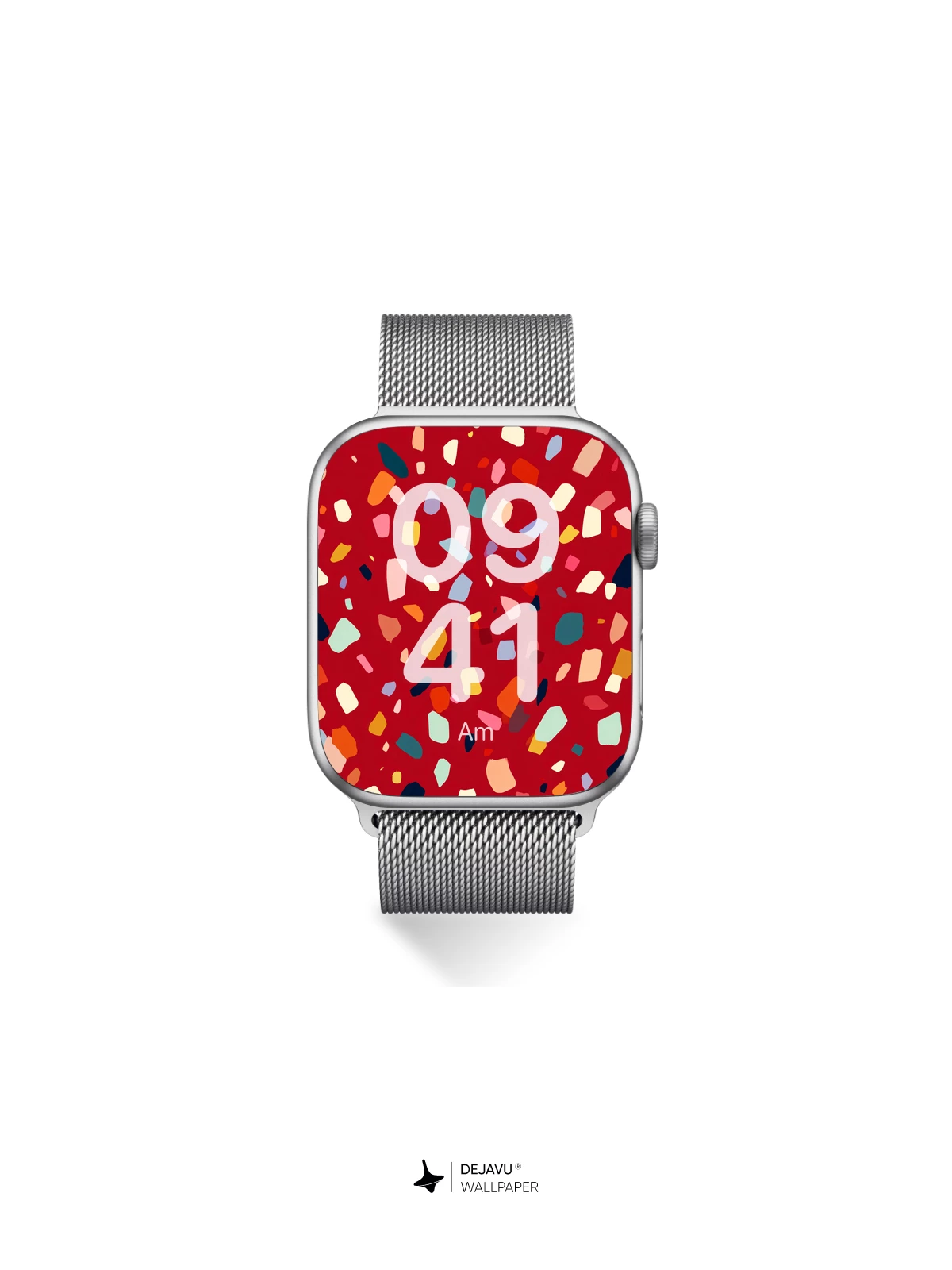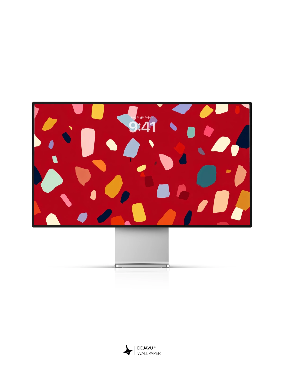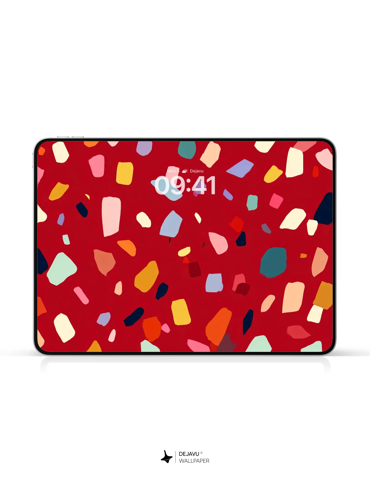 This 8K wallpaper features a rich red background dotted with playful pastel terrazzo fragments. Perfect for adding a touch of contemporary style to your iPhone, Android, or tablet.
