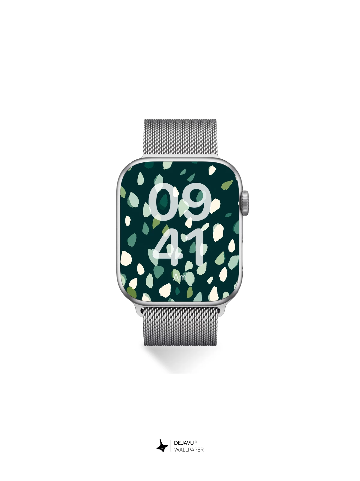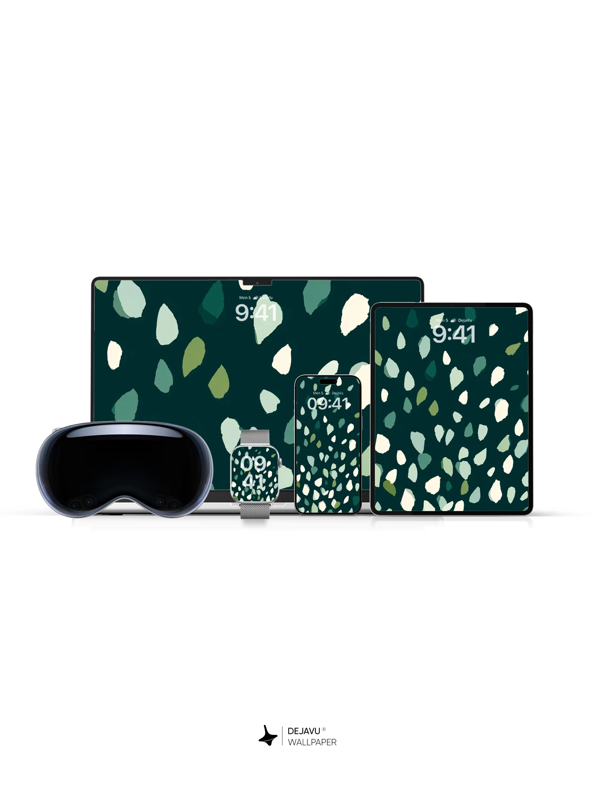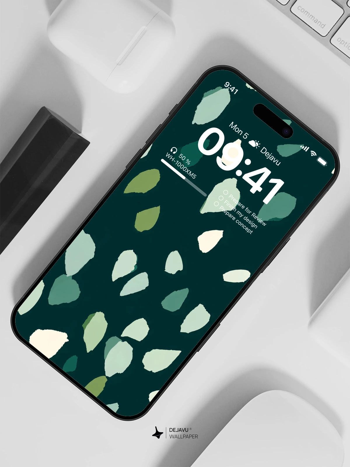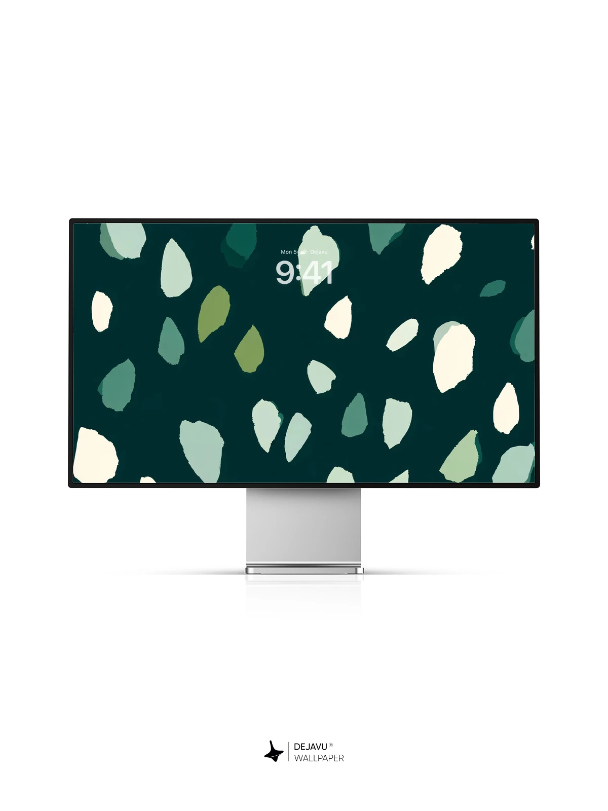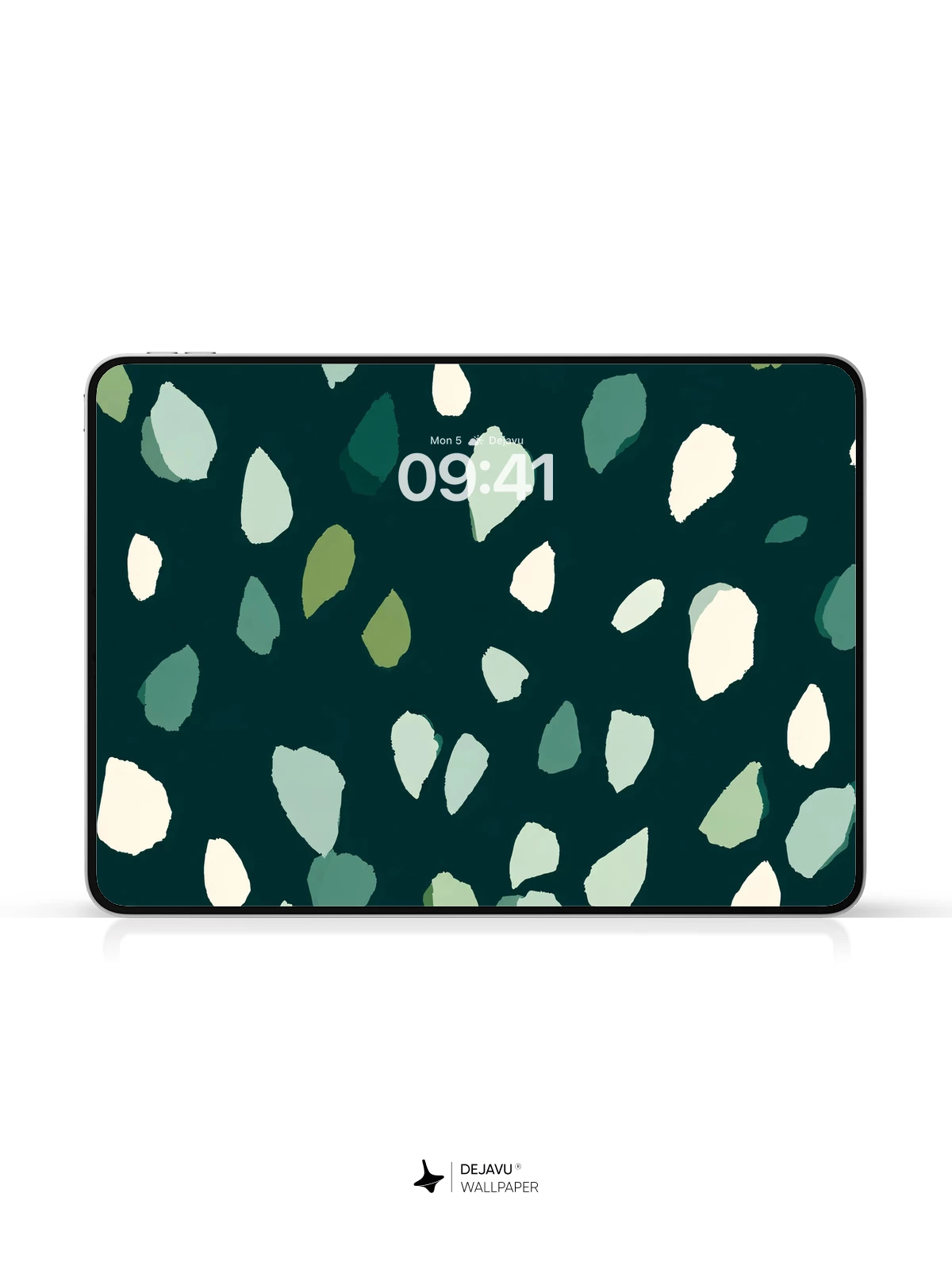 This terrazzo-inspired wallpaper features a dynamic mix of irregular, confetti-like shapes in muted greens and whites against a deep green background. Its abstract design offers a fresh, contemporary look that complements both iPhone and Android devices, as well as tablets. The subtle color palette ensures it remains stylish without overwhelming your screen.