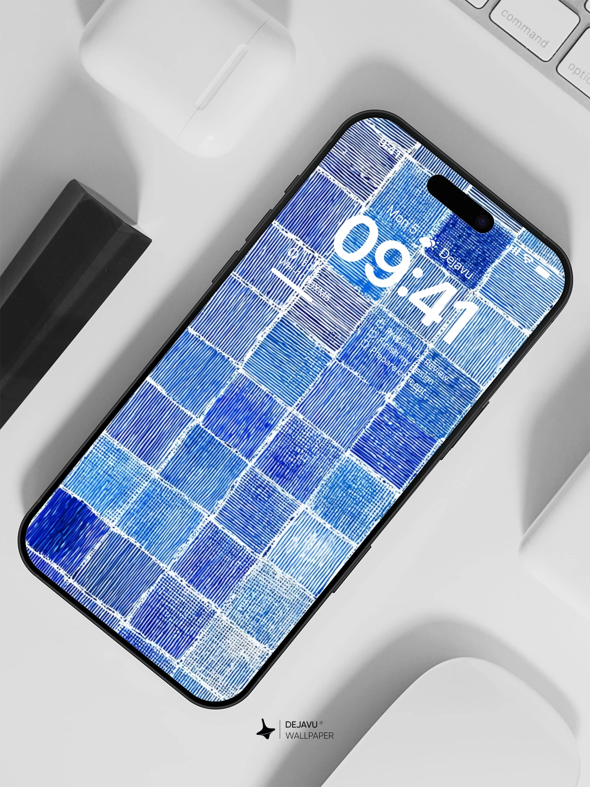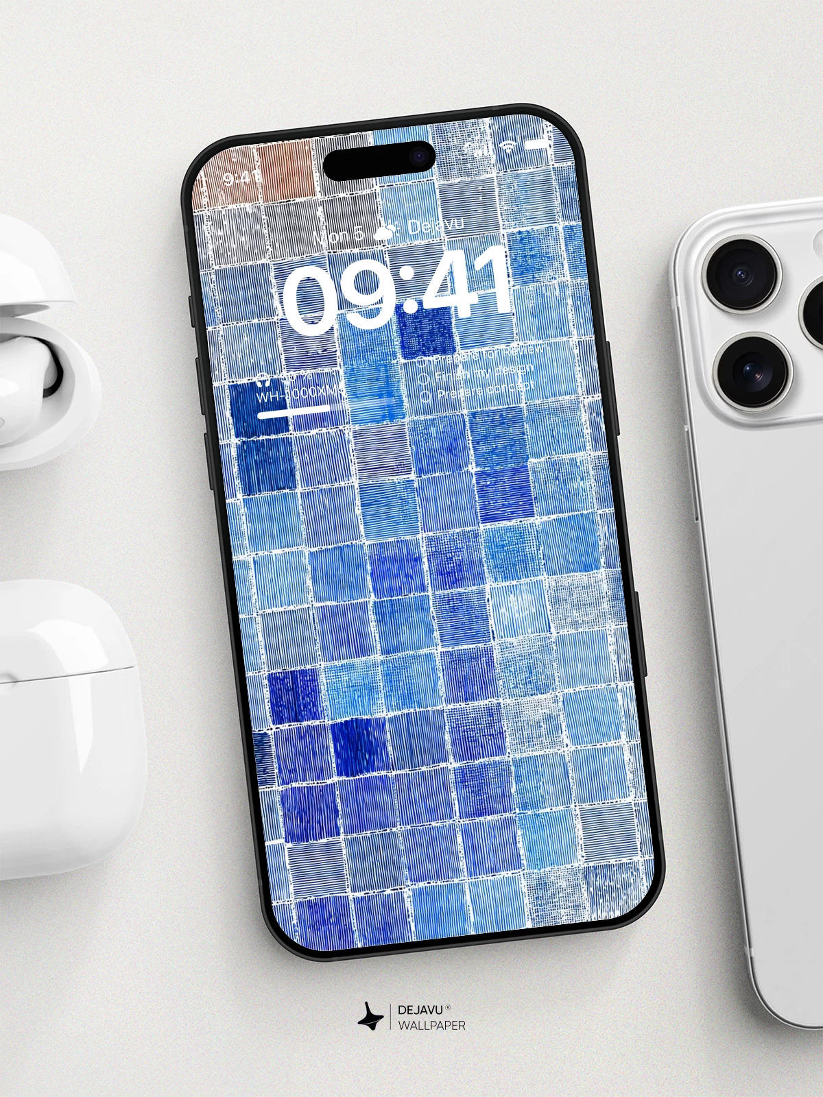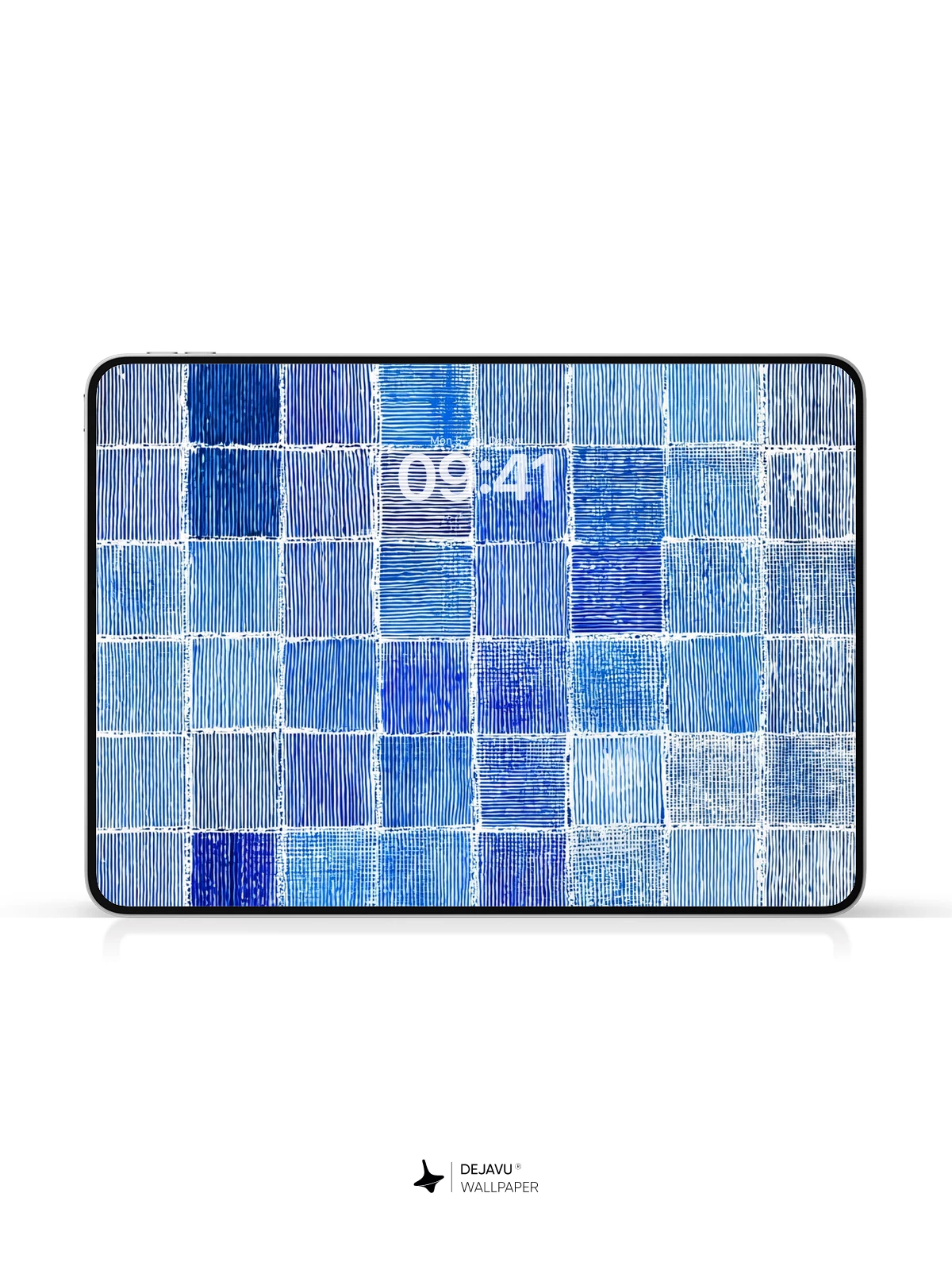 This wallpaper features a textured blue mosaic design, with each tile displaying unique shades of blue and subtle striations. The composition evokes a sense of tranquility, making it ideal for those seeking a soothing backdrop on their mobile devices. Compatible with iPhone, Android, and tablets, this high-resolution 8K image ensures crisp detail on any screen.
