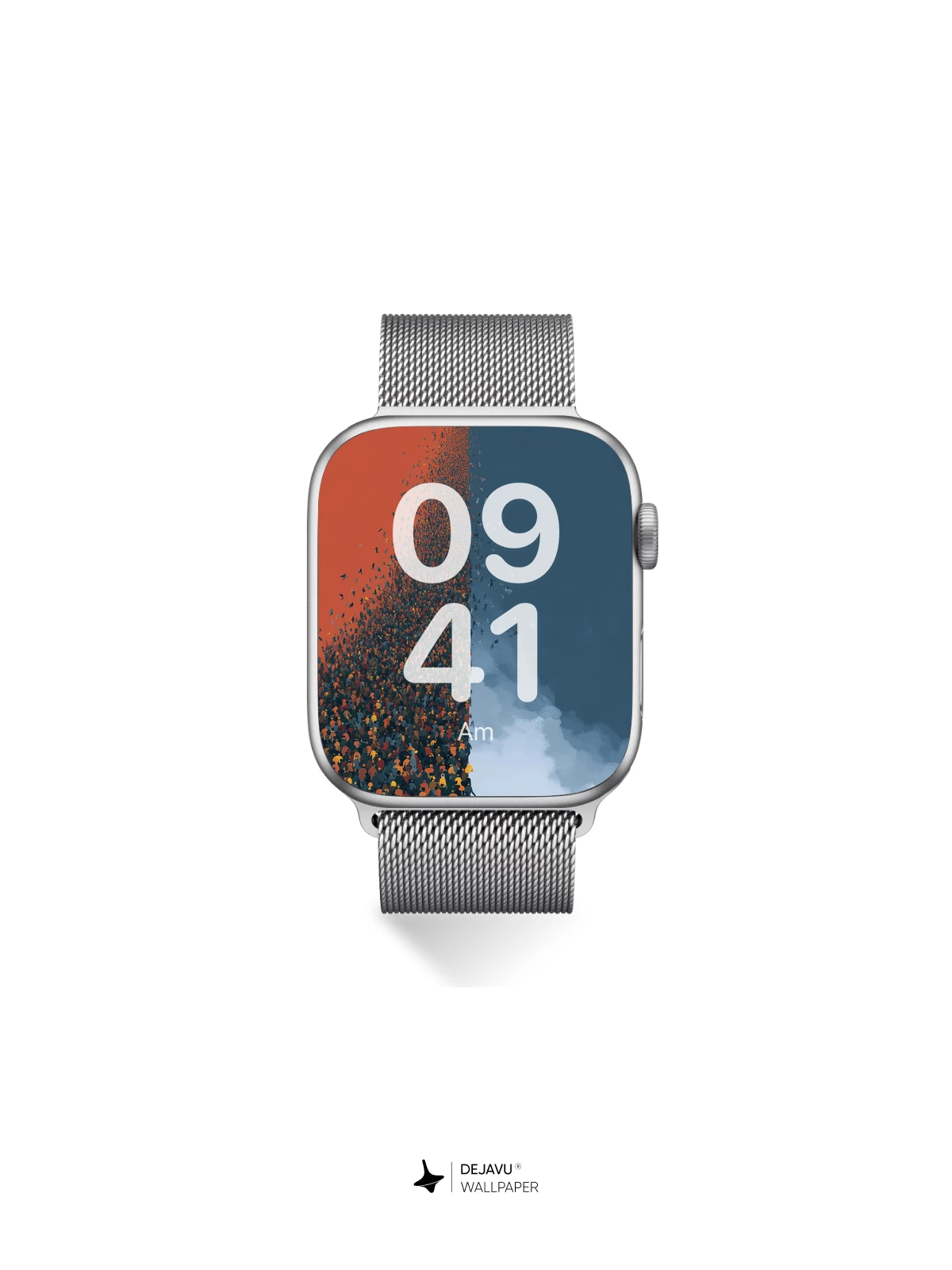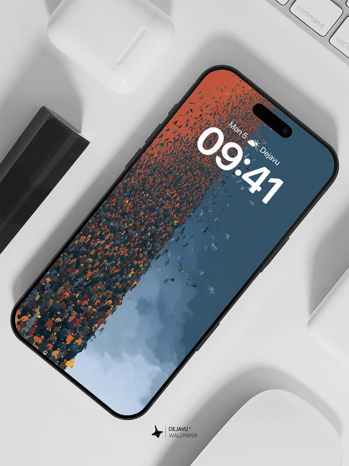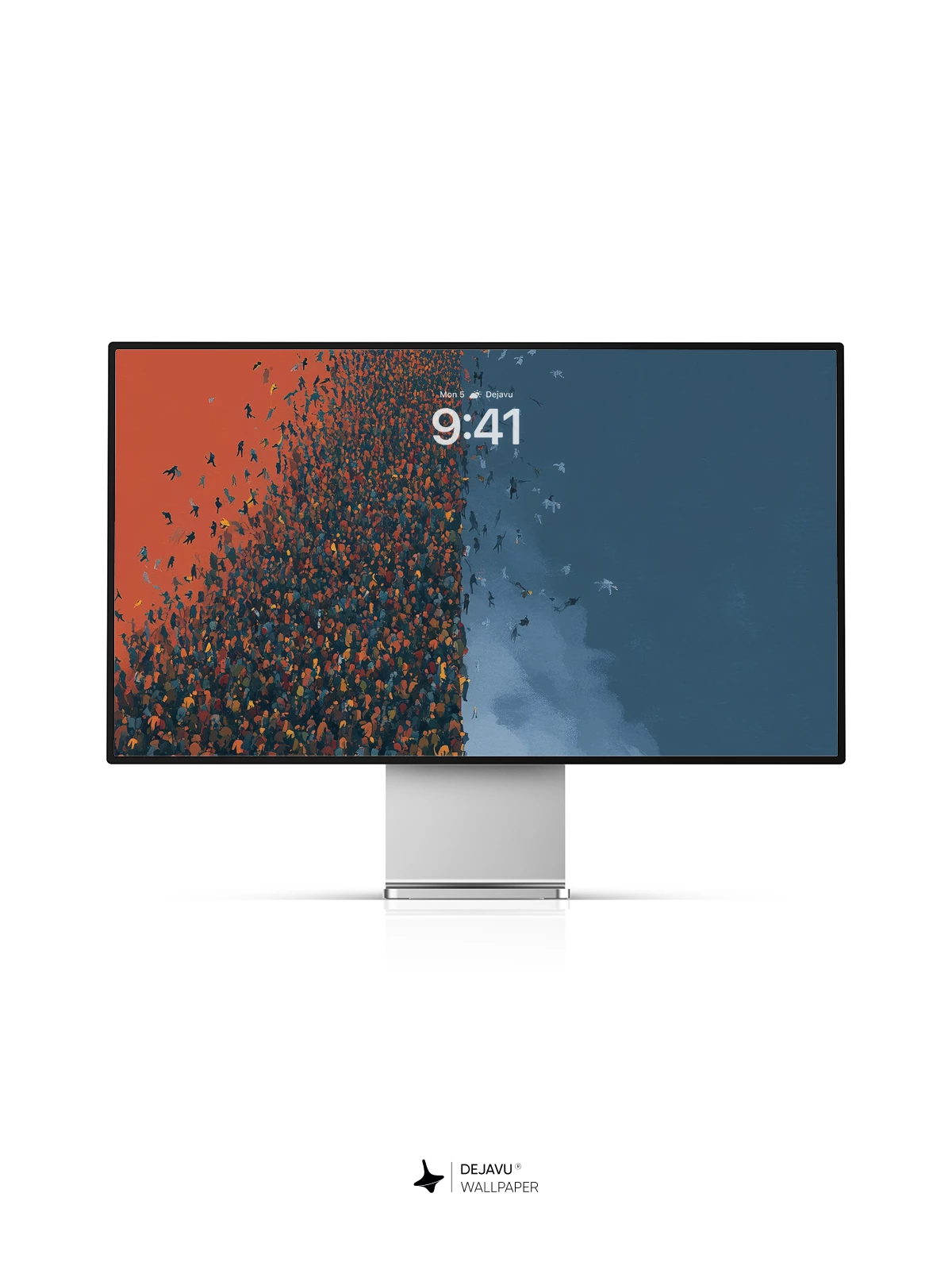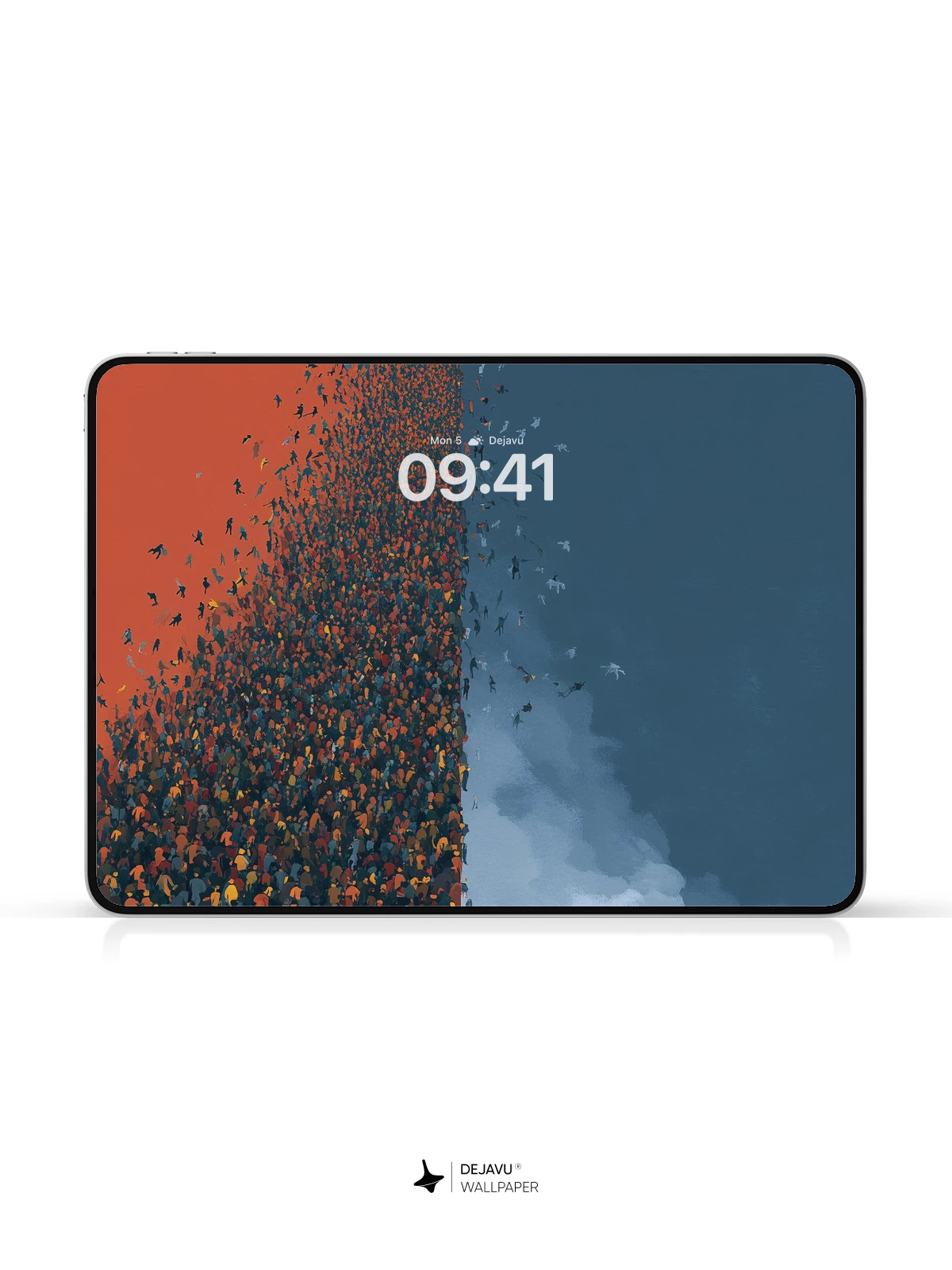 This 8K wallpaper captures a striking moment of solitude. A single person walks across a clean, pale floor, leaving behind a dense wall of people that dissolves into a warm, rust-colored sky. The right side opens into a cool, misty blue, creating a sharp visual contrast. Perfect for adding a touch of modern, narrative art to your iPhone, Android, or tablet screen.