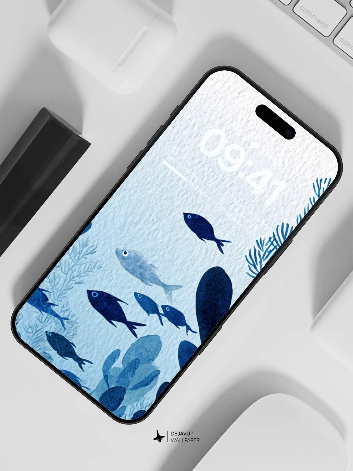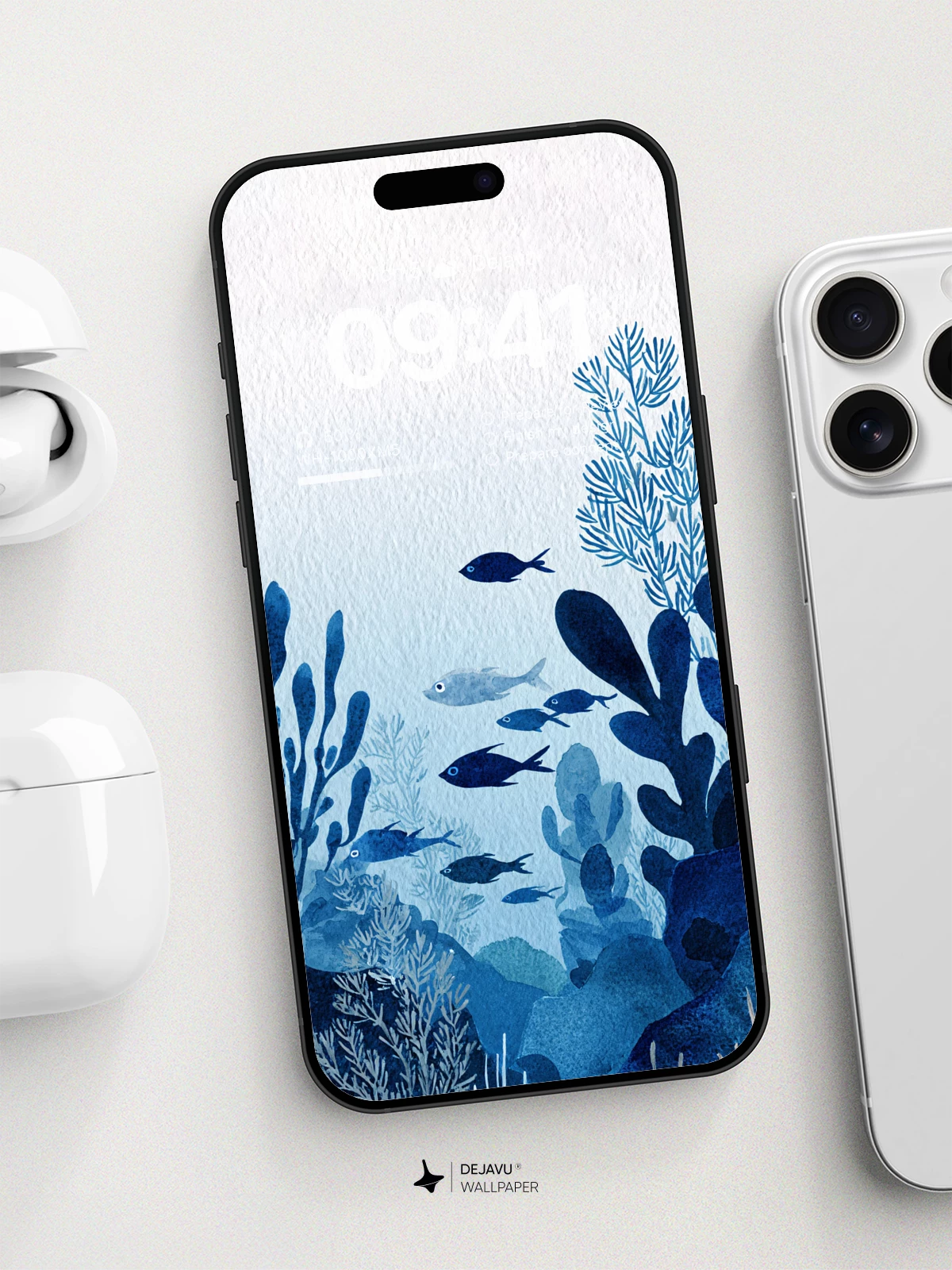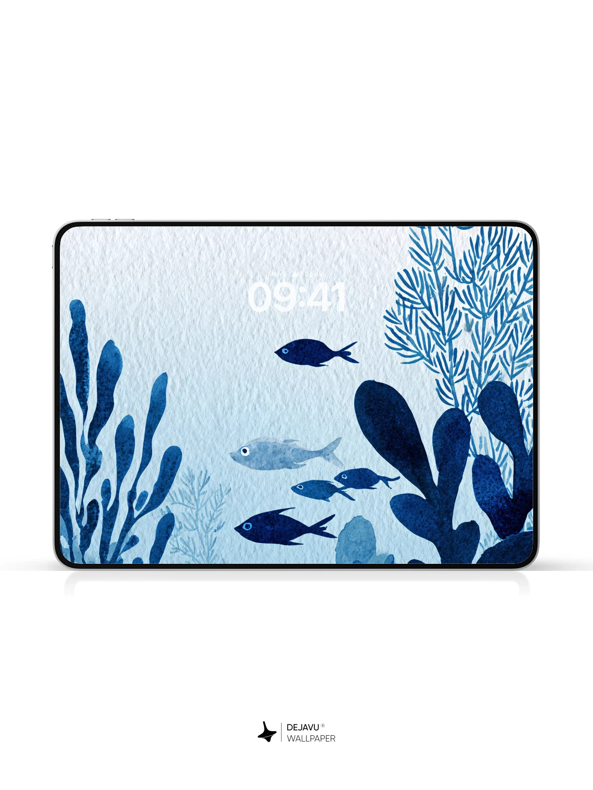 This serene underwater landscape, rendered in soothing shades of blue with a delicate watercolor technique, evokes the quiet beauty of ocean depths. Softly swaying seaweed and schools of fish glide through calm waters, creating a peaceful, dreamlike atmosphere ideal for digital backgrounds. The artwork’s gentle gradients and natural textures bring a calming presence to any screen—perfectly suited for iPhone, Android, or tablet use as a high-resolution 8K wallpaper.
