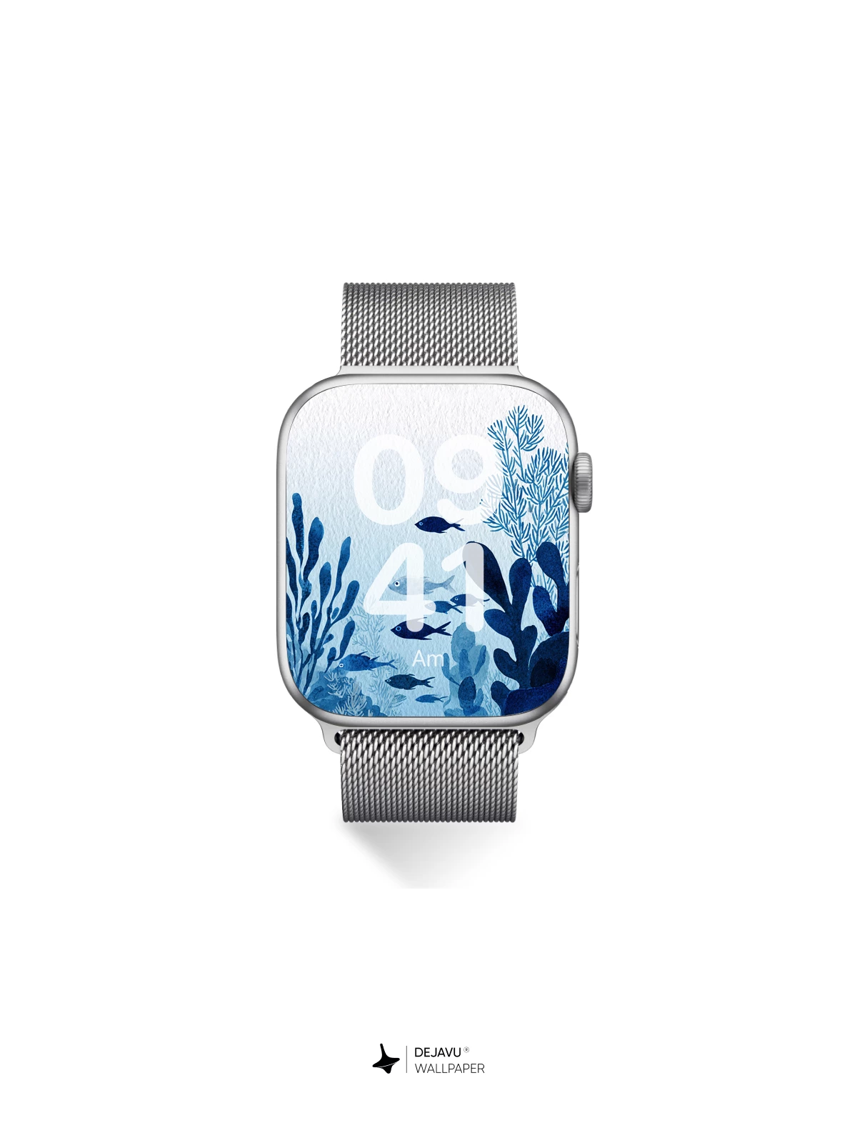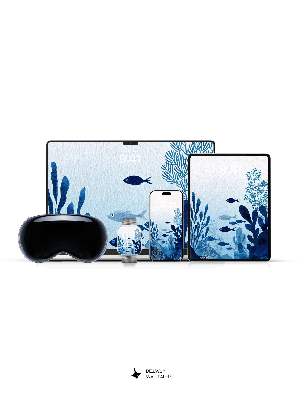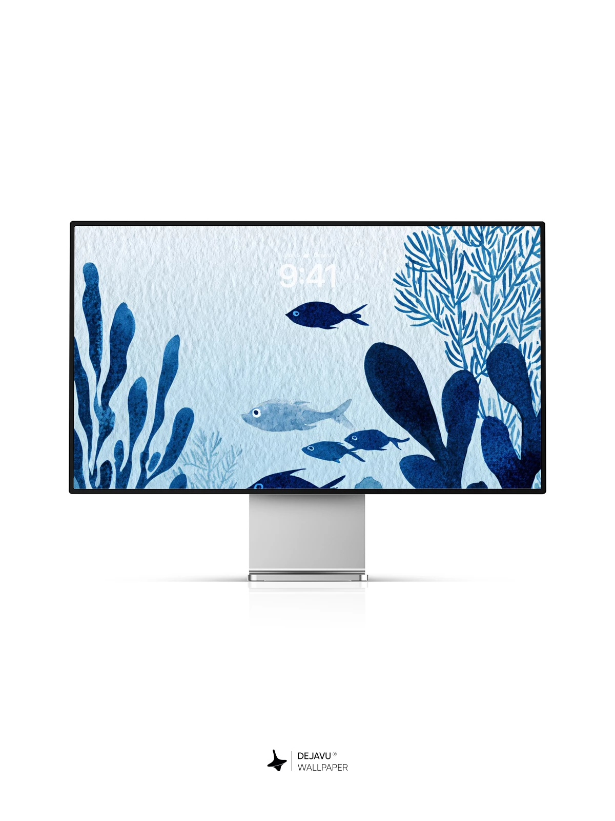 This serene underwater landscape, rendered in soothing shades of blue with a delicate watercolor technique, evokes the quiet beauty of ocean depths. Softly swaying seaweed and schools of fish glide through calm waters, creating a peaceful, dreamlike atmosphere ideal for digital backgrounds. The artwork’s gentle gradients and natural textures bring a calming presence to any screen—perfectly suited for iPhone, Android, or tablet use as a high-resolution 8K wallpaper.
