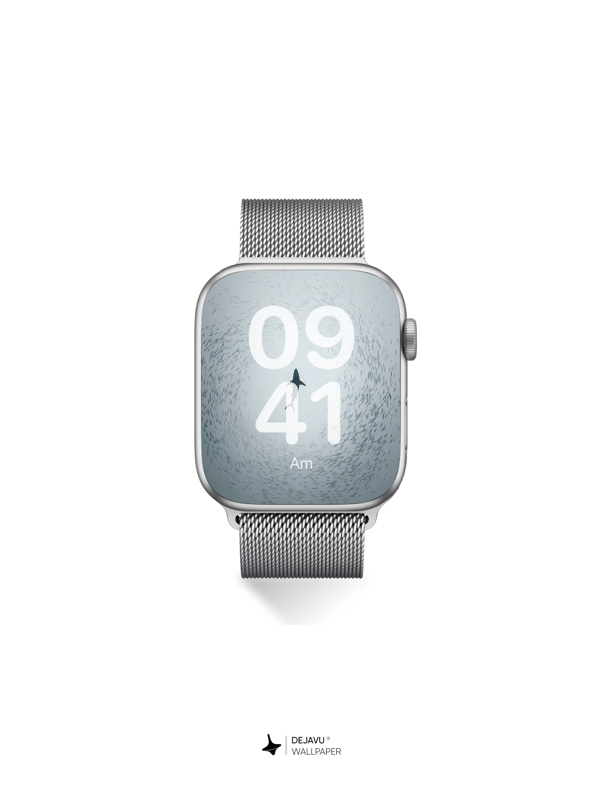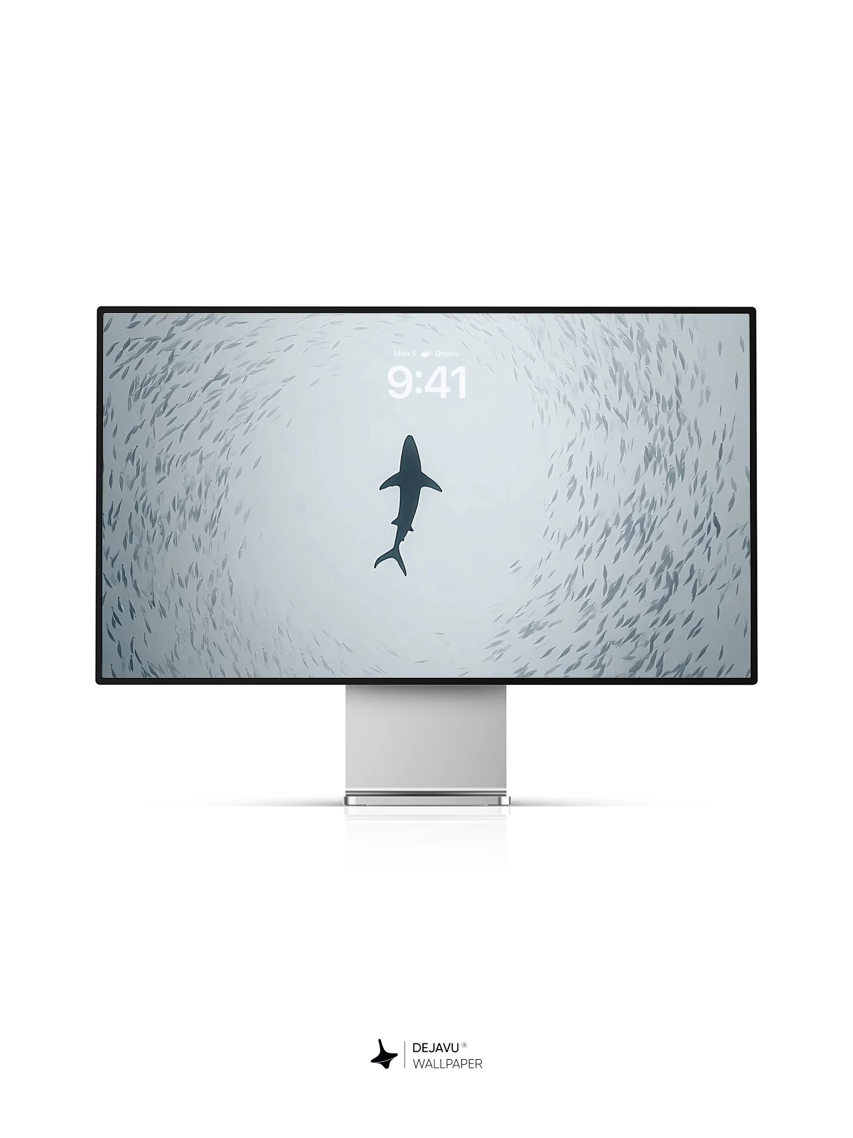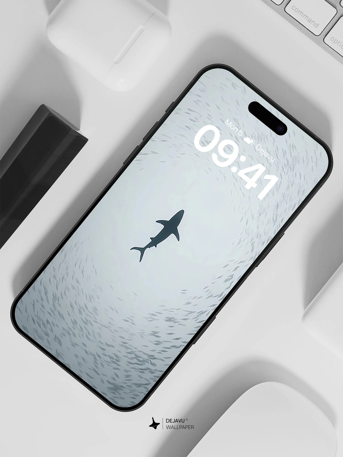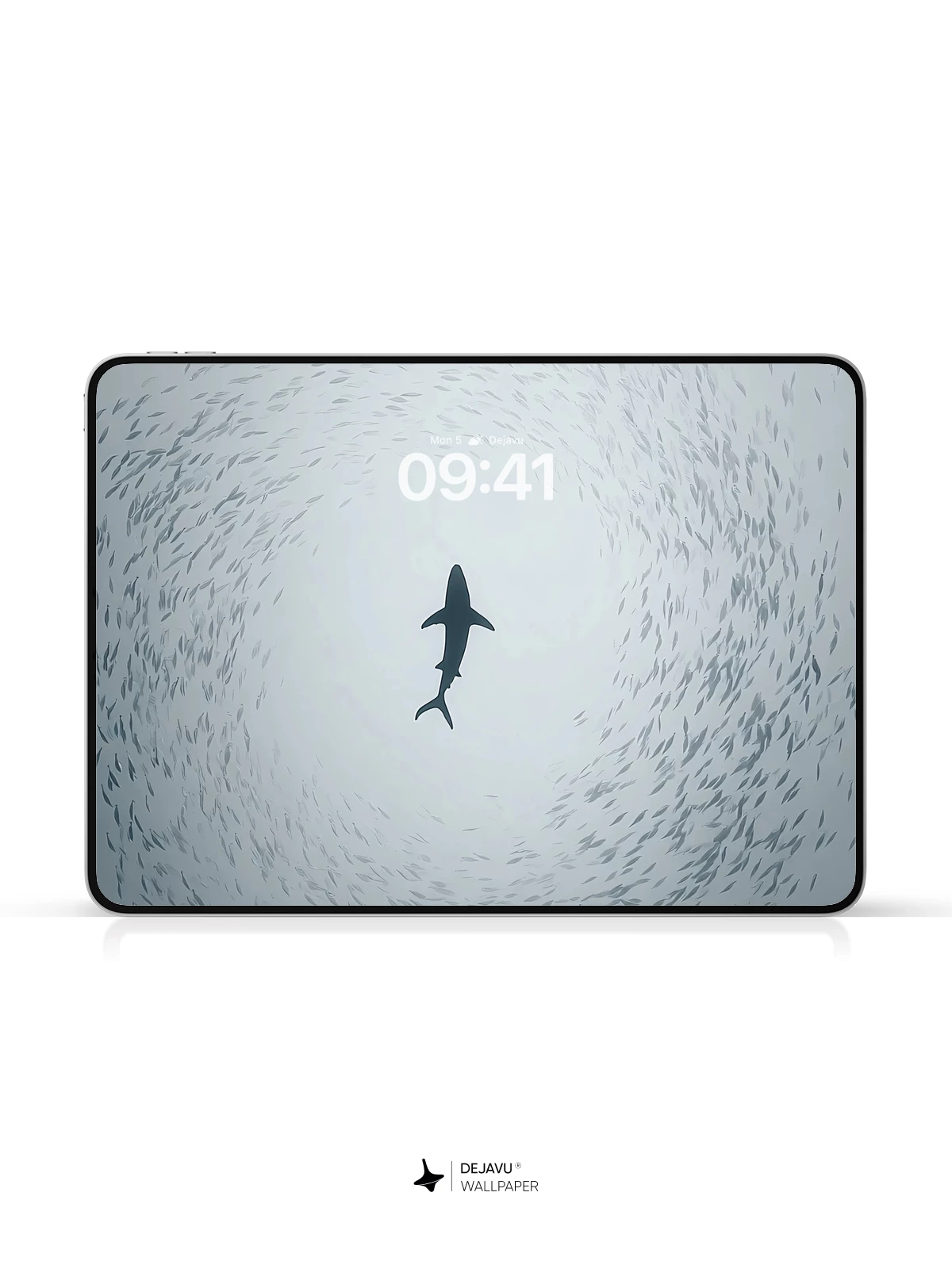 This high-resolution 8K wallpaper captures an underwater vortex with a solitary shark silhouette at its center, encircled by dynamic schools of fish. The minimalist composition and muted tones evoke a serene yet intense mood, making it ideal for iPhone, Android, and tablet screens.