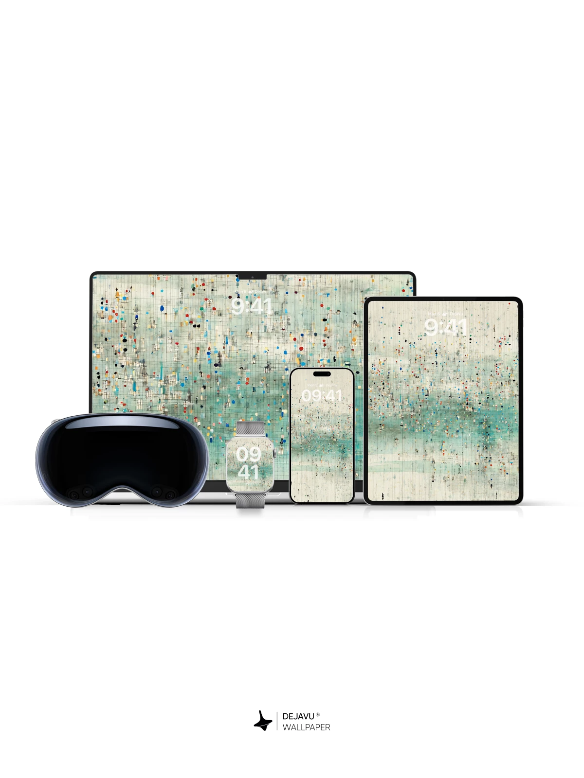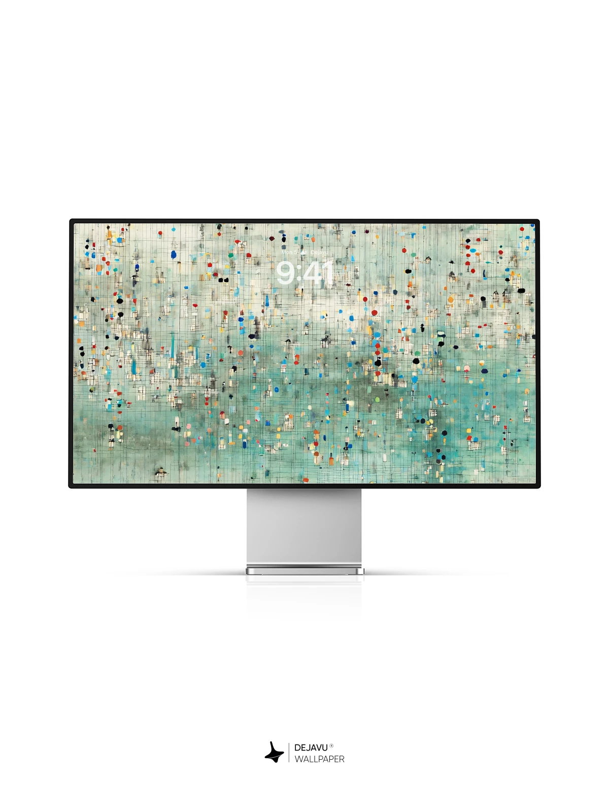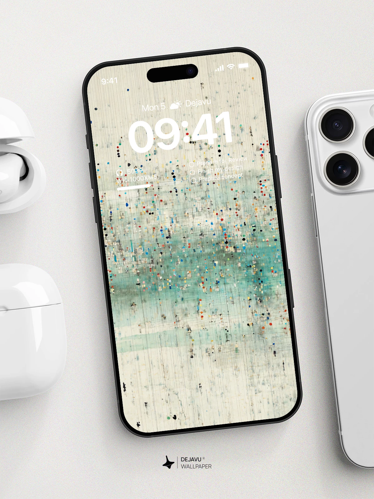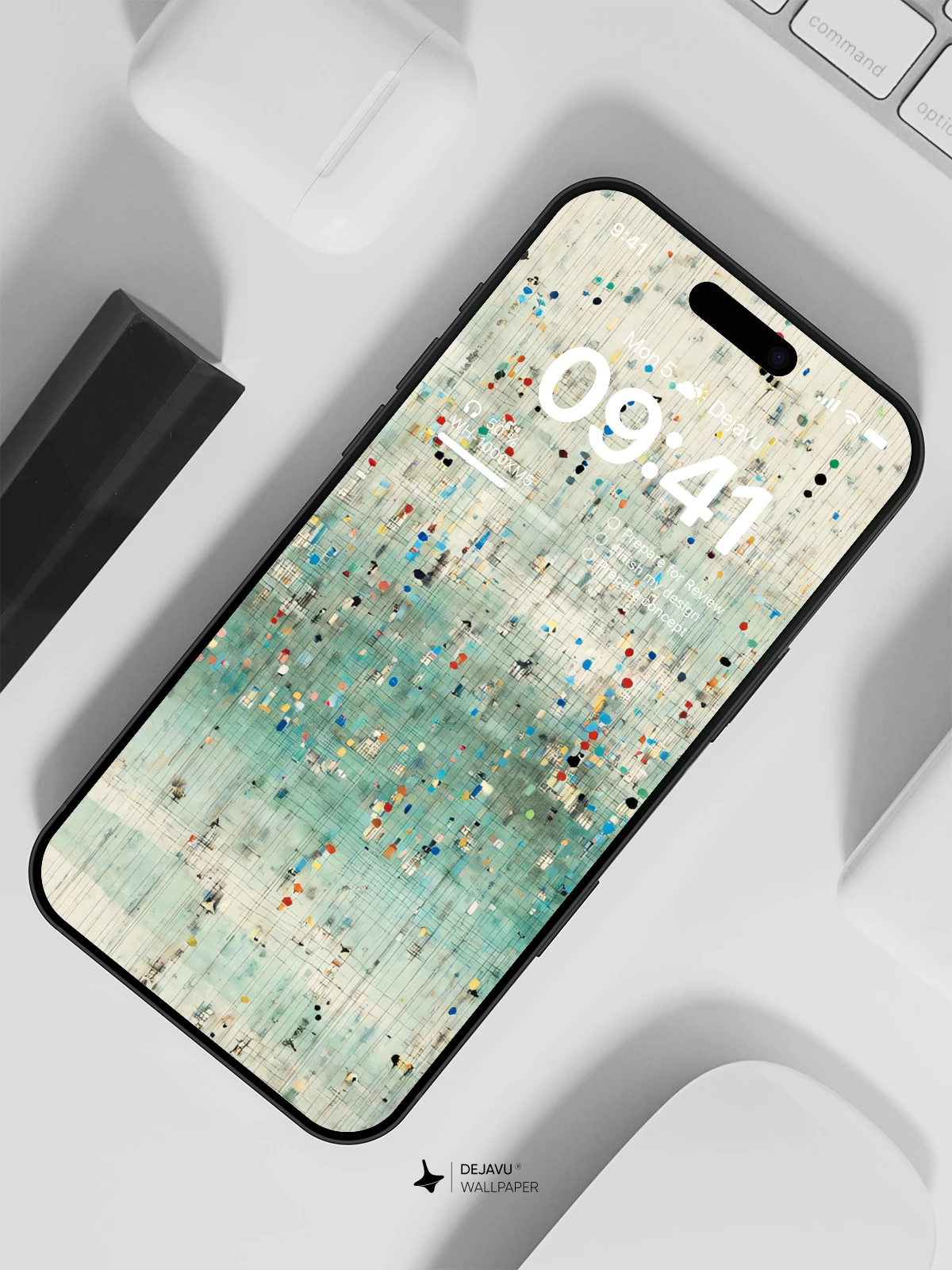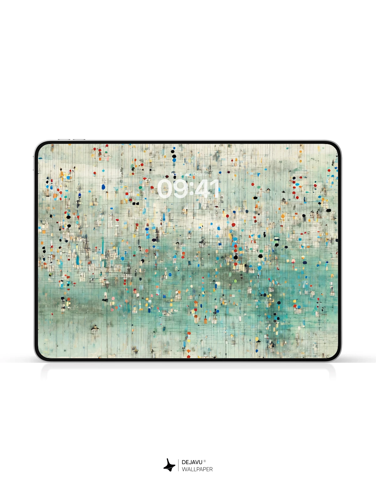 This abstract wallpaper features vertical lines resembling rain, combined with scattered colorful dots that add a playful touch. The soft gradient background enhances depth, making it a stylish choice for modern devices. Compatible with iPhone, Android, and tablets, it brings a fresh, artistic vibe to your screen.