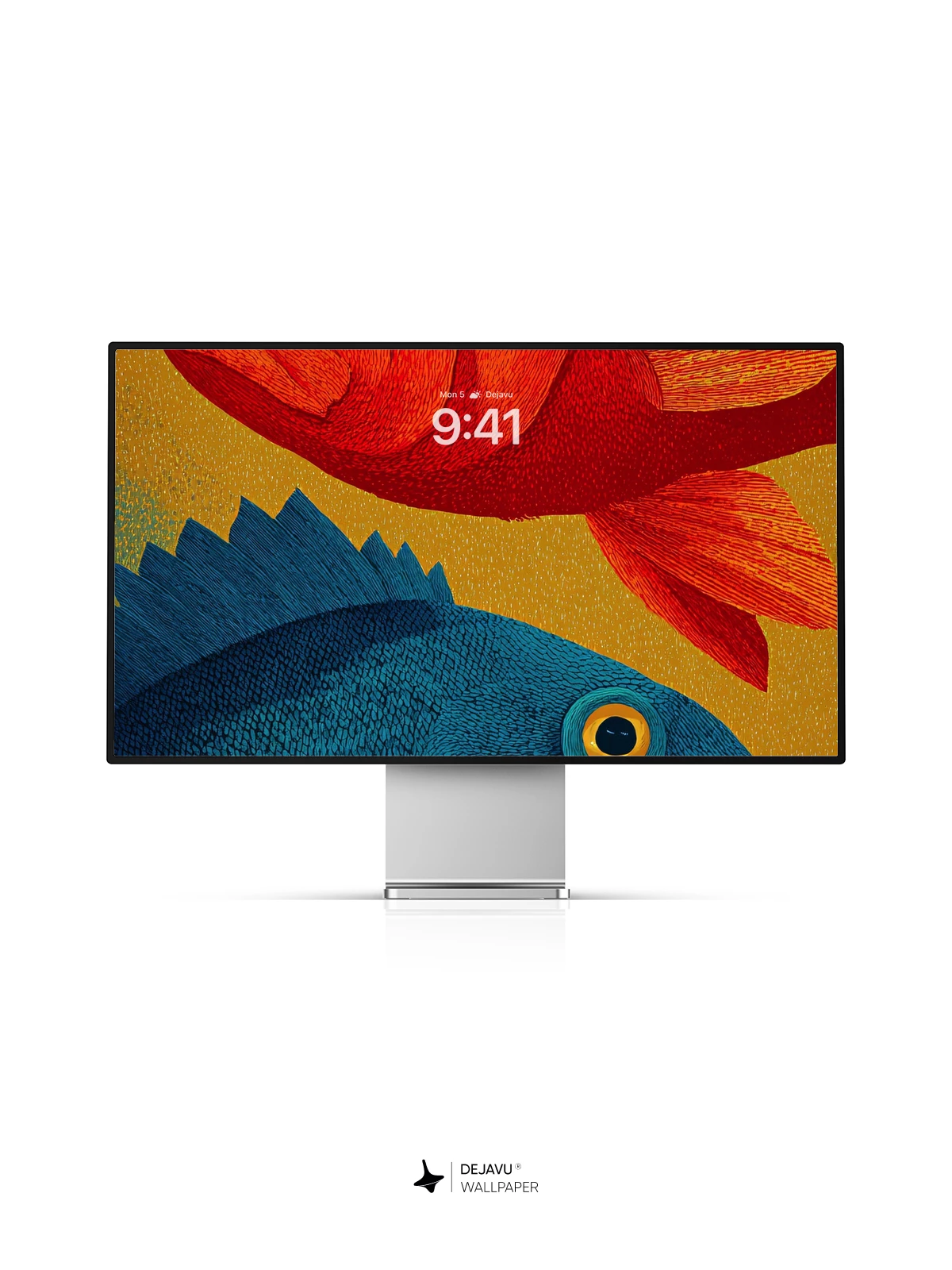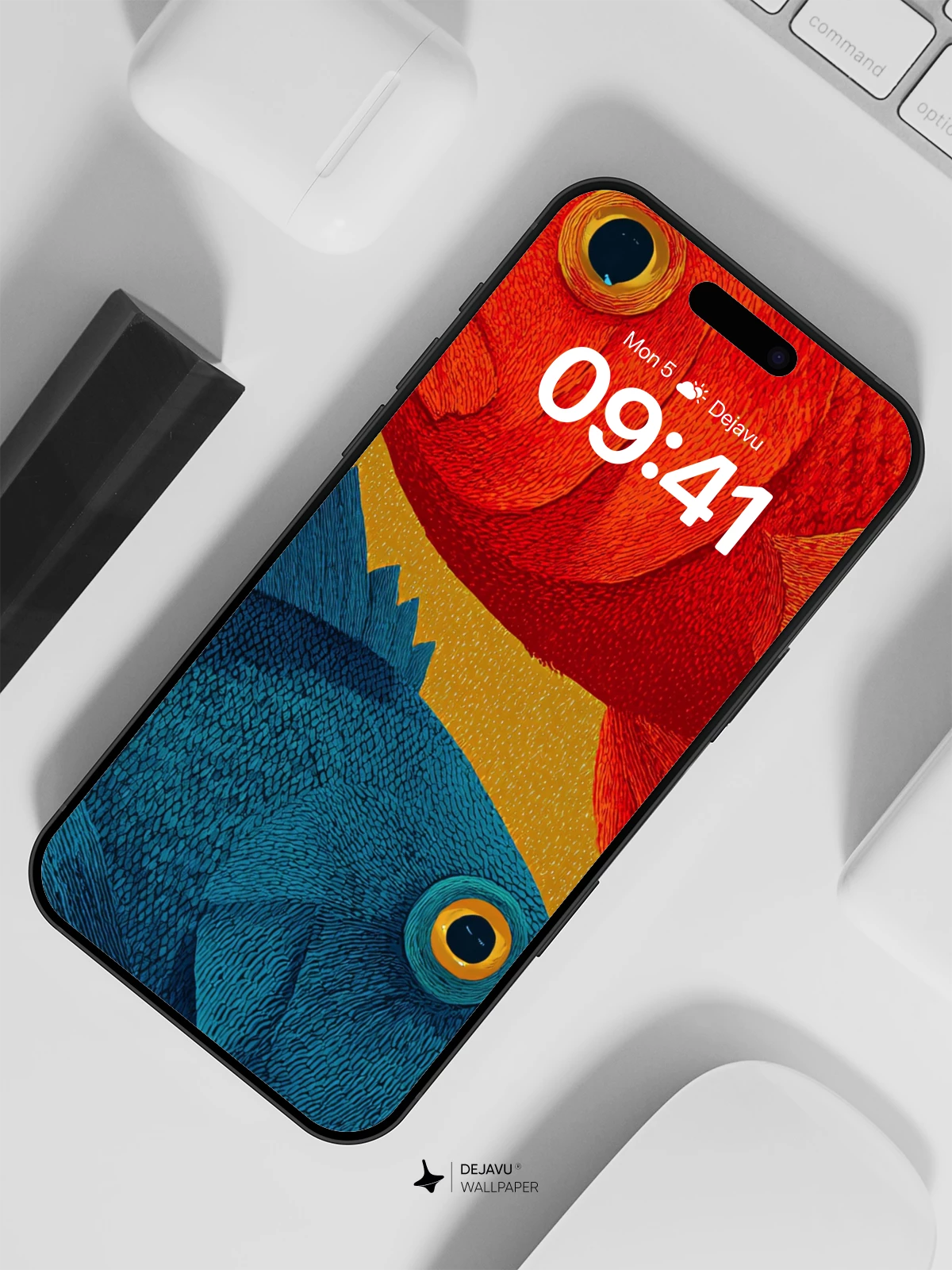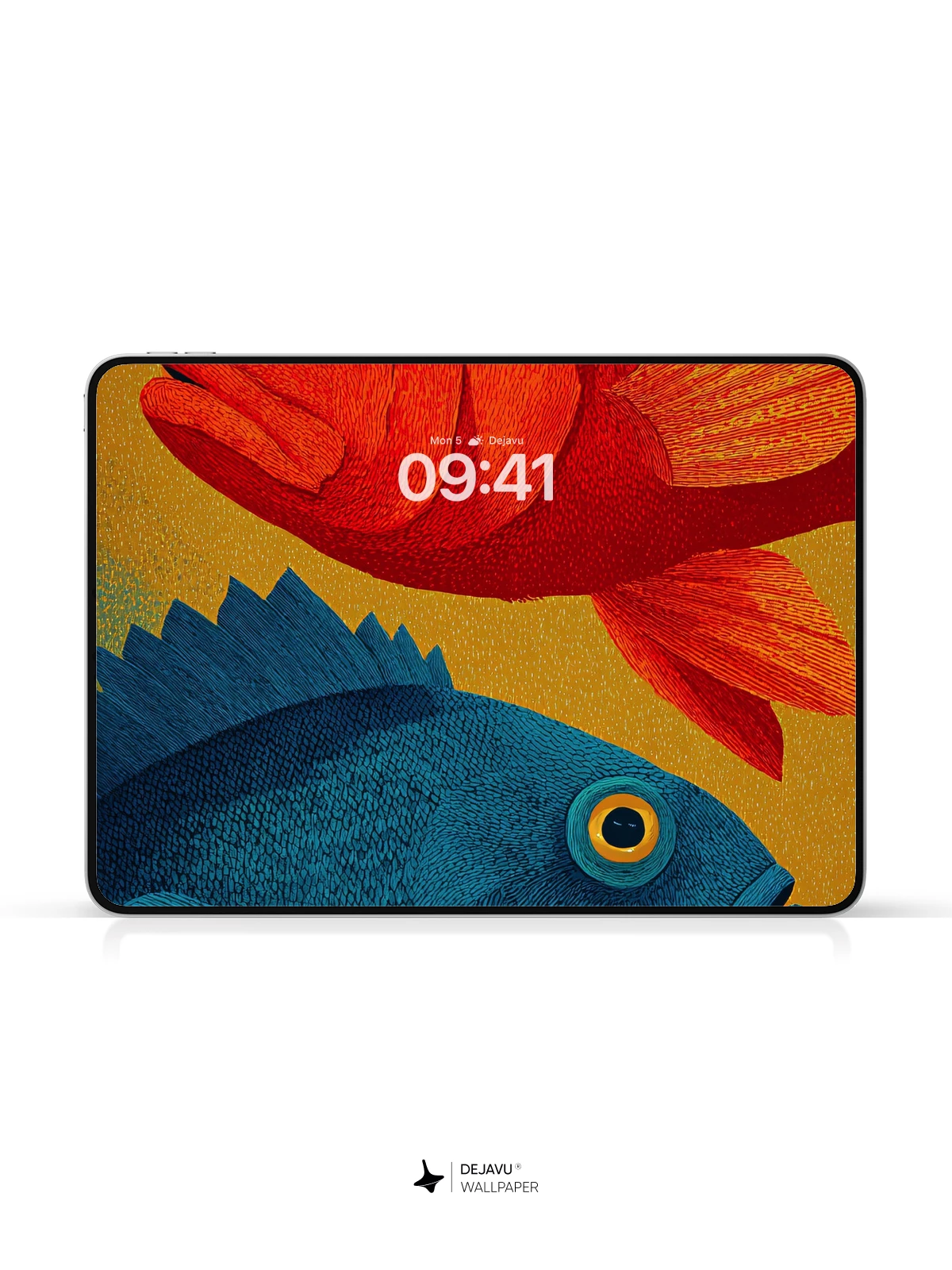 This captivating 8K wallpaper showcases two intricately detailed fish—one fiery red, the other deep ocean blue—set against a warm gradient backdrop. Inspired by the rich textures and color contrasts of traditional woodblock printing, the artwork blends realism with stylized patterns, creating a visually striking piece that feels both timeless and modern. Ideal for iPhone, Android, and tablet screens, this design brings marine elegance to your mobile device with its balanced composition and vibrant hues.