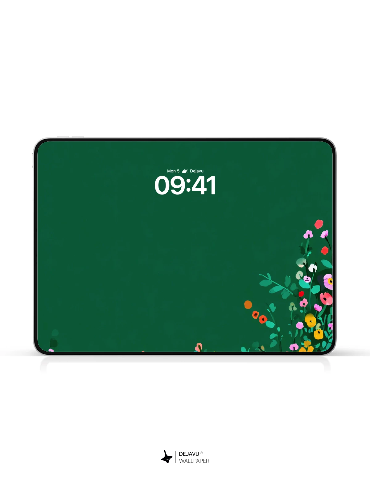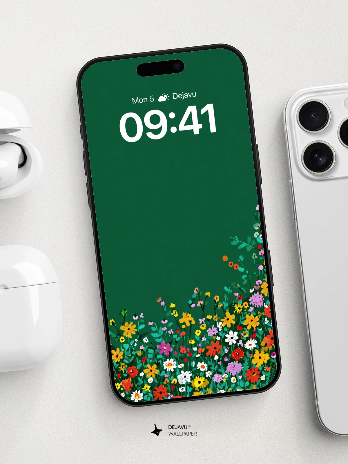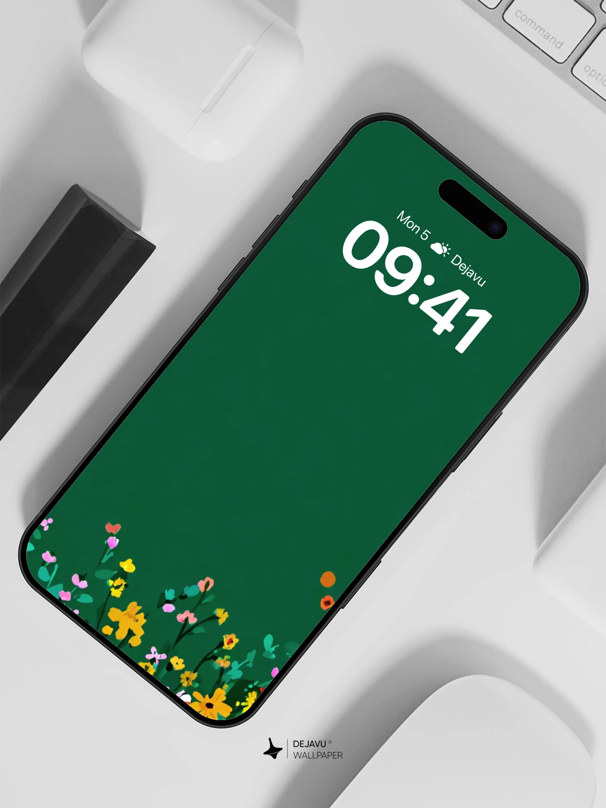 This stunning 8K wallpaper features a lush meadow of vivid wildflowers—yellow daisies, pink blossoms, red poppies, and white petals—rising from the bottom corner against a rich emerald green background. The cheerful, cartoon-inspired design evokes a sense of joy and natural wonder, making it an ideal choice for iPhone, Android, and tablet screens. Perfect for adding a touch of springtime vibrancy to your daily digital experience.