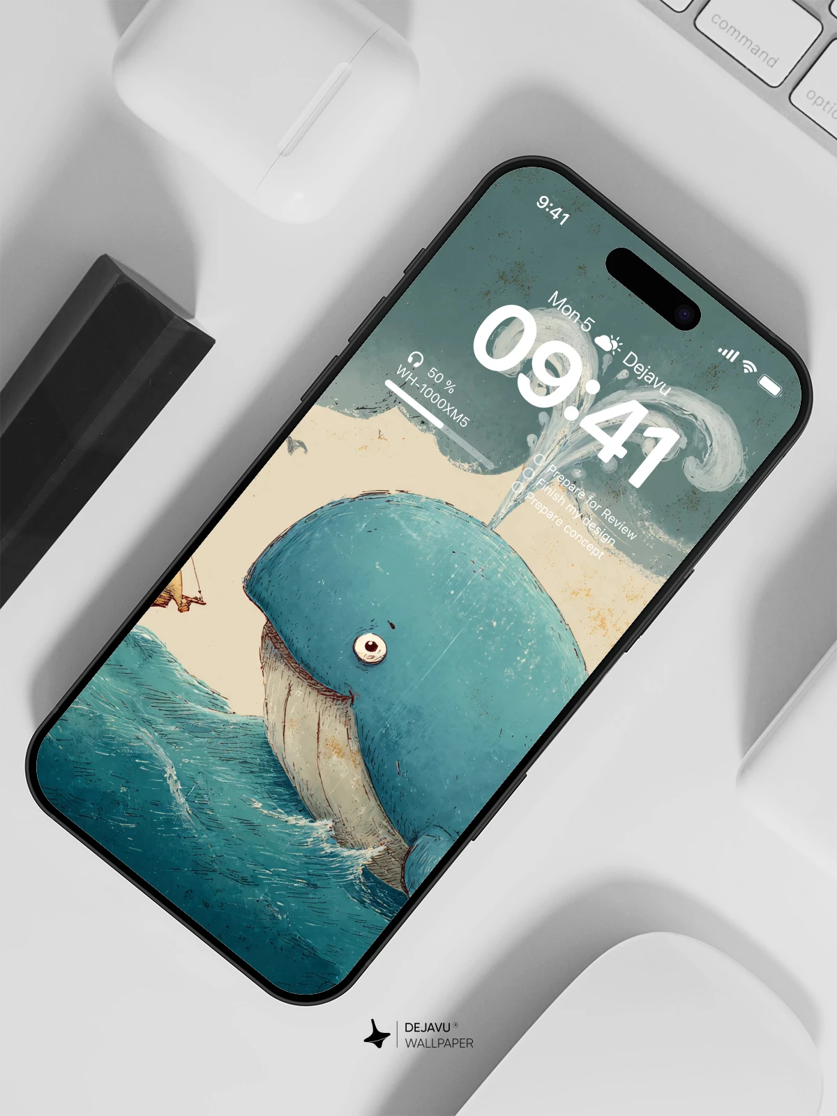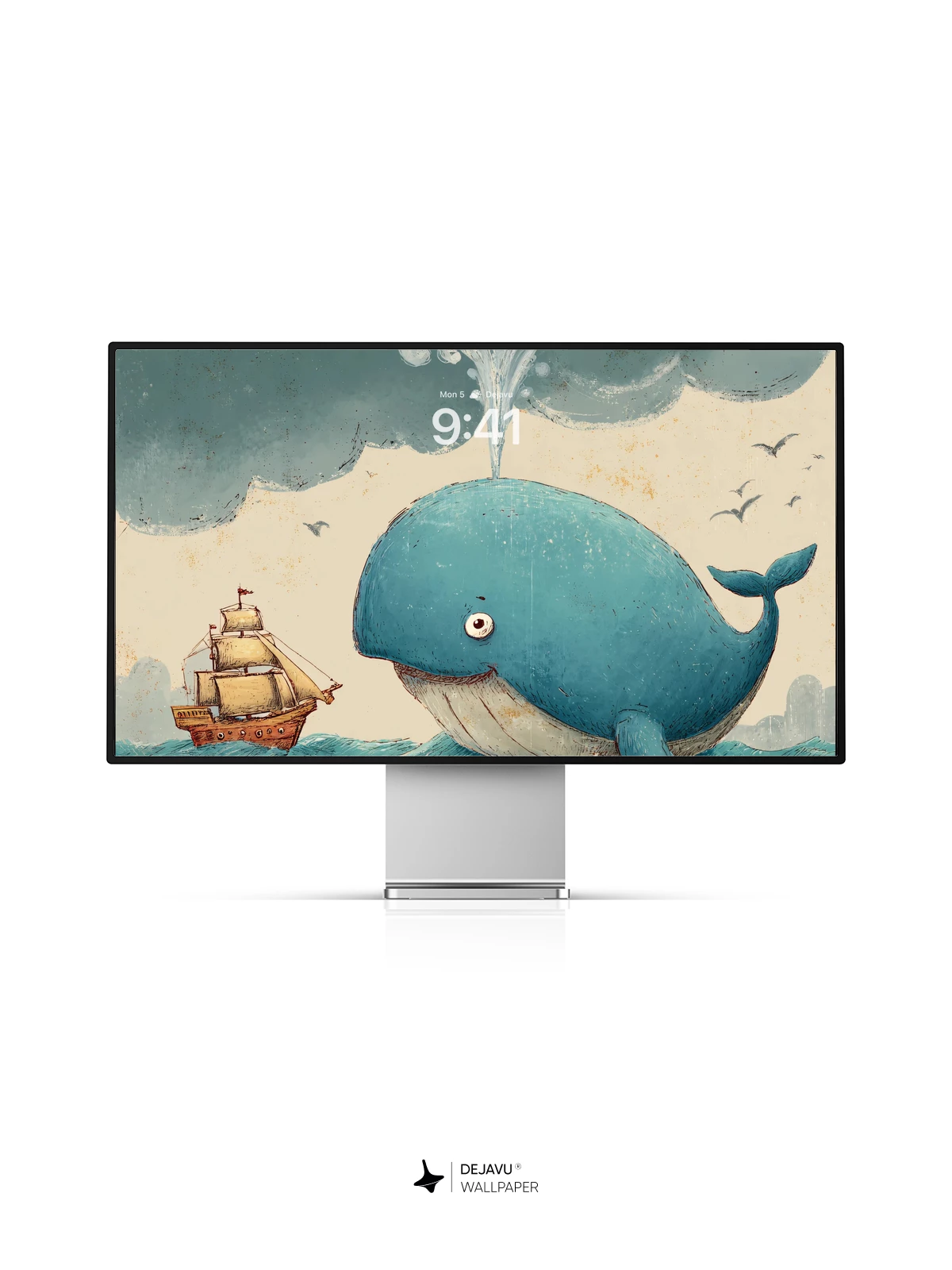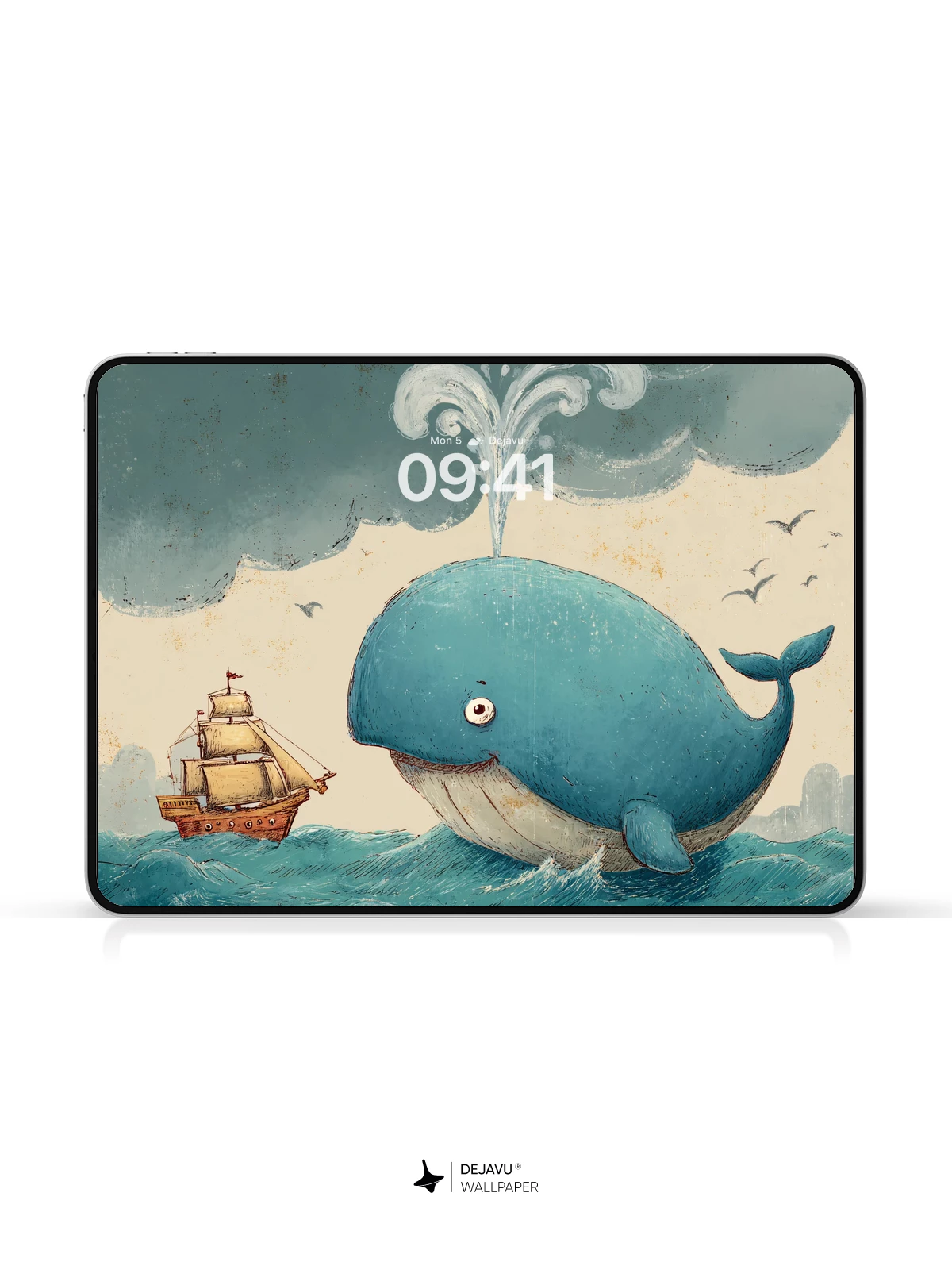 This 8K wallpaper captures a charming scene of a blue whale and a vintage sailing ship set against a stormy sky. The detailed illustration, with its textured waves and expressive whale, brings a sense of adventure and nostalgia. Ideal for iPhone, Android, and tablet users who appreciate a blend of classic art and modern design.