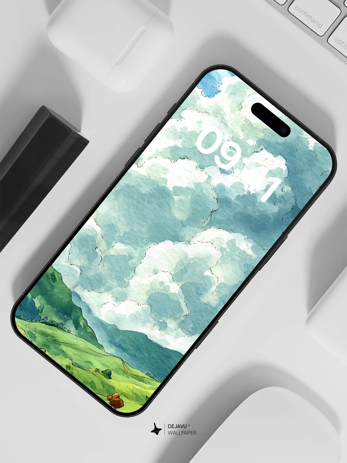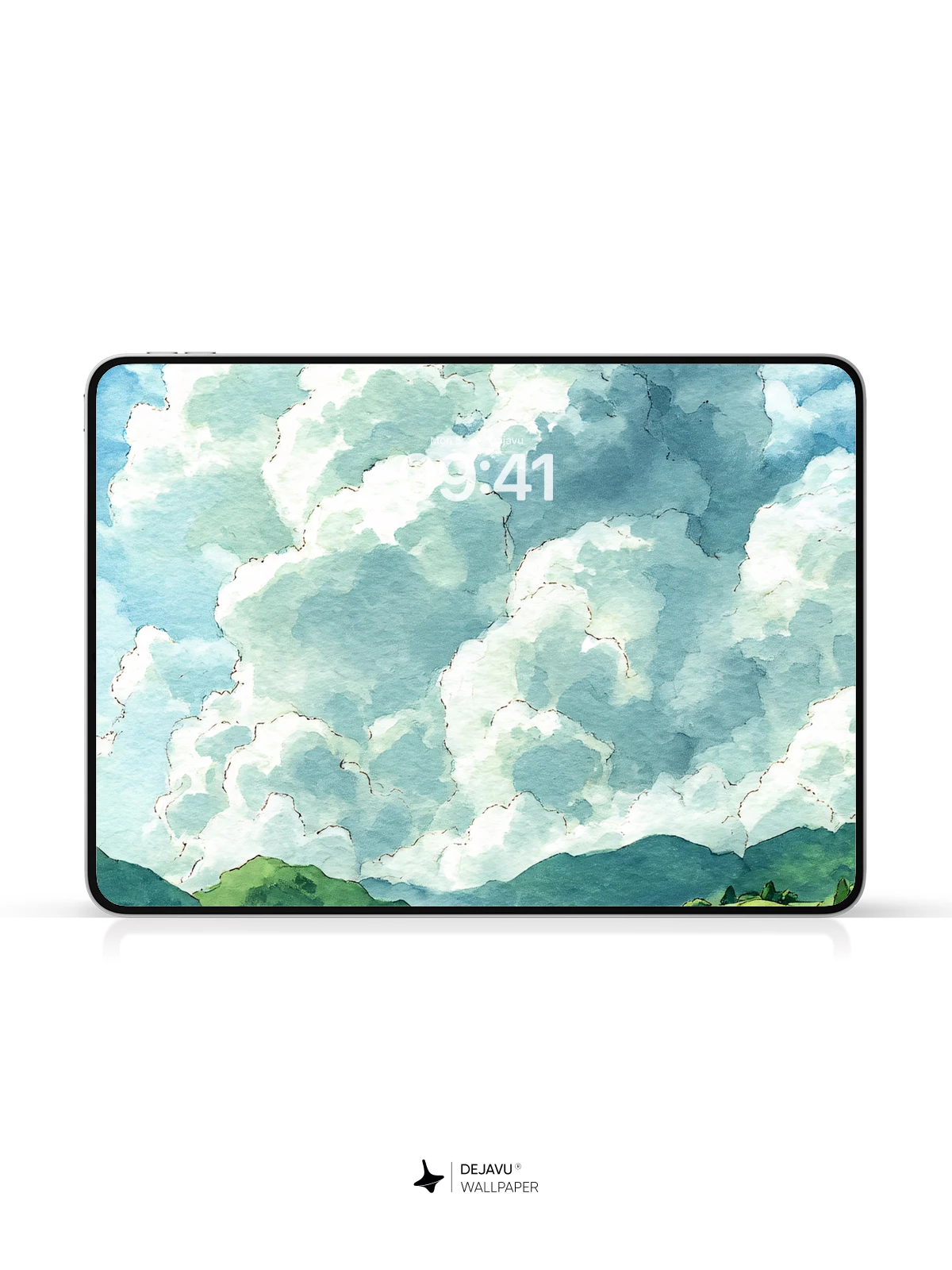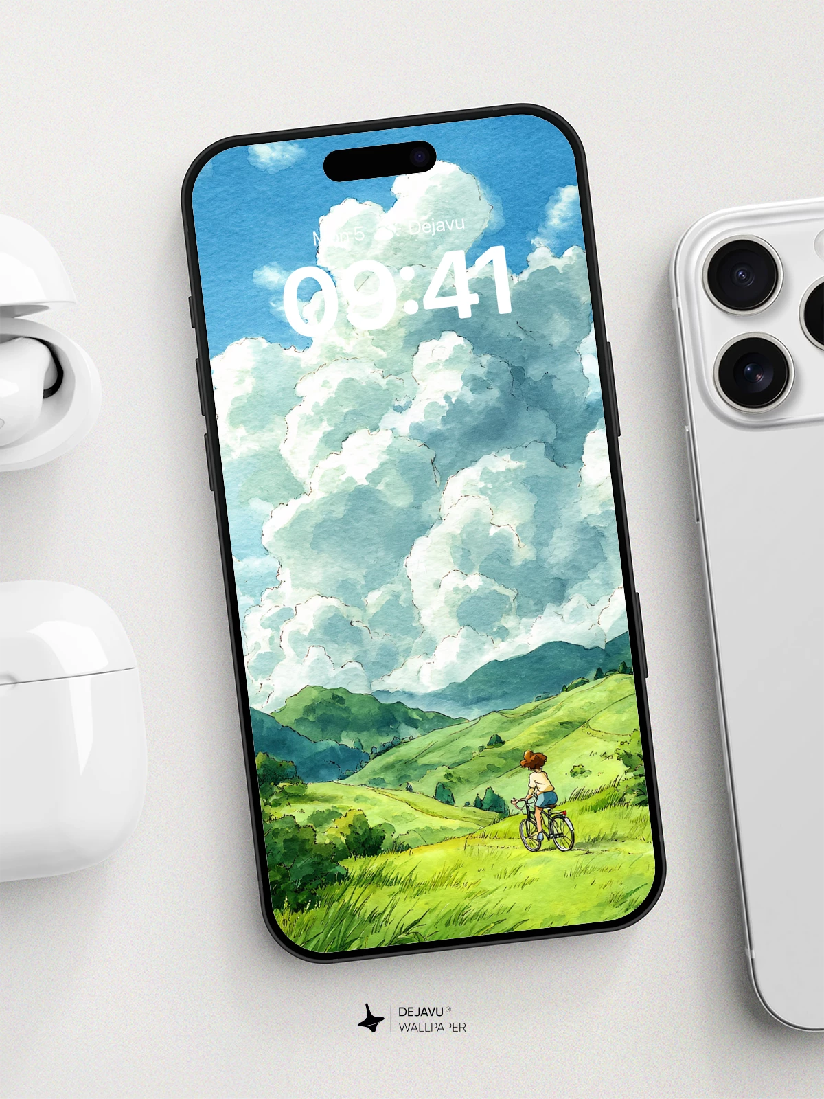 This watercolor-inspired wallpaper features a peaceful countryside landscape with a lone cyclist. The gentle greens and blues evoke a sense of tranquility, making it ideal for iPhone, Android, or tablet backgrounds.