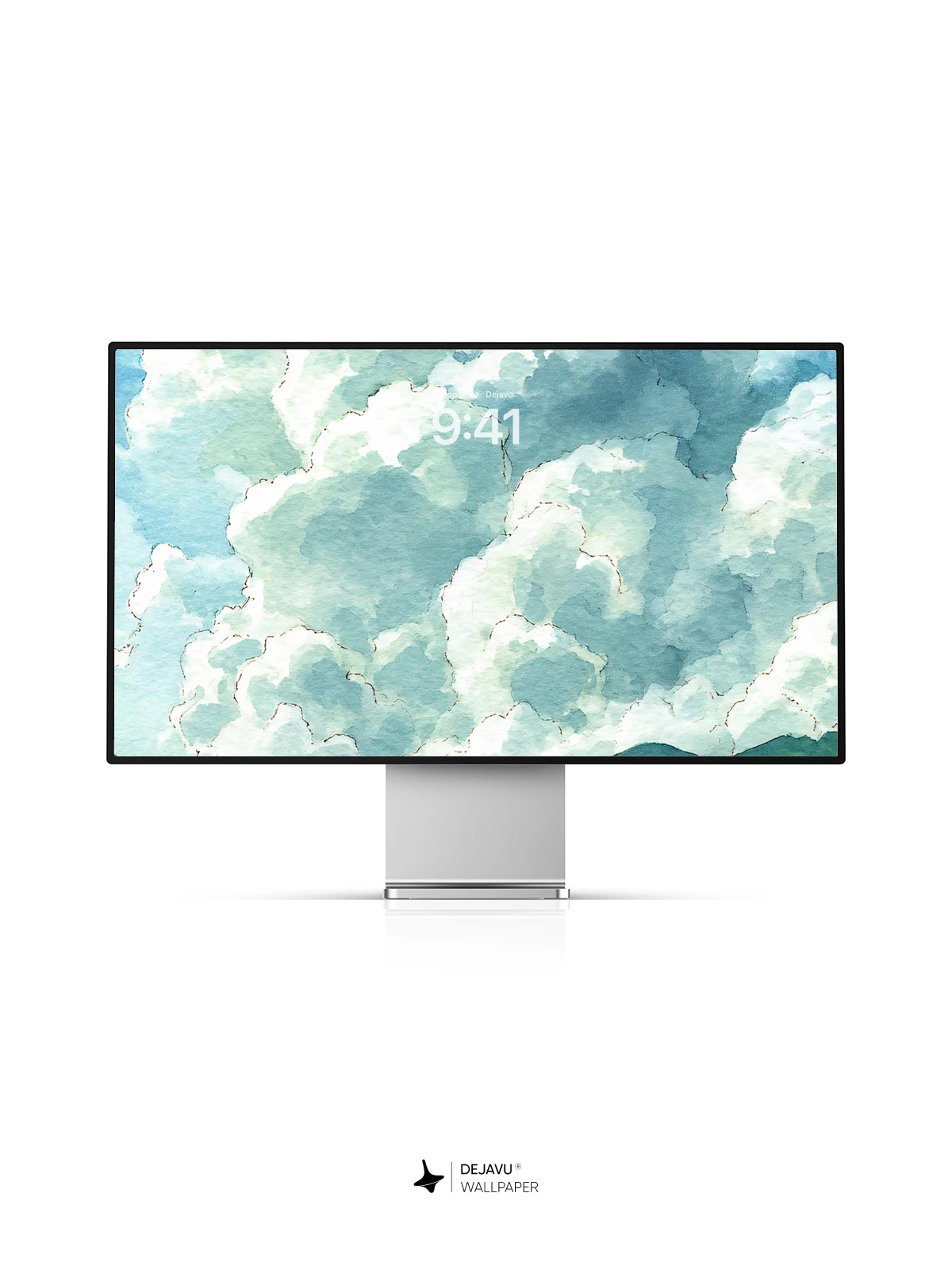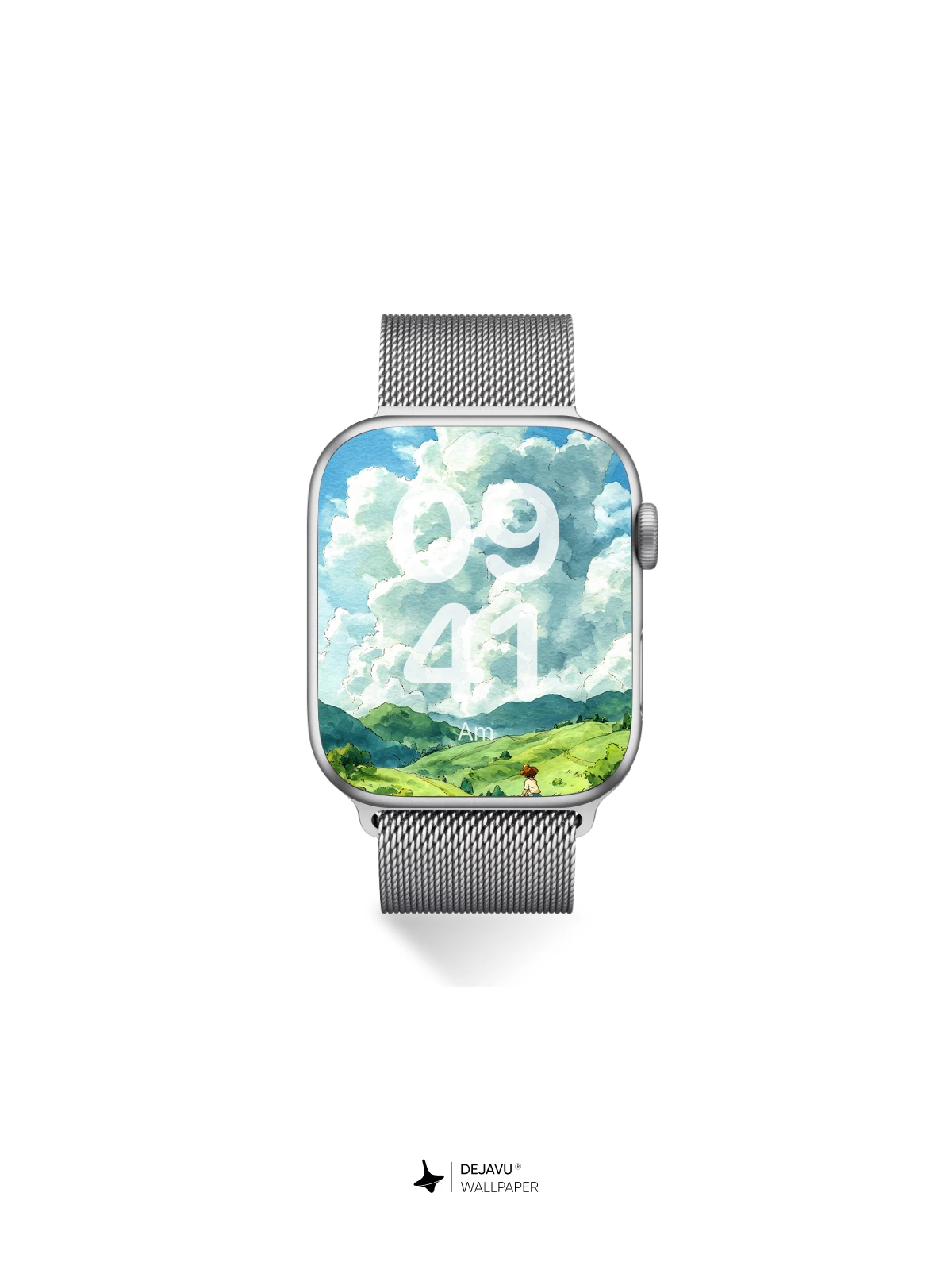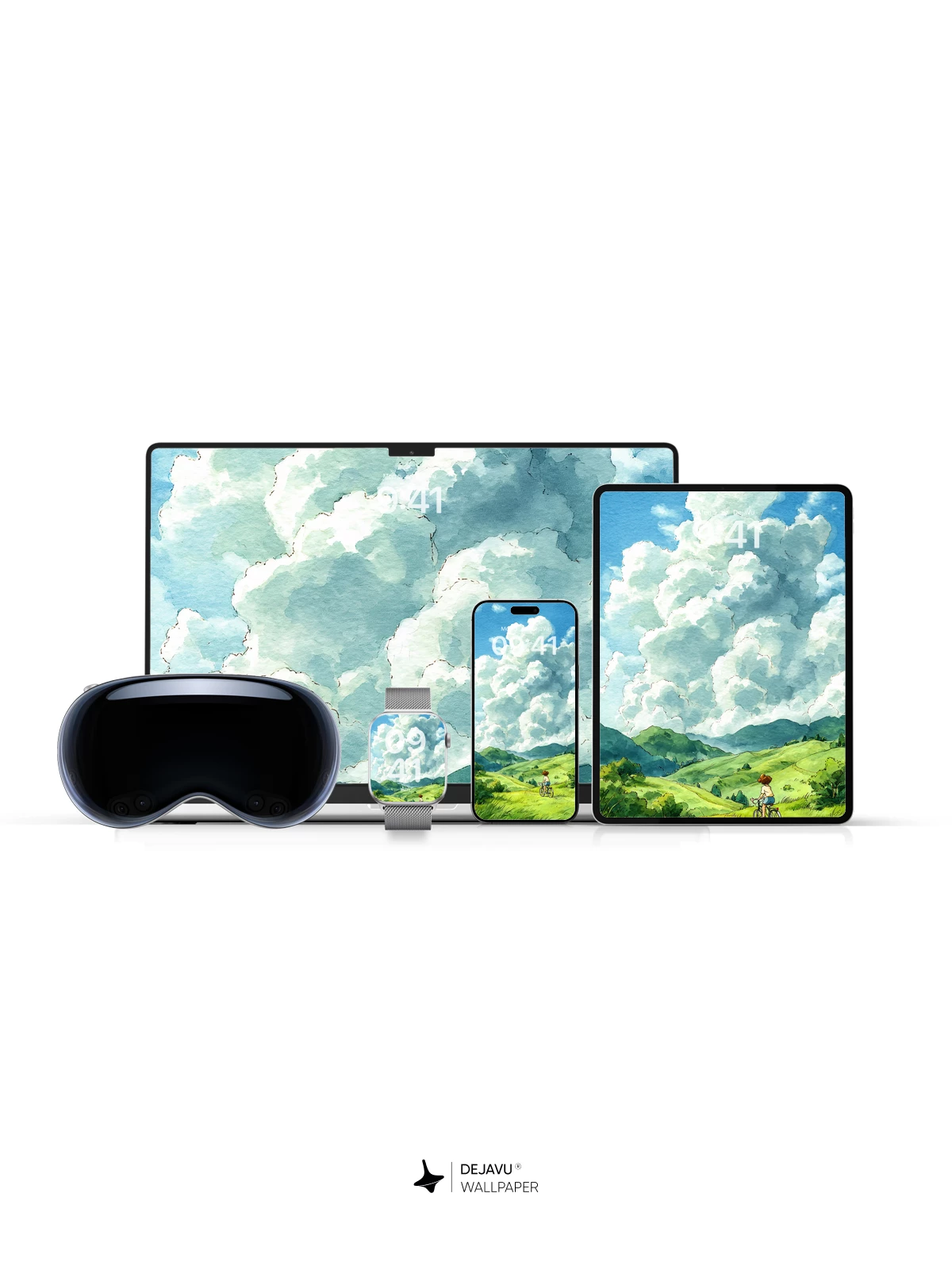 This watercolor-inspired wallpaper features a peaceful countryside landscape with a lone cyclist. The gentle greens and blues evoke a sense of tranquility, making it ideal for iPhone, Android, or tablet backgrounds.