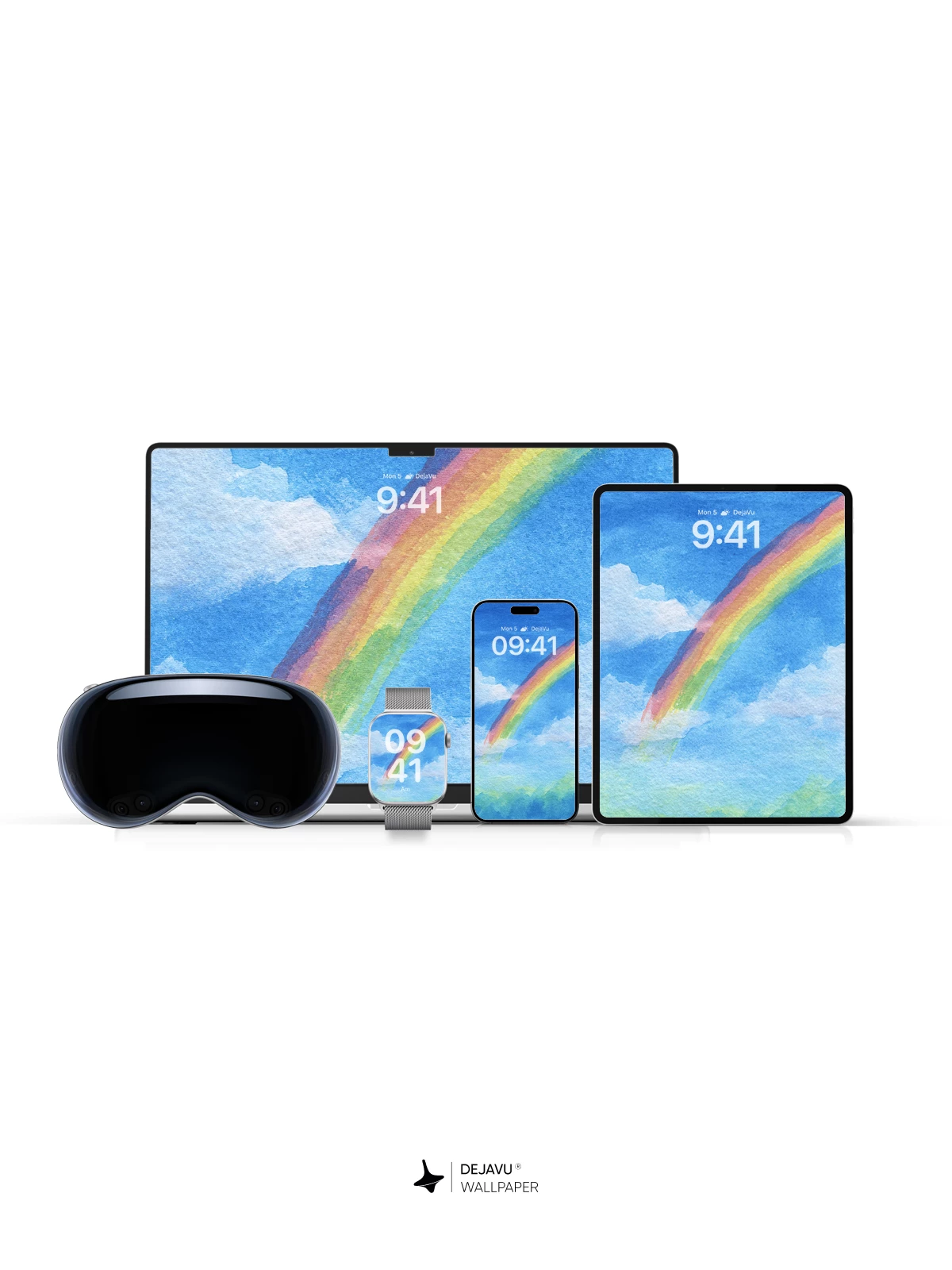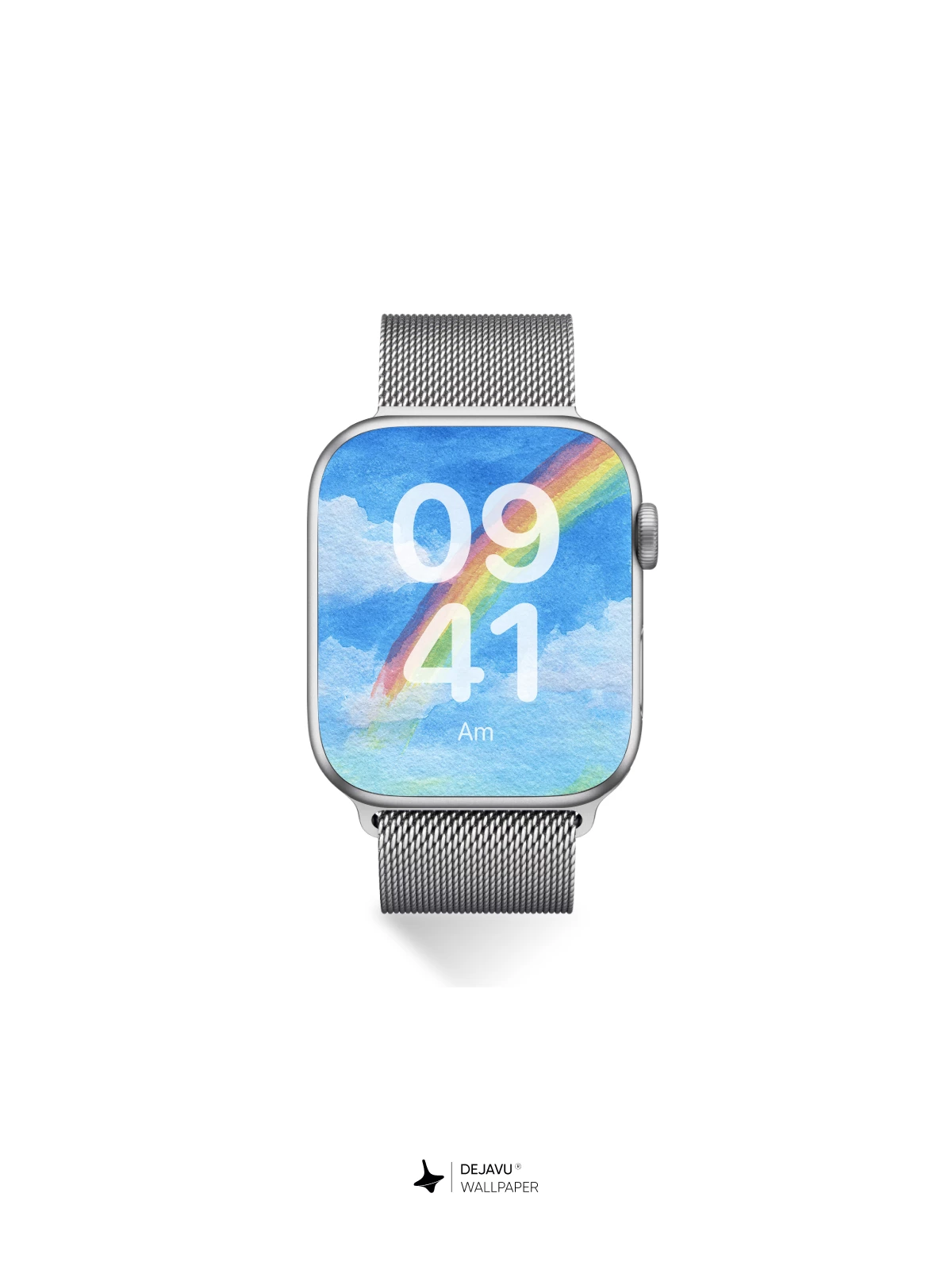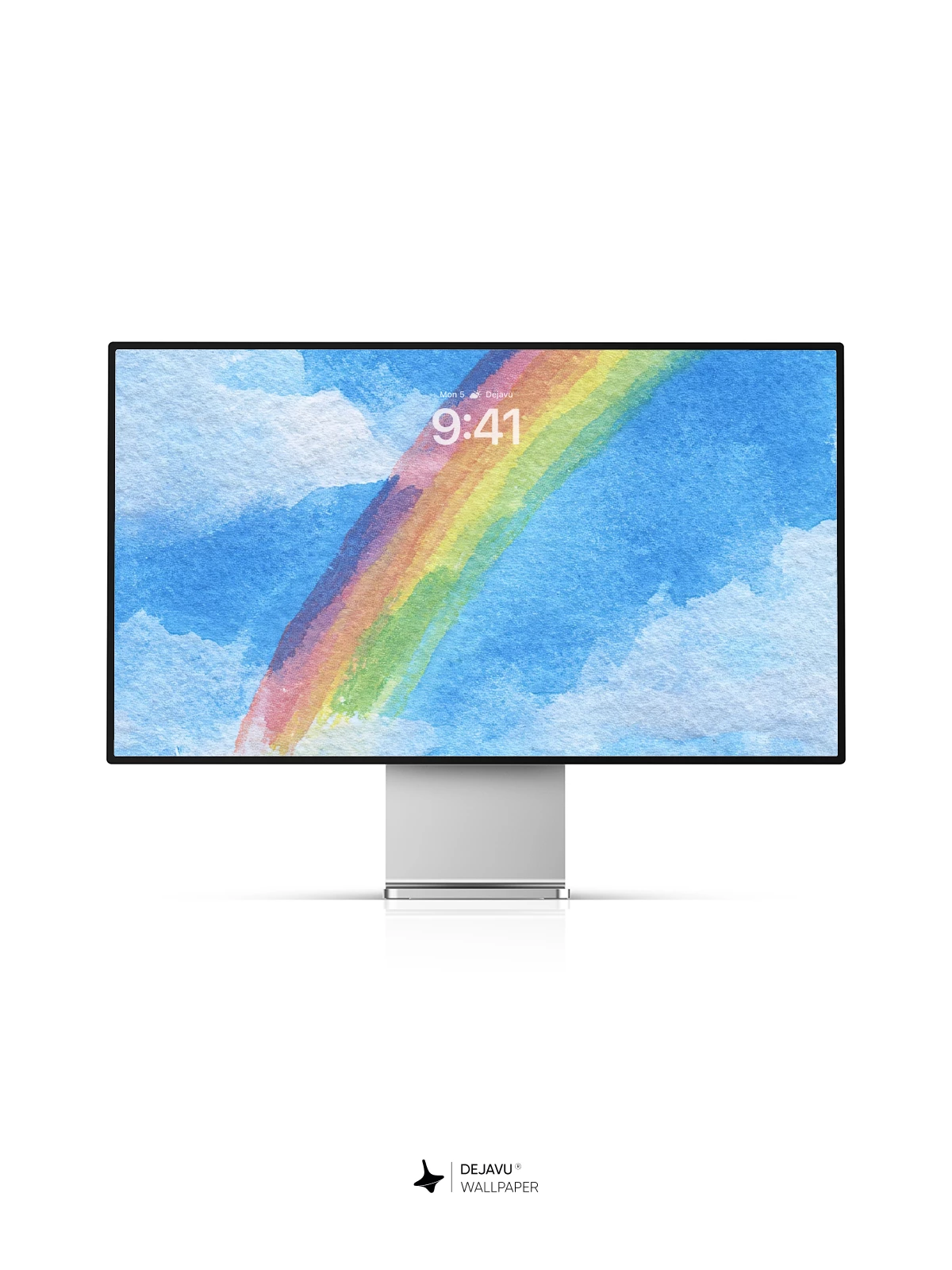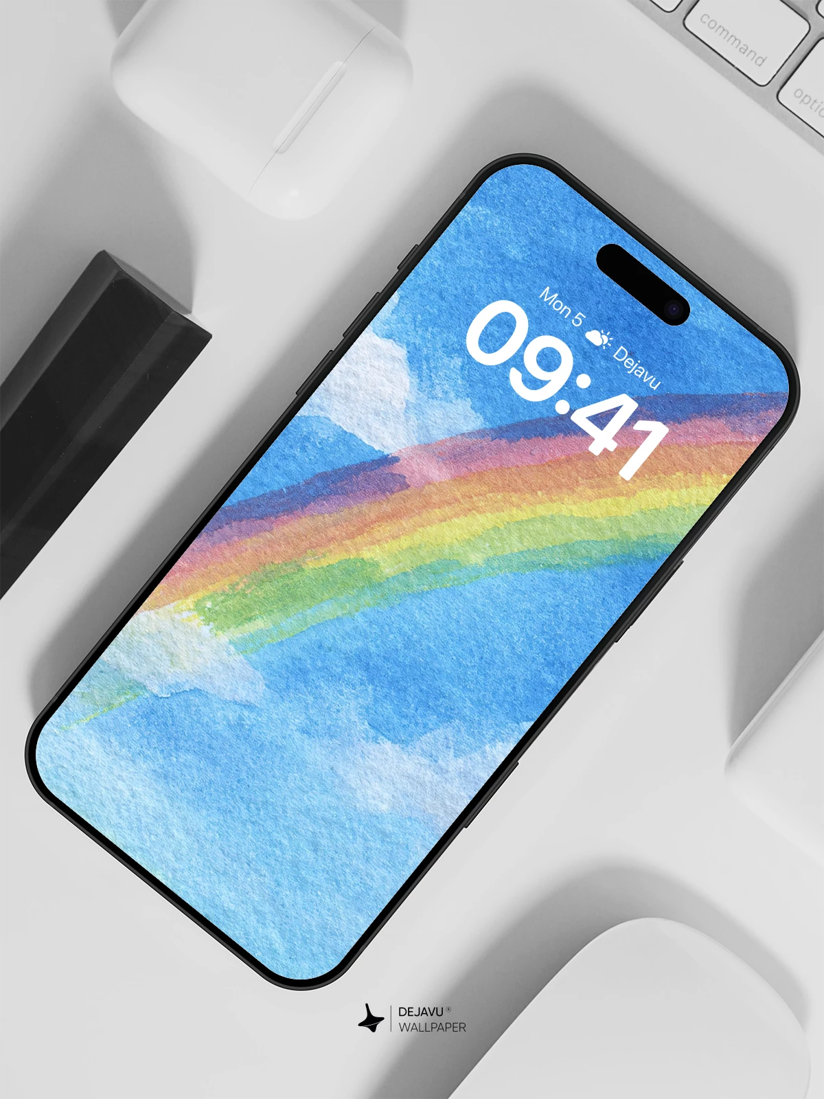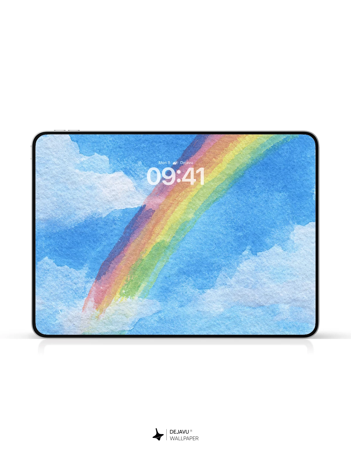 This wallpaper captures a dreamy sky scene where a watercolor rainbow stretches across a blue backdrop dotted with soft clouds. The hand-painted texture gives it a unique, artistic feel, making it ideal for iPhone, Android, and tablet users seeking a serene and creative aesthetic.
