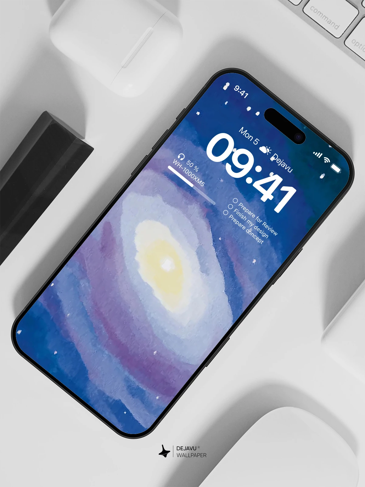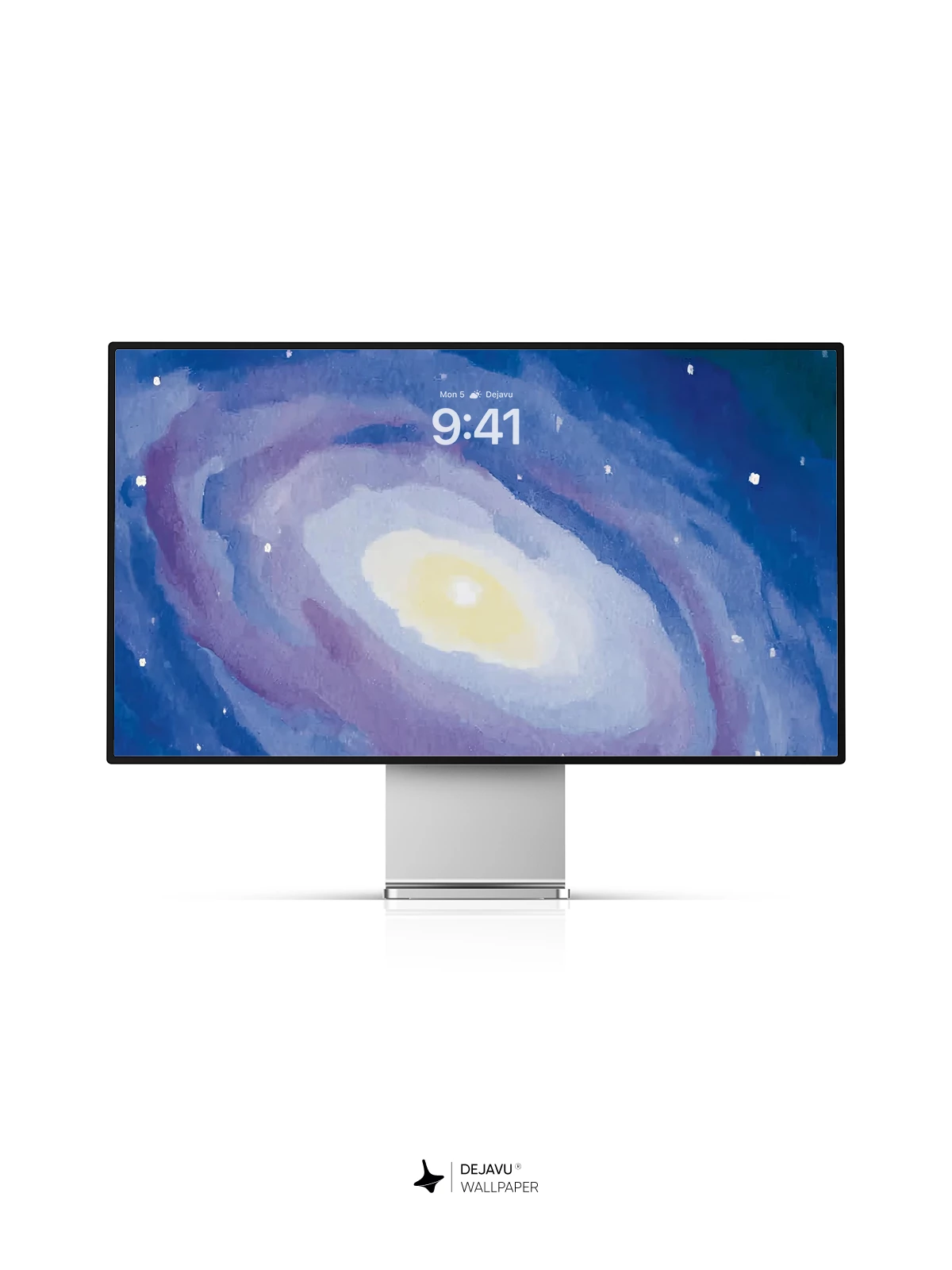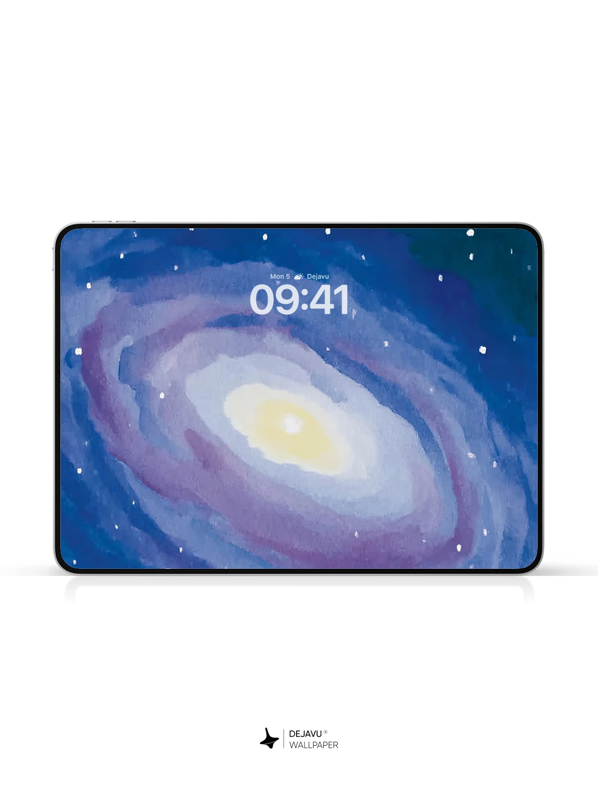 This watercolor spiral galaxy wallpaper features a mesmerizing blend of purple and blue tones, with a glowing yellow center and scattered white stars. The artistic, hand-painted style brings a serene and otherworldly atmosphere to your phone or tablet screen. Ideal for those who appreciate a touch of celestial beauty in their digital space.