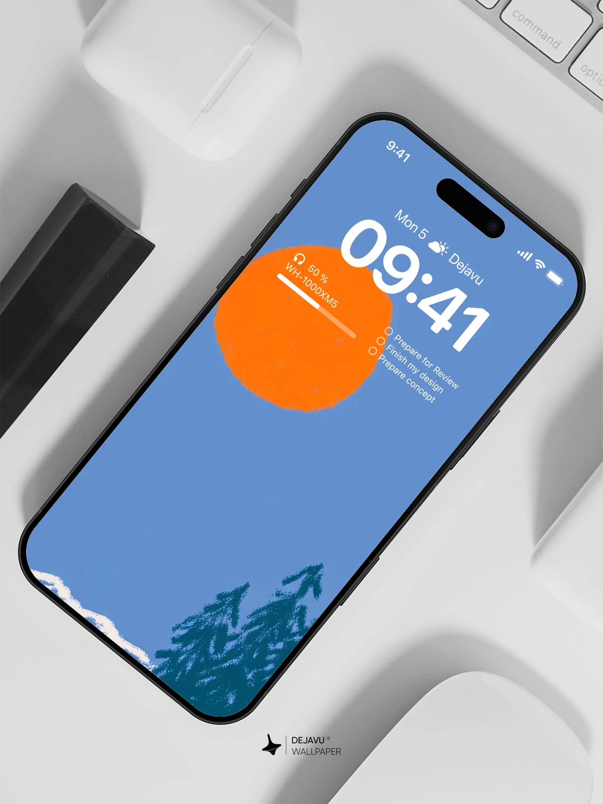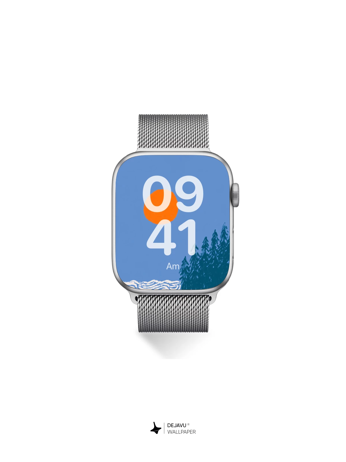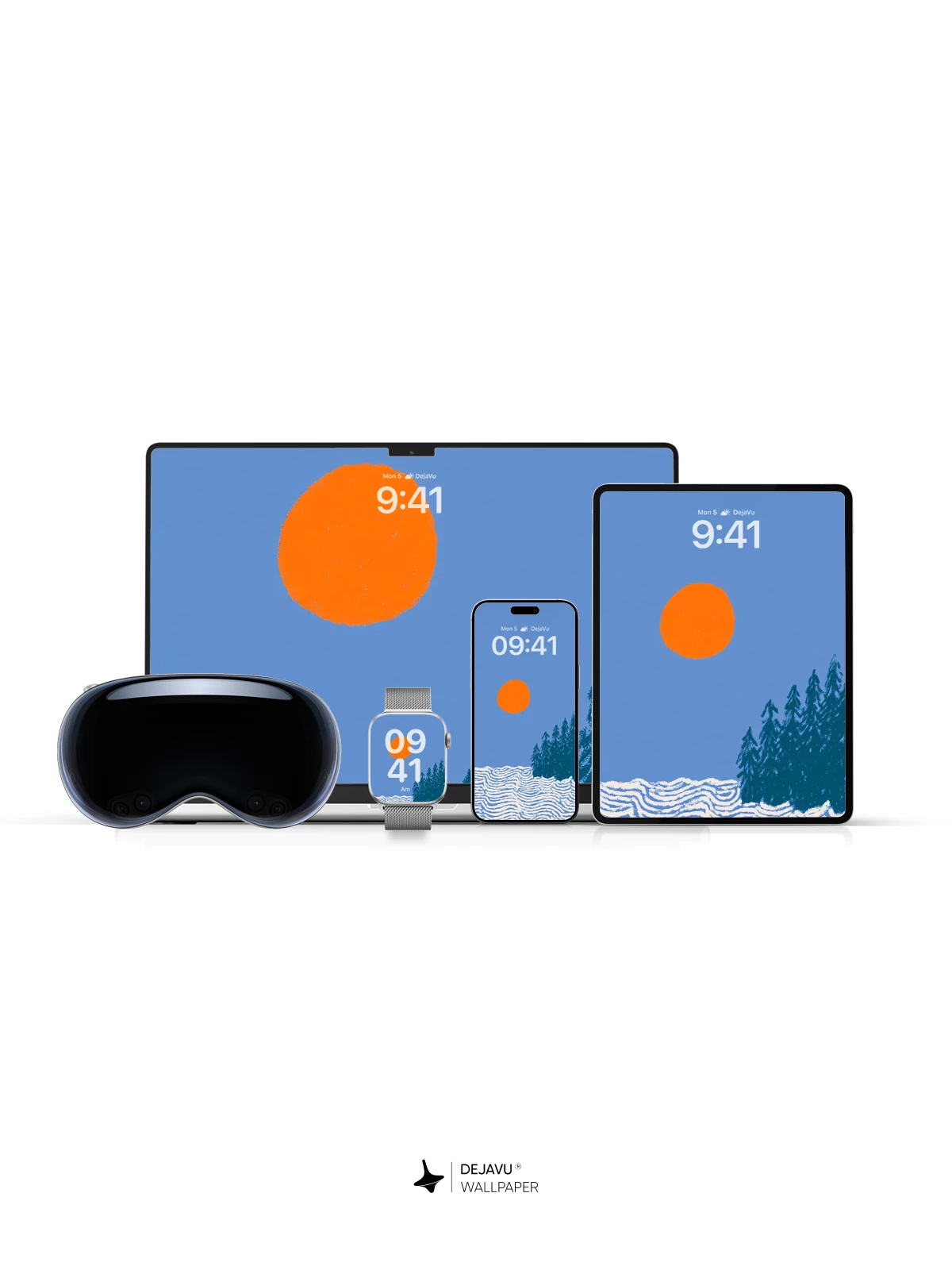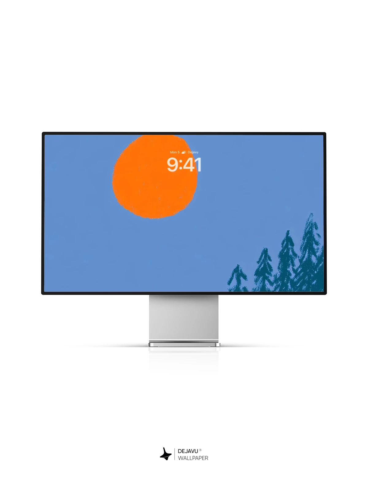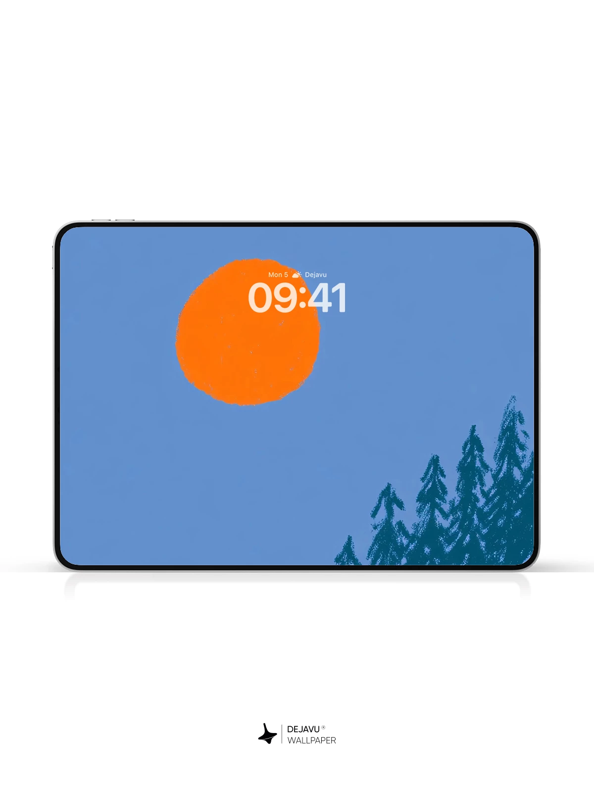 This 8K wallpaper features a serene winter landscape with a bold orange sun, rhythmic snow textures, and deep green pine trees. Ideal for adding a peaceful, nature-inspired touch to your iPhone, Android, or tablet screen.