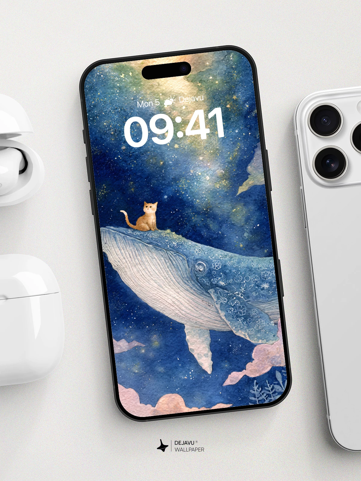 This enchanting artwork captures a whimsical moment of a small orange cat perched on the back of a majestic whale gliding through a cosmos painted with soft clouds and glowing stars. Inspired by dreamlike surrealism and delicate watercolor techniques, the image evokes a sense of peaceful adventure and cosmic harmony. The intricate floral patterns adorning the whale and the ethereal glow of the galaxy create a magical atmosphere ideal for iPhone, Android, or tablet wallpapers. Perfect for those who love fantasy art, celestial themes, and serene digital backgrounds in stunning 8K resolution.