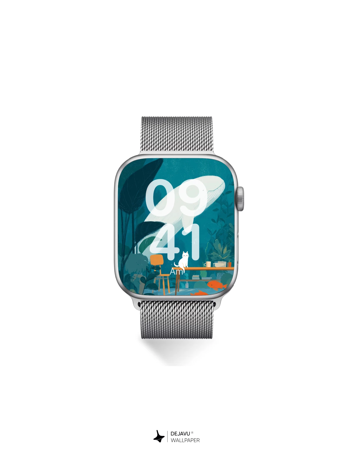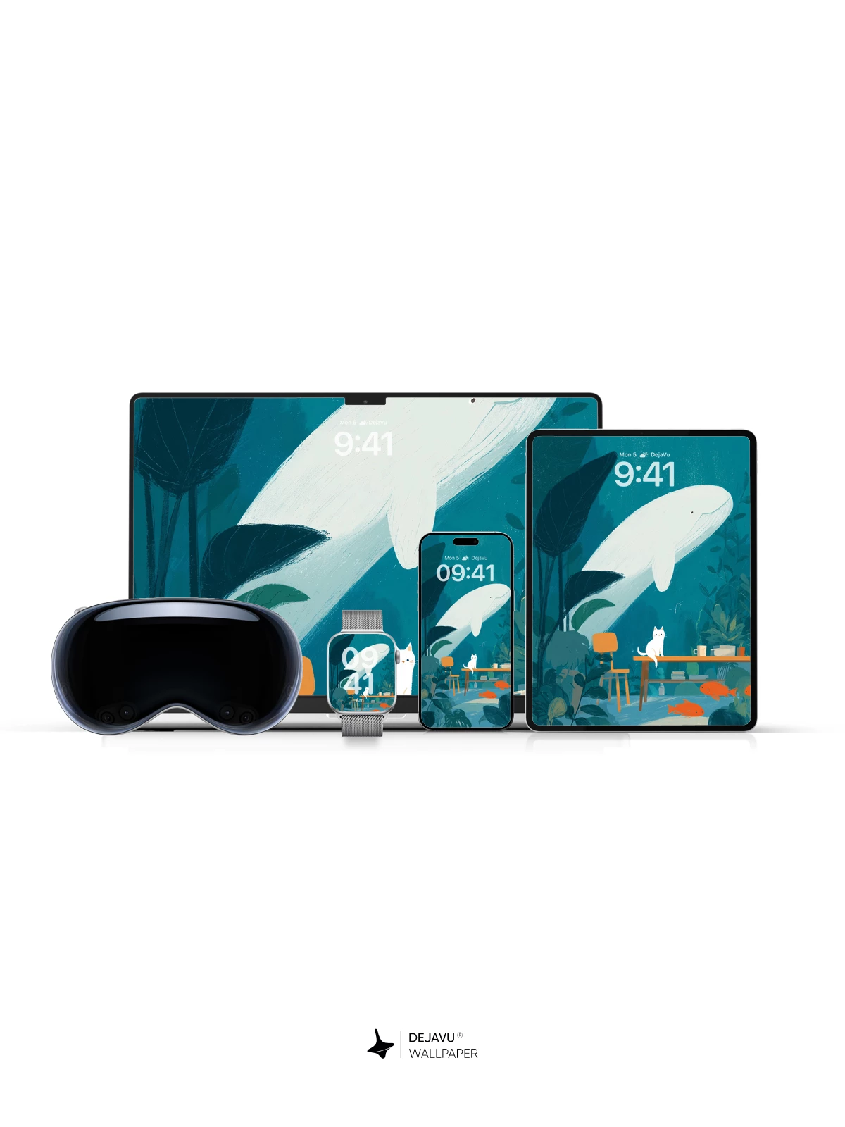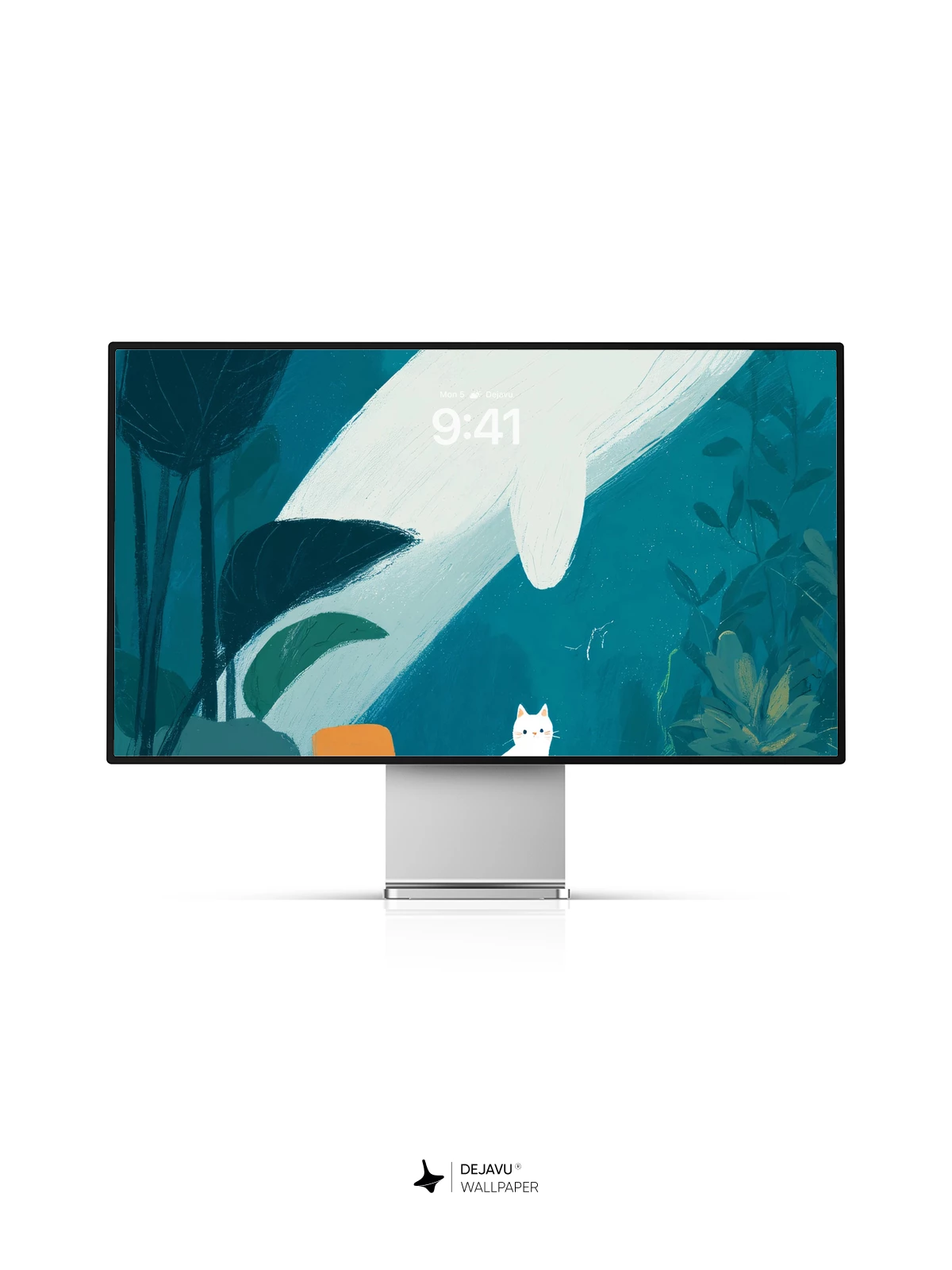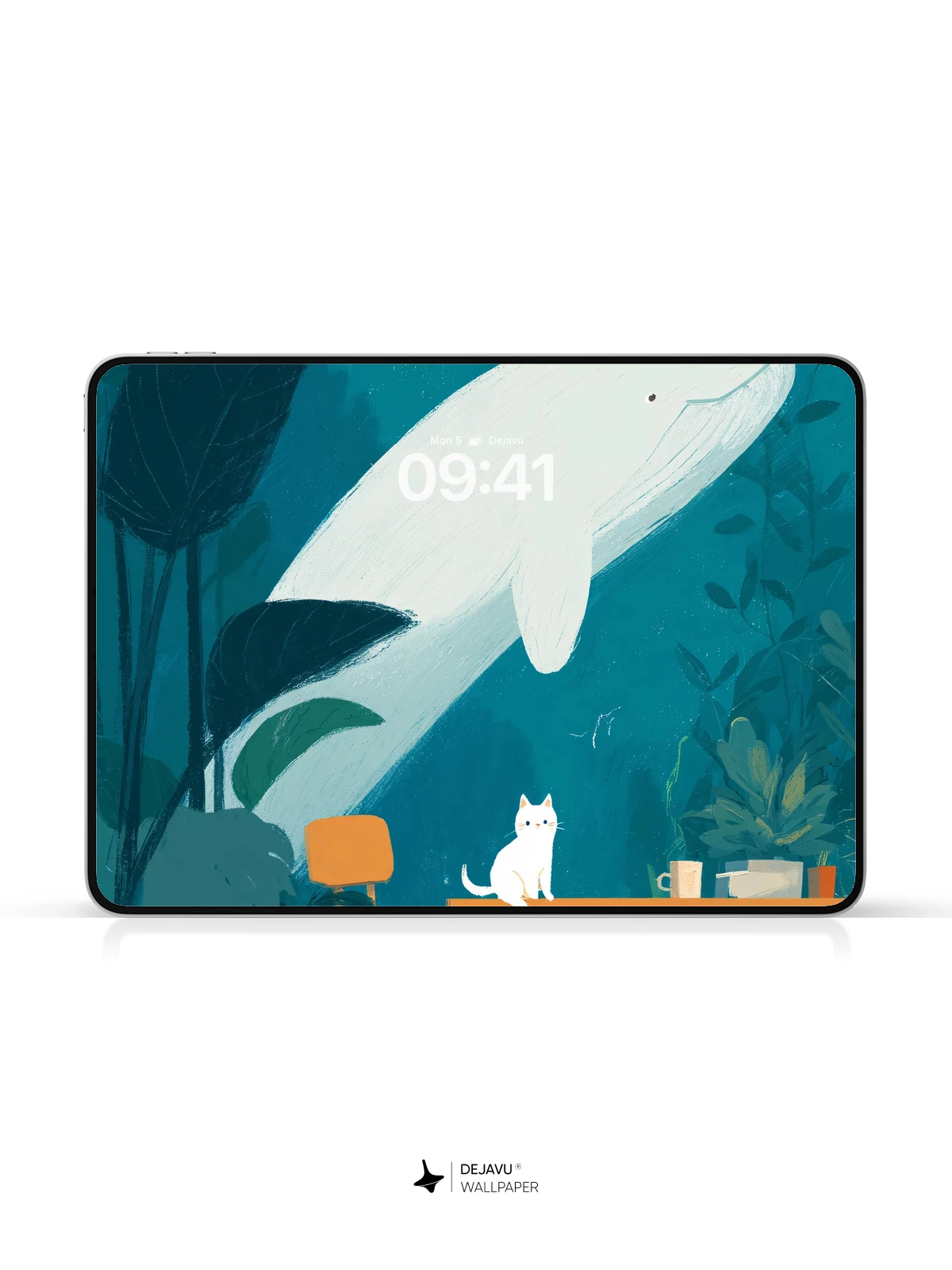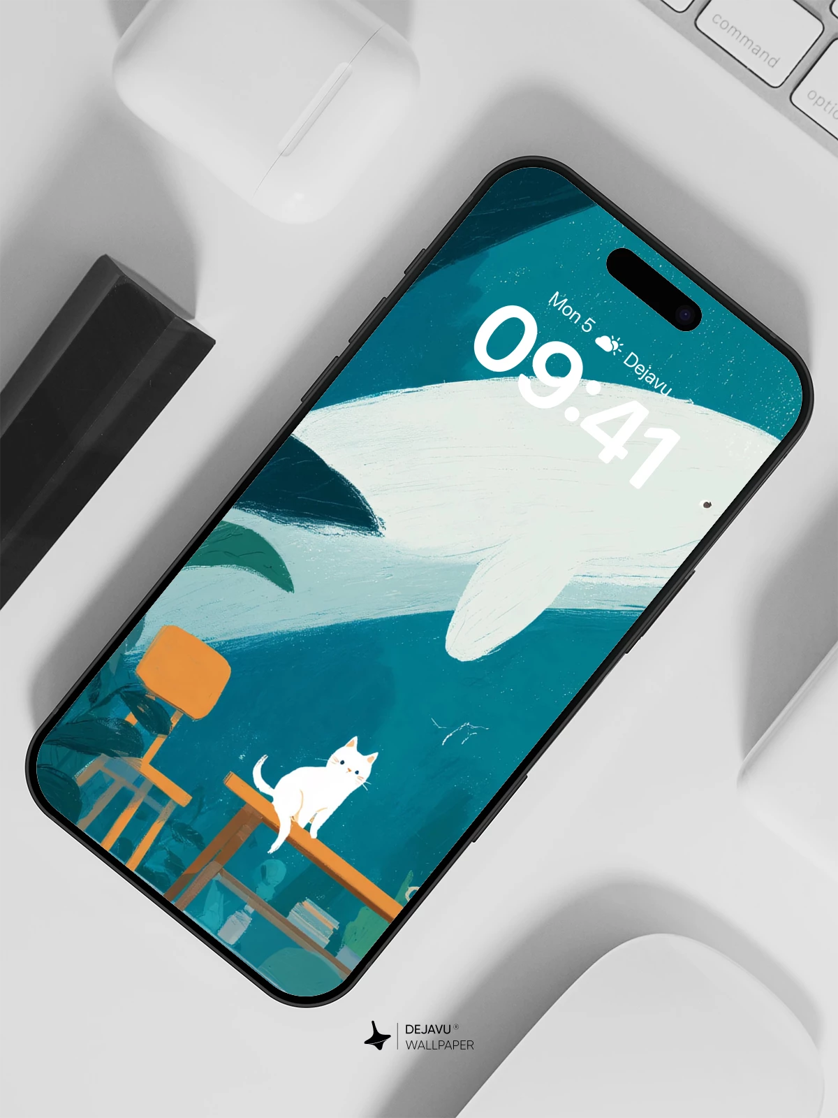 This dreamlike illustration blends fantasy and serenity, depicting a white cat perched on a rustic table beneath a gentle whale swimming through an enchanted underwater forest. Vibrant orange fish dart below, while deep teal hues and floating foliage create a tranquil, otherworldly atmosphere. Inspired by whimsical surrealism, the artwork evokes a sense of peaceful wonder, making it an ideal 8K wallpaper for iPhone, Android, or any mobile device seeking artistic depth and imagination.