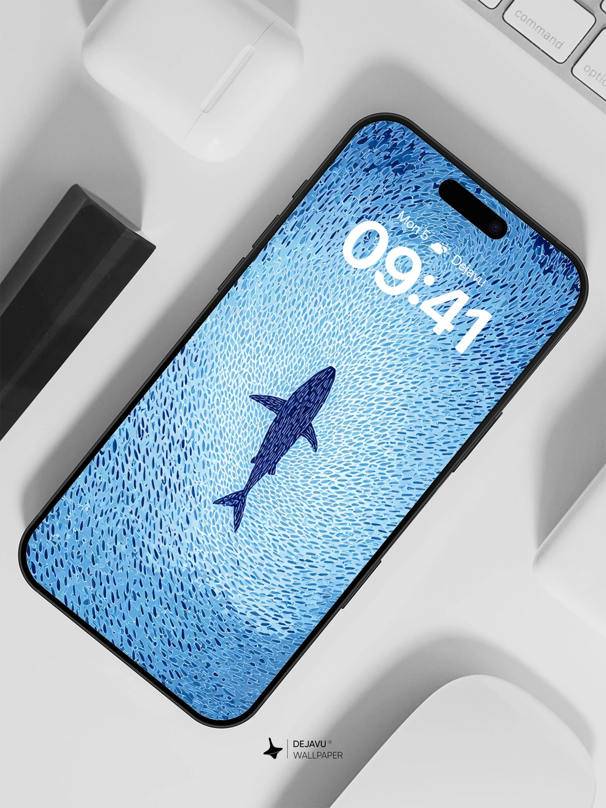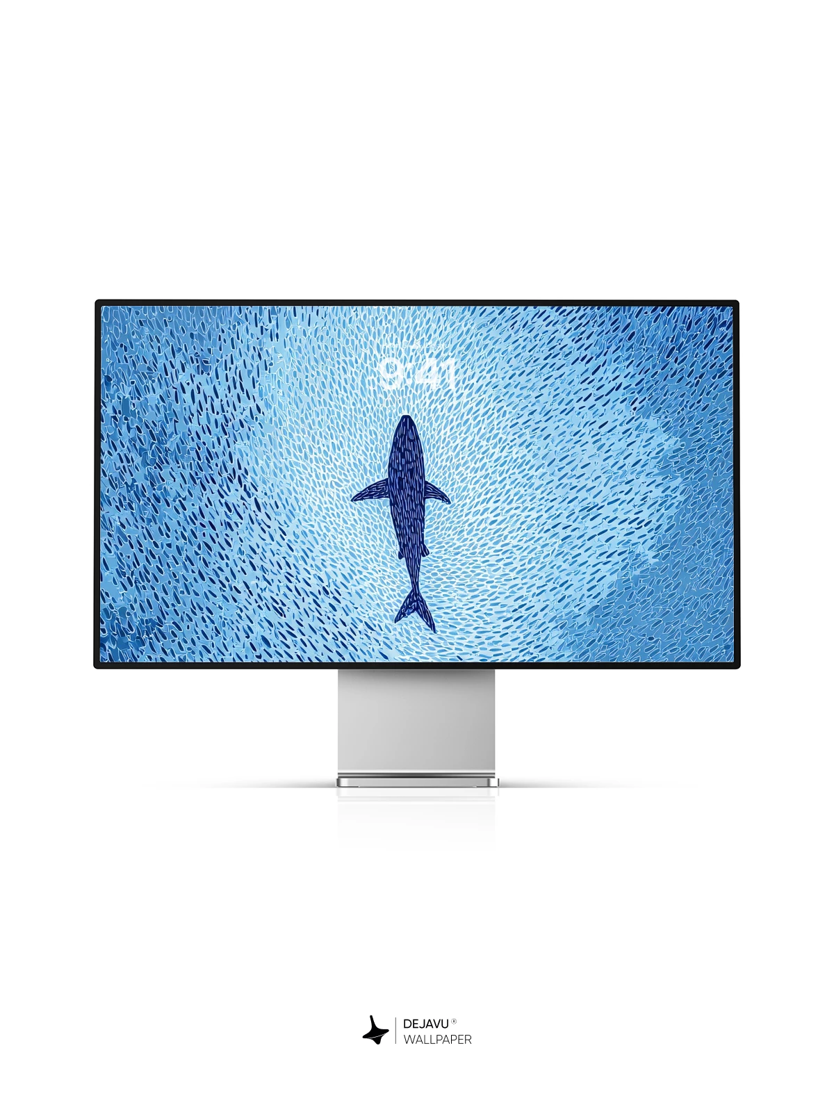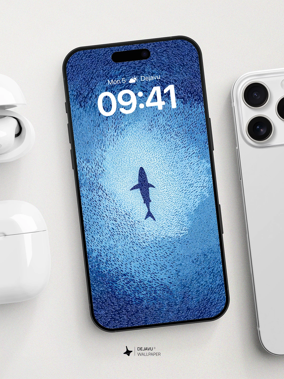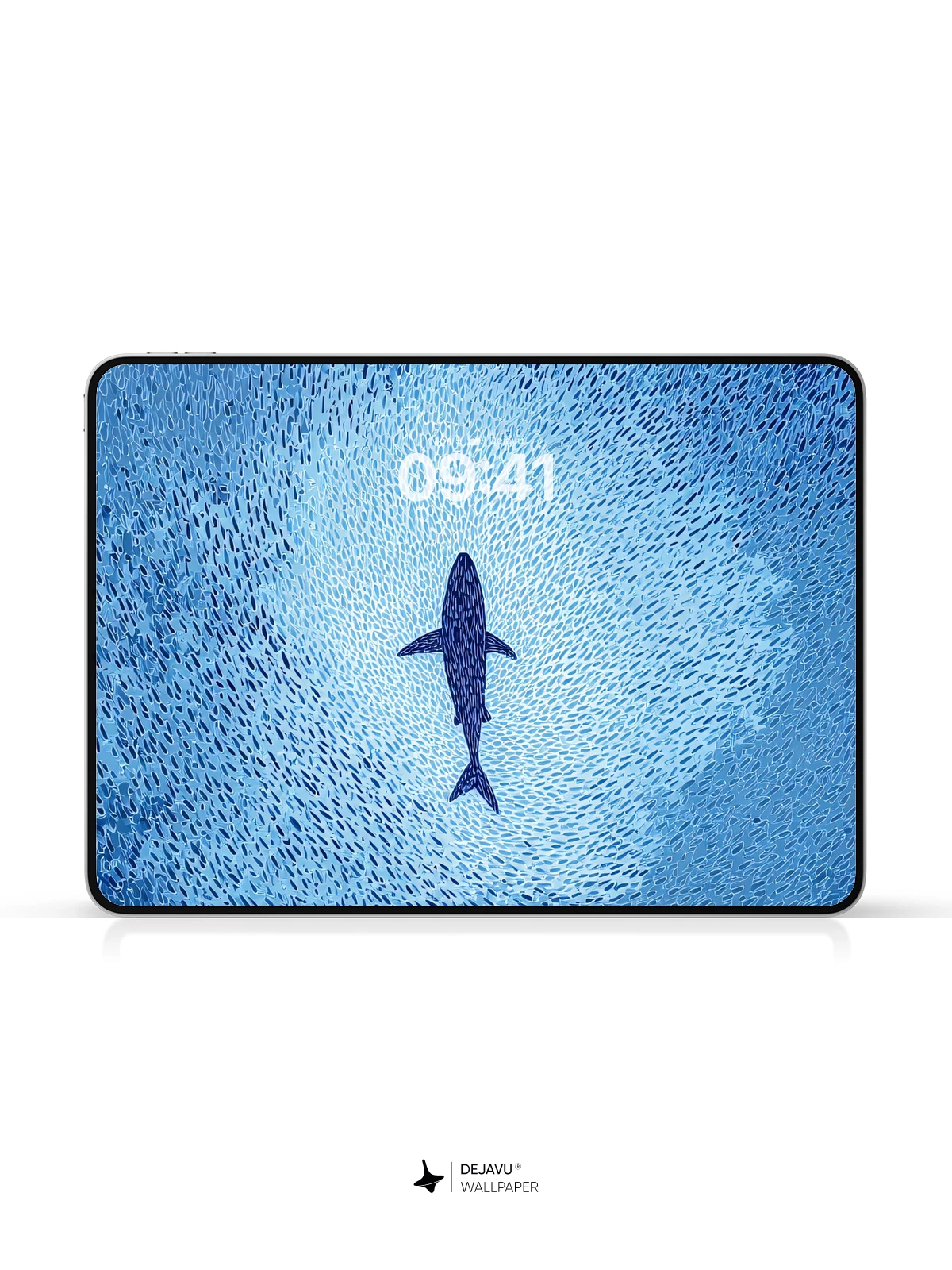 This high-resolution 8K wallpaper features a solitary whale moving through a dense, swirling vortex of fish. The rhythmic patterns and cool blue tones create a calming yet dynamic visual, ideal for modern smartphones and tablets.