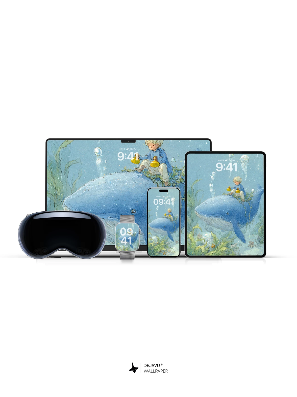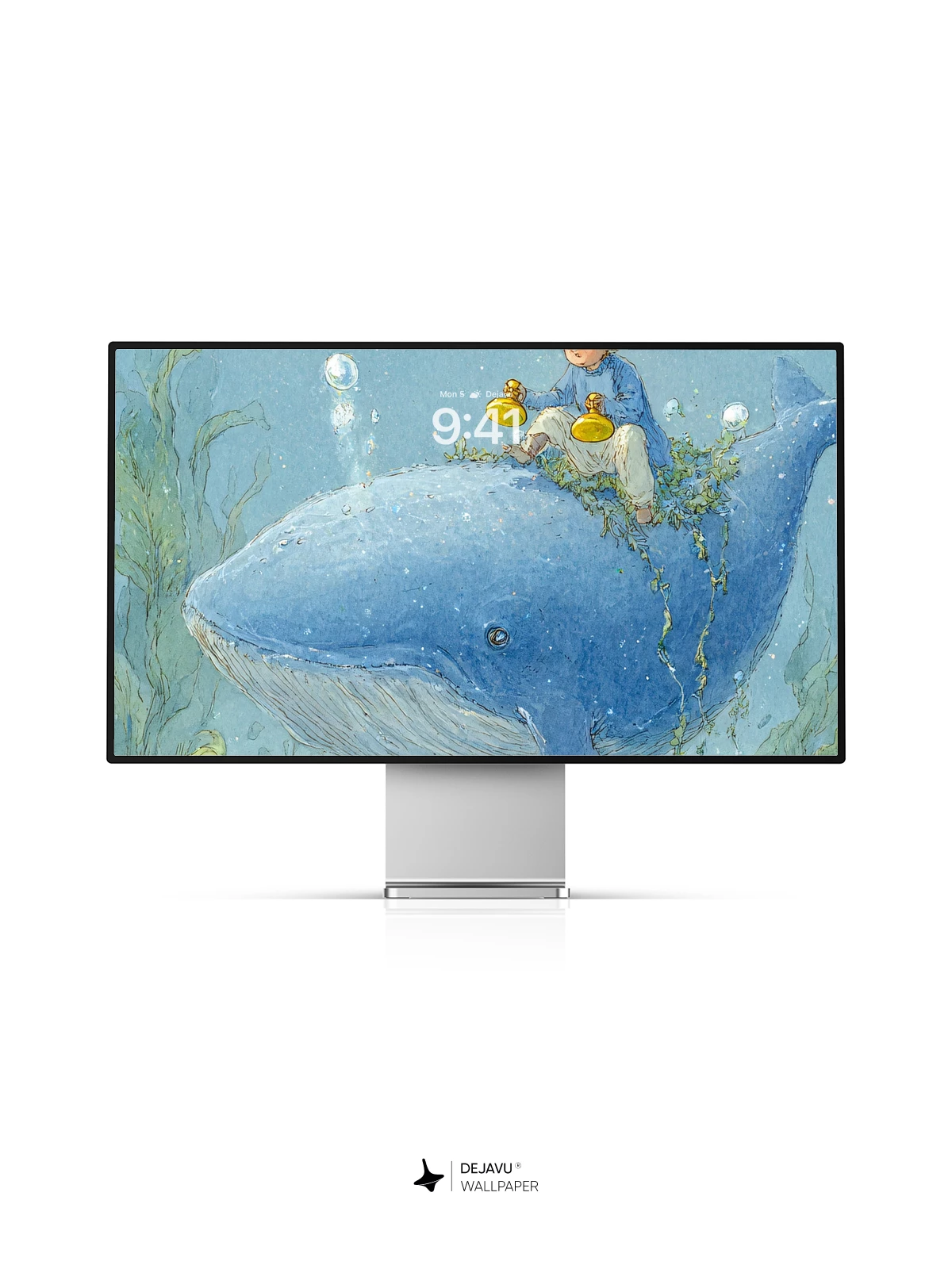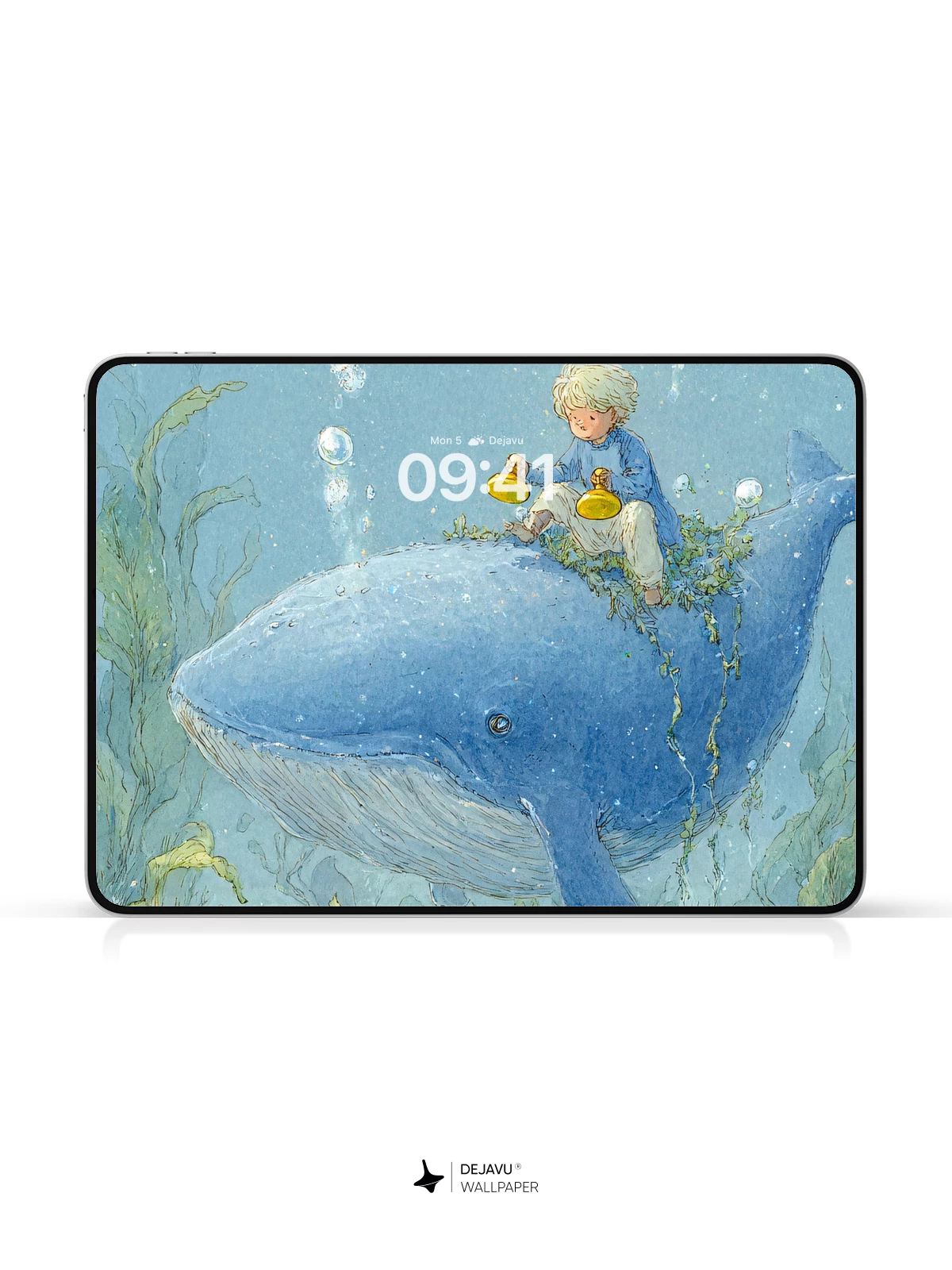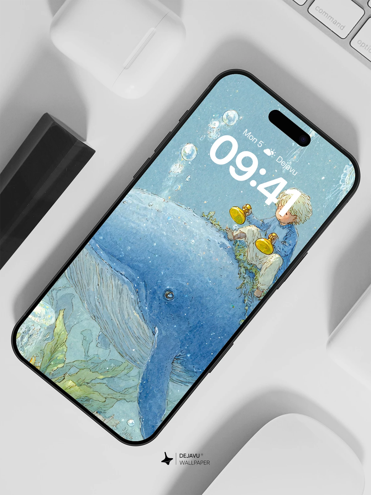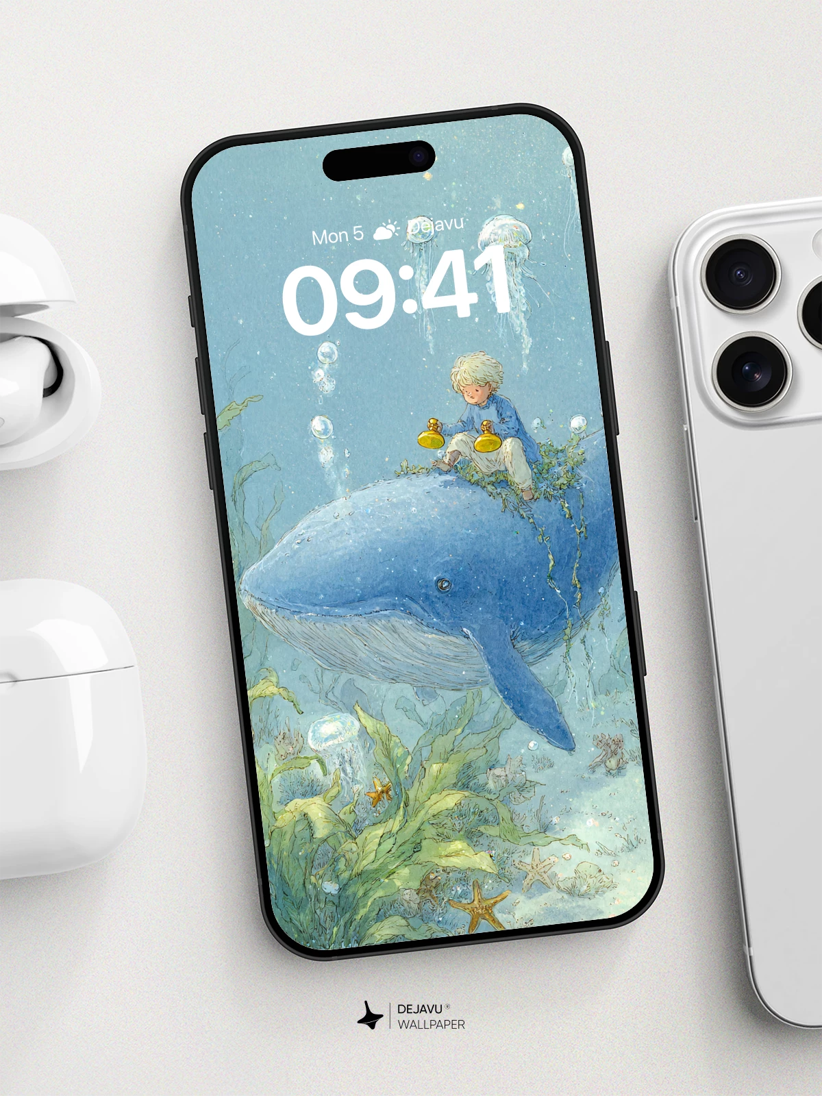 In this enchanting underwater realm, a young child sits atop a serene blue whale, cradling golden bells that shimmer like stars in the ocean’s hush. Jellyfish drift like lanterns above, illuminating a world of soft greens, sea stars, and kelp swaying in the current. The scene evokes a quiet wonder, where imagination floats freely beneath the waves. Inspired by dreamlike fantasy art, this 8K wallpaper brings ethereal beauty to your iPhone, Android, or tablet—transforming your screen into a portal to an aquatic fairy tale.