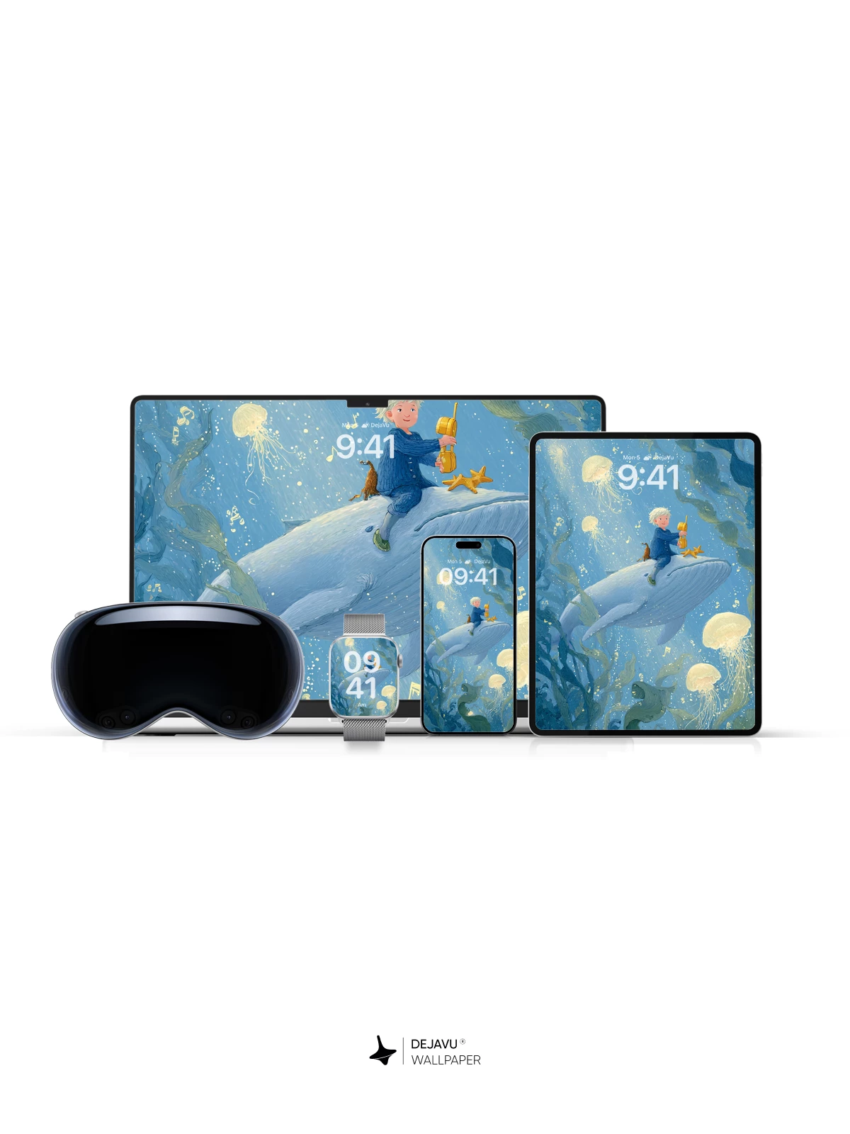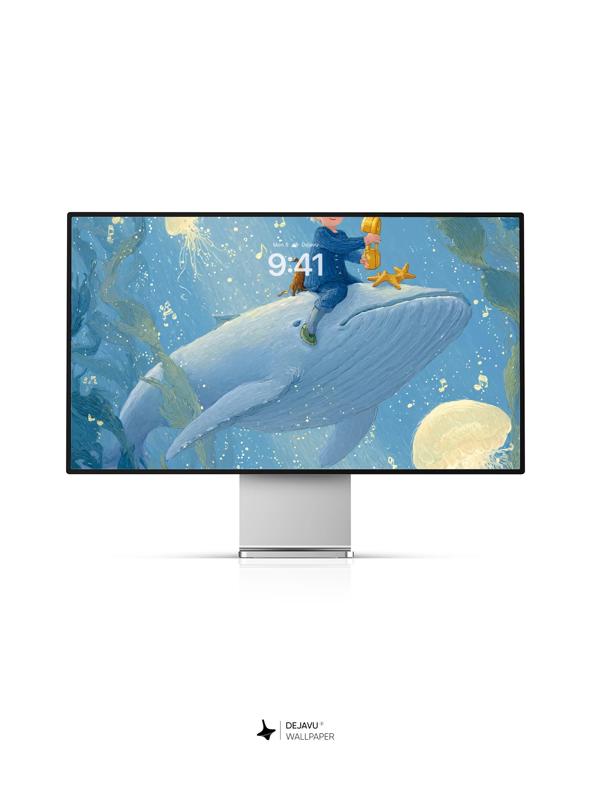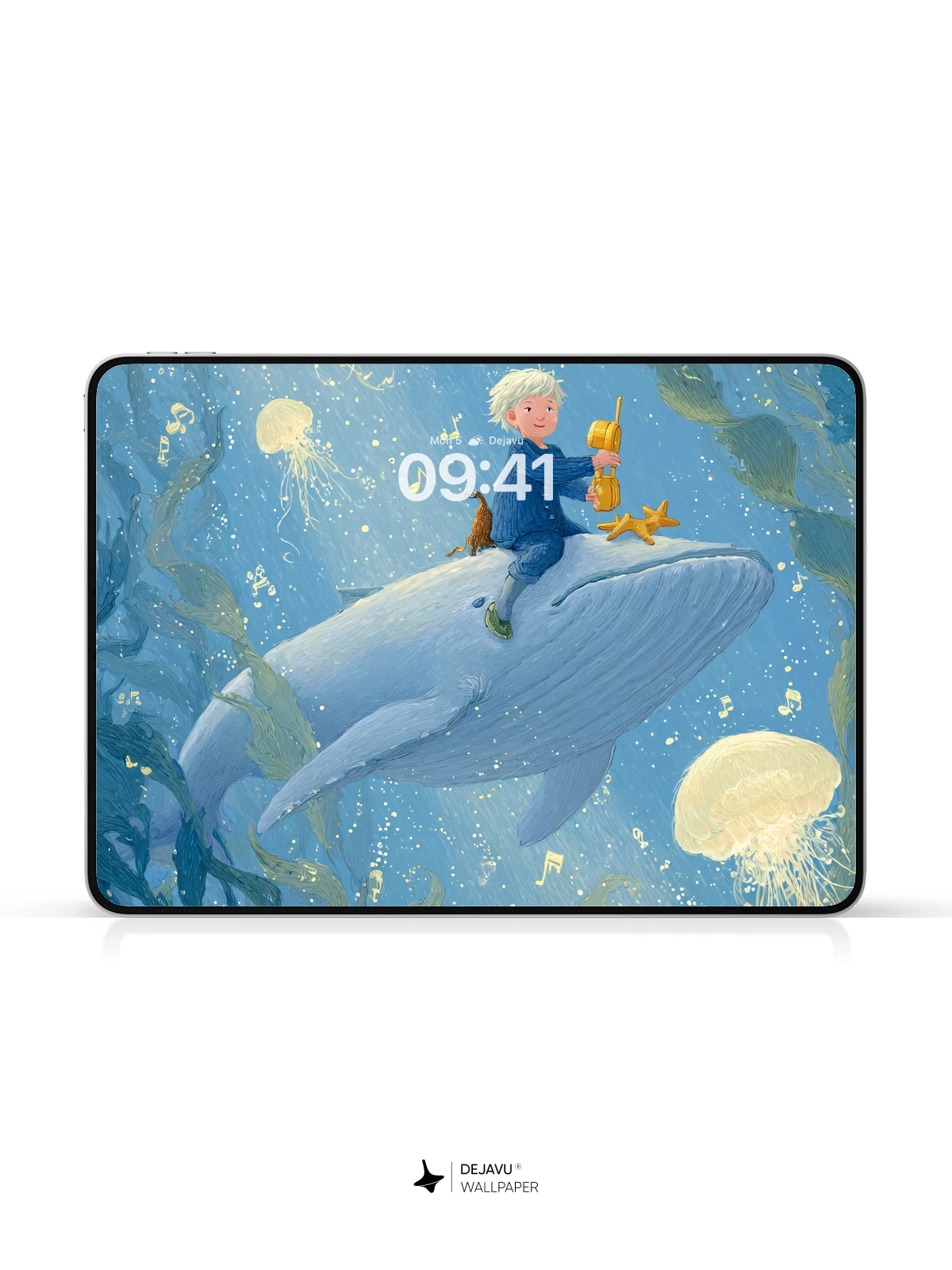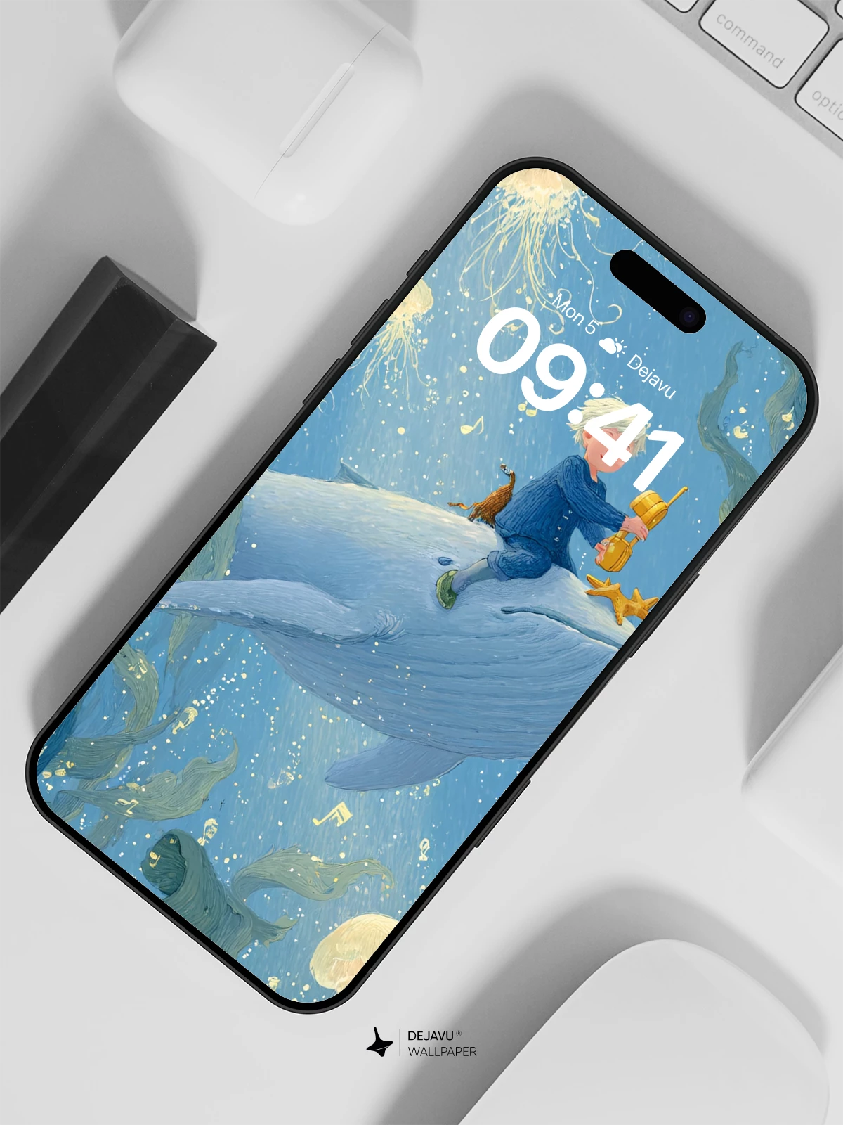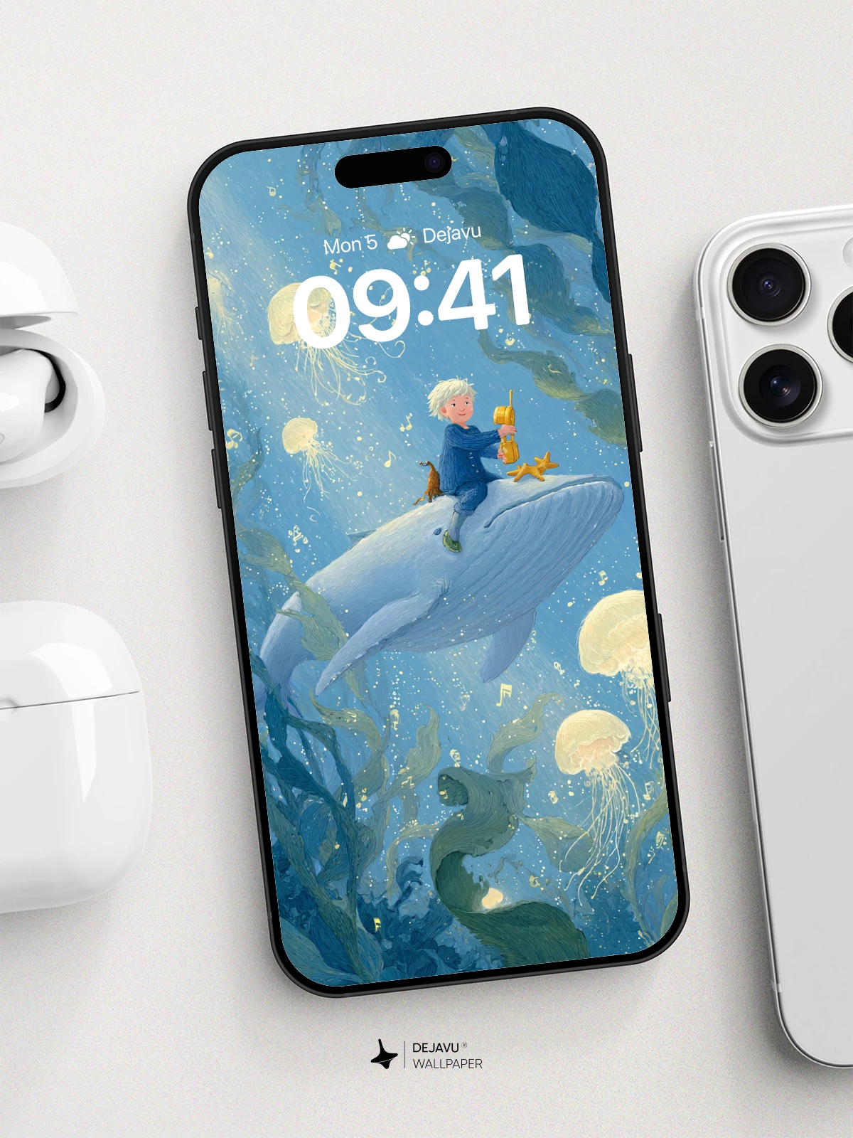 In this enchanting fantasy scene, a young boy with silver hair sits atop a serene blue whale, playing a golden instrument that emits floating musical notes. Surrounded by luminous jellyfish, swaying kelp, and sparkling particles, the ocean becomes a symphony of wonder. This surreal underwater dream blends innocence and imagination, creating a captivating visual experience ideal for 8K wallpapers on iPhone, Android, or tablets. The soft pastel blues and delicate details evoke a sense of calm and magic, making it a timeless choice for those who love imaginative art.