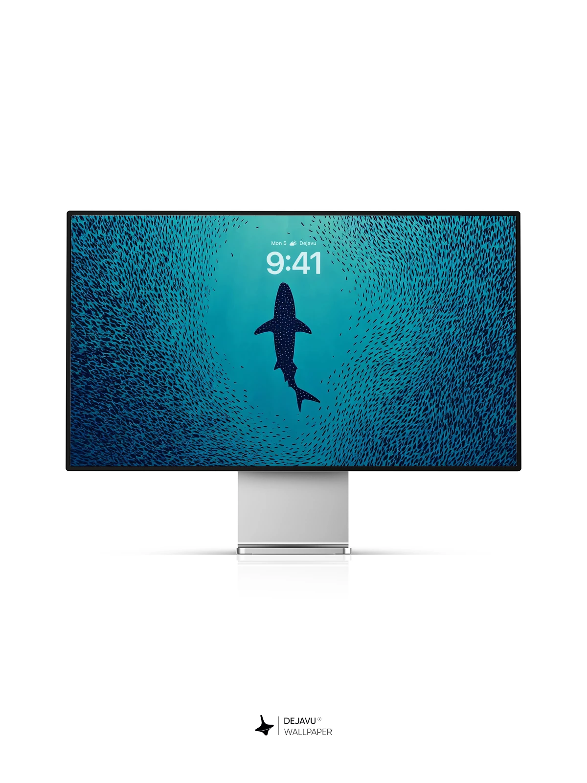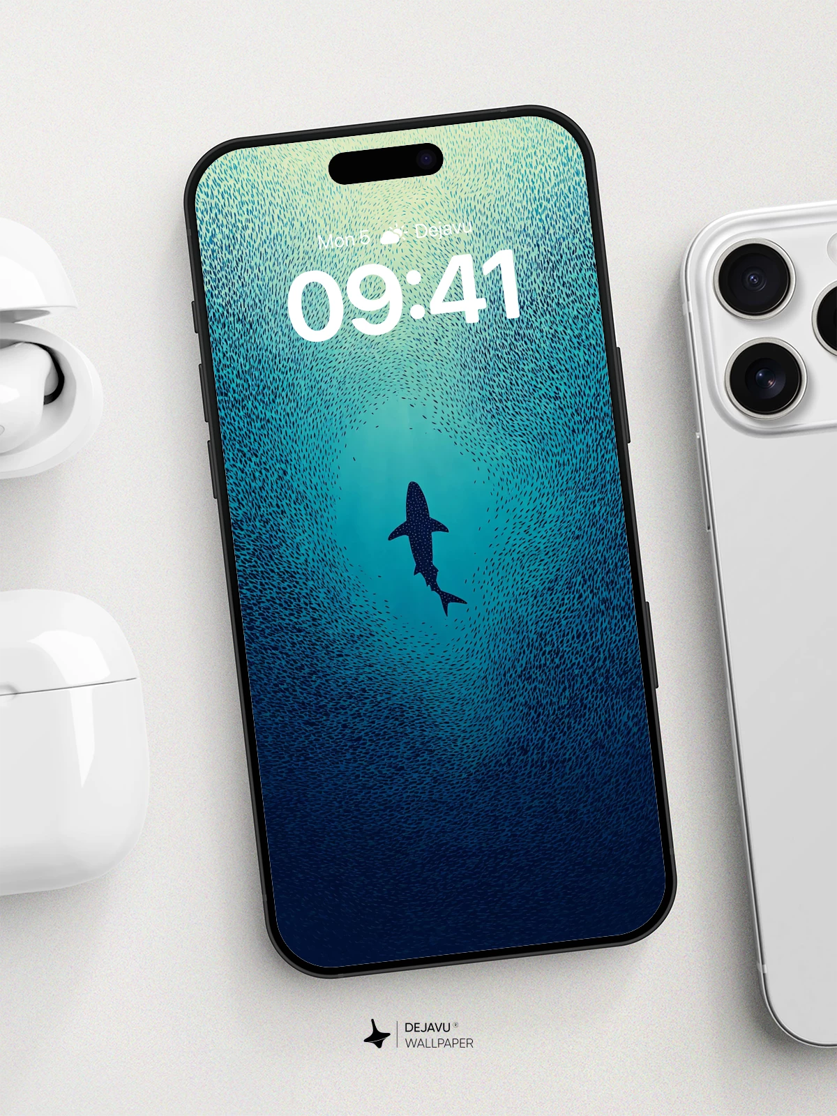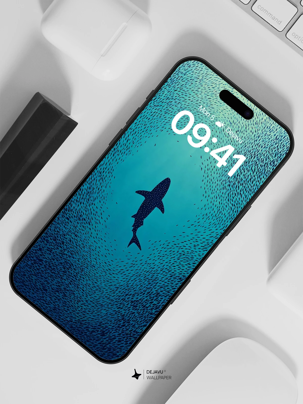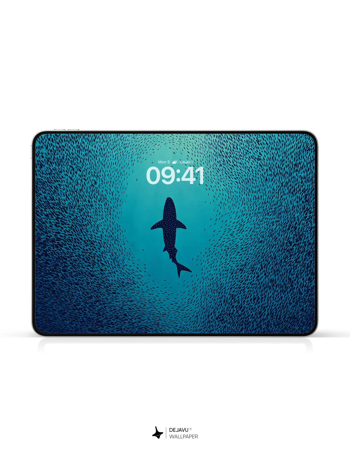 The composition centers on a solitary whale shark moving through a dense, spiraling school of baitfish. The cool blue gradient and natural lighting create a sense of vast depth. This high-resolution image is optimized for iPhone and Android screens, bringing a quiet, immersive marine moment to your device.