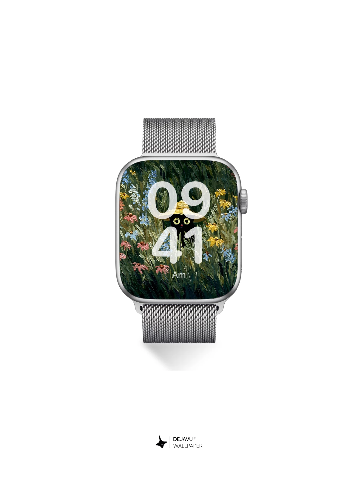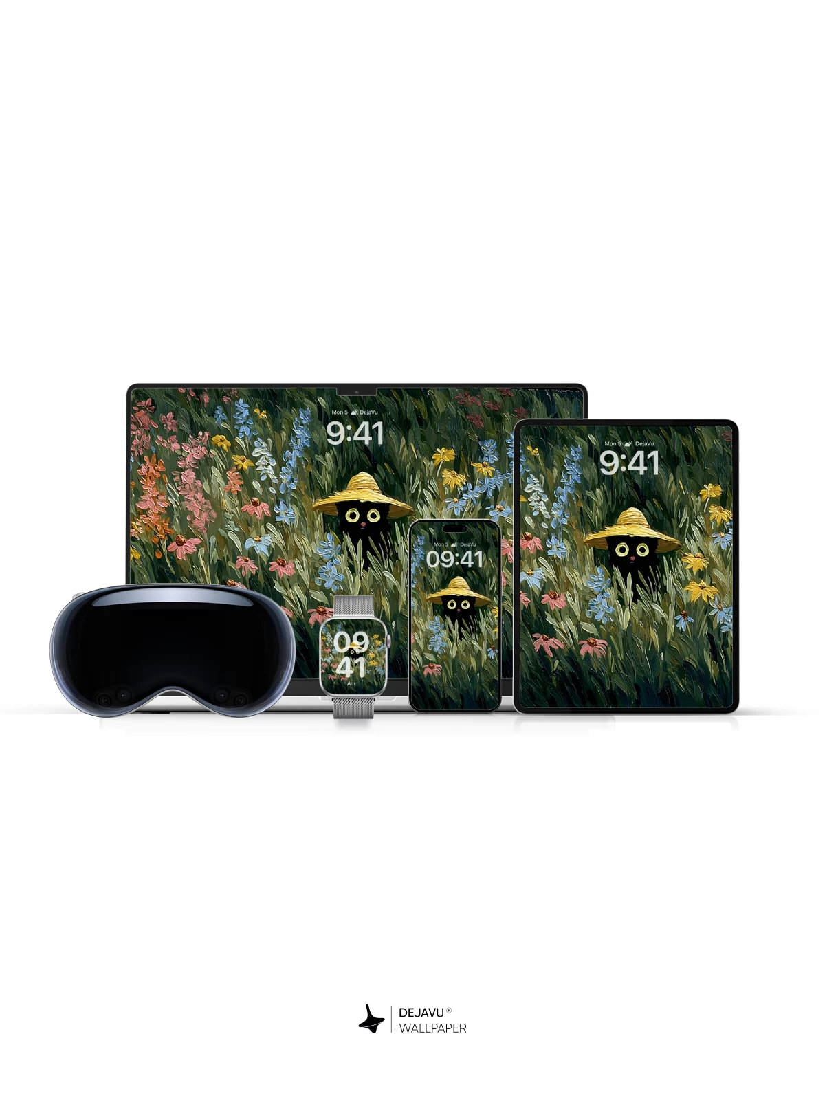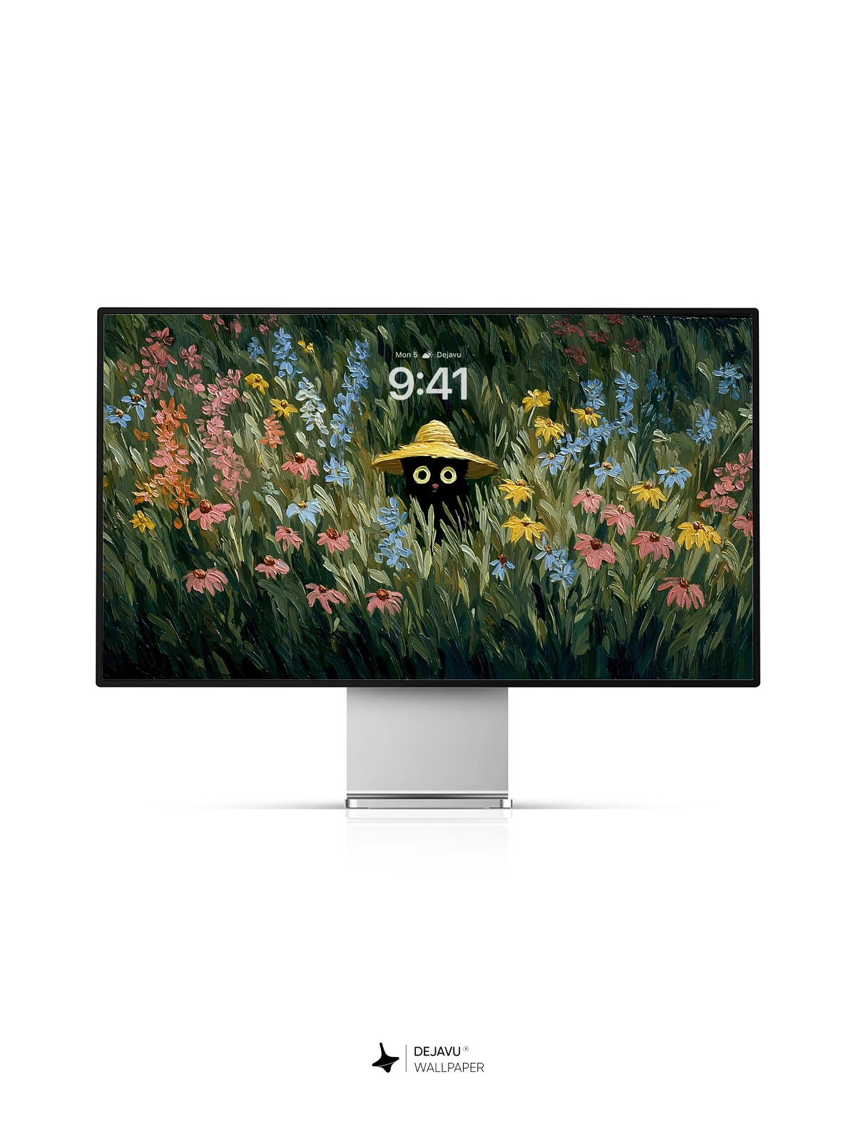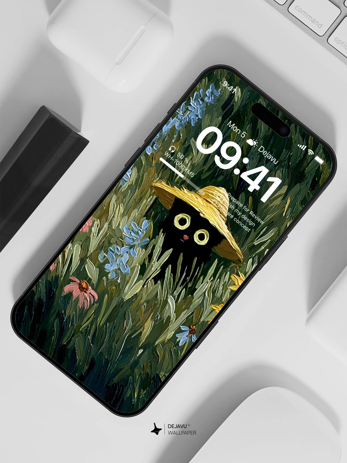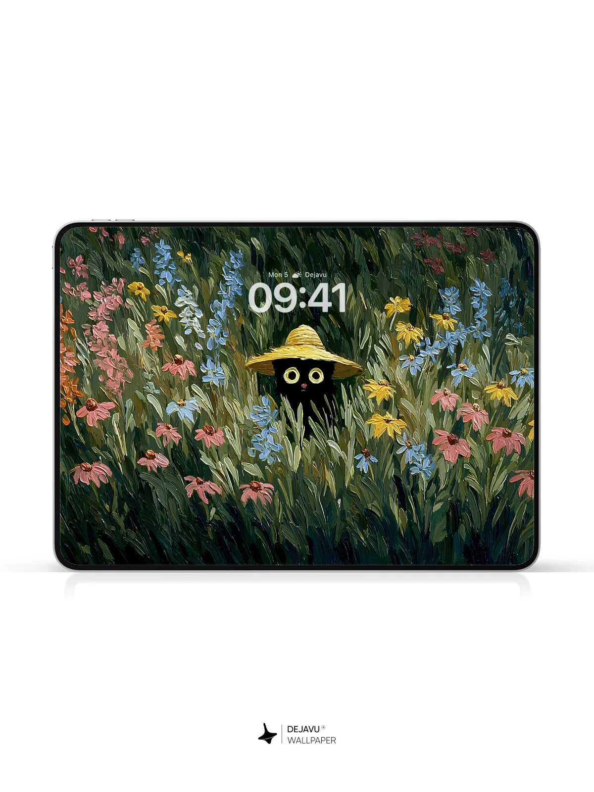 Immerse yourself in this charming 8K wallpaper, where a black cat with a straw hat blends seamlessly into a colorful tapestry of wildflowers. The playful scene, reminiscent of storybook illustrations, brings a sense of wonder and tranquility to your device. Ideal for iPhone, Android, and tablet screens, this design adds a unique, artistic flair to your daily digital experience.