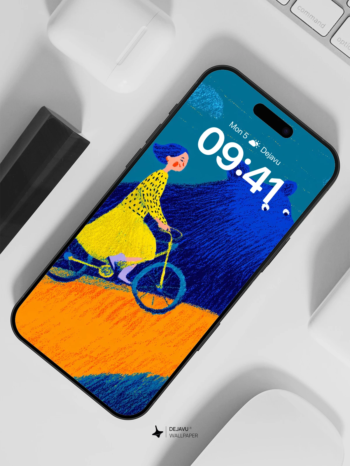 This enchanting artwork blends whimsy and wonder with a young girl in a yellow dress cycling alongside a gentle, oversized blue bear on a sunlit hill. The surreal imagery, rendered in bold colors and expressive brushwork, evokes a sense of childhood magic and imaginative freedom. Inspired by contemporary illustrative styles, the scene is ideal as an 8K wallpaper for iPhone, Android, or tablets, bringing a touch of fantasy to your daily digital experience.