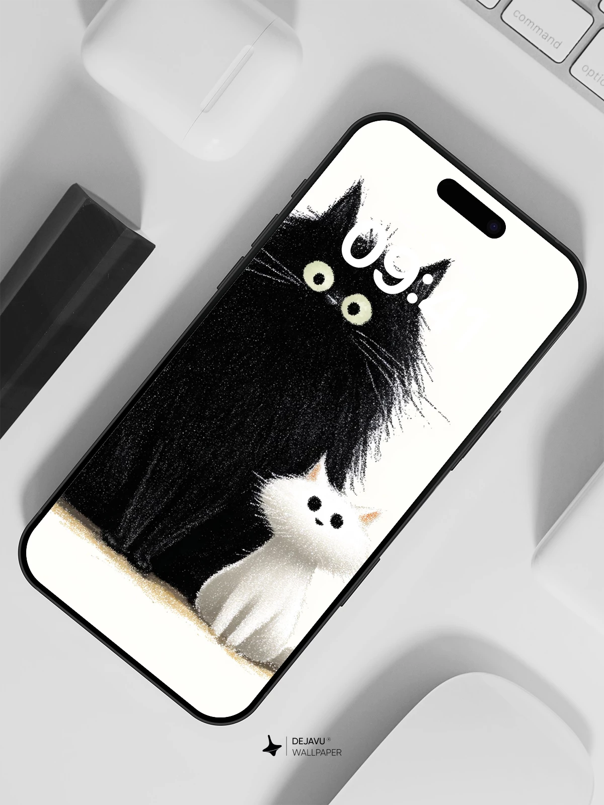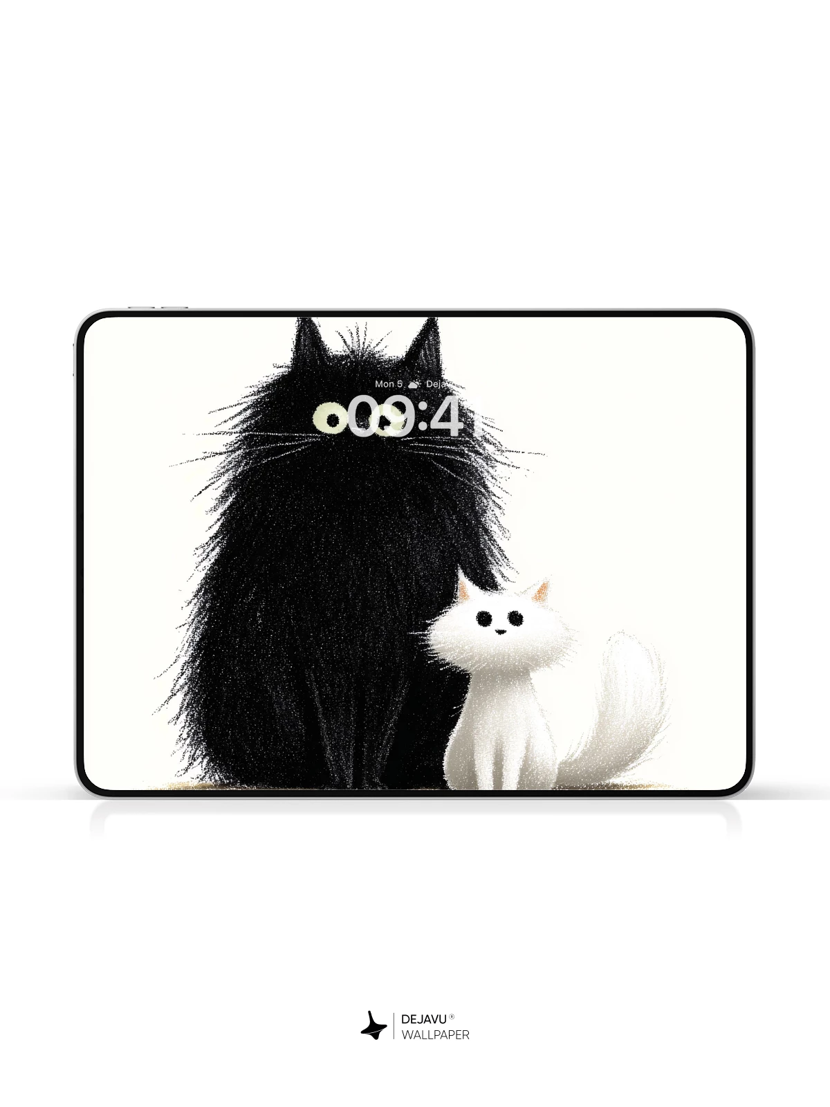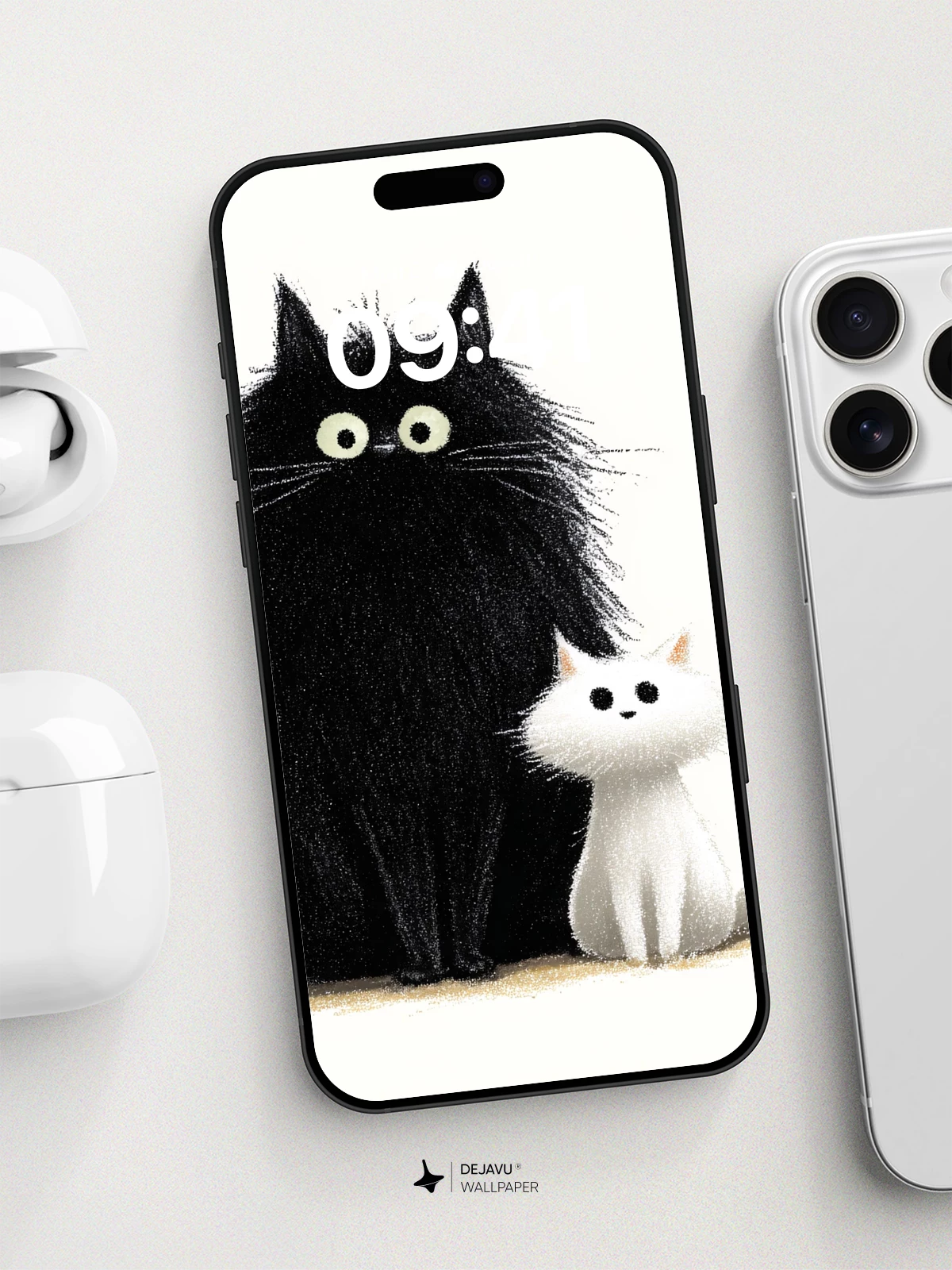 This delightful illustration features a large, fluffy black cat with wide eyes sitting beside a small, soft white kitten, creating a heartwarming contrast of size and color. The playful yet serene composition exudes charm and warmth, making it ideal as a high-resolution 8K wallpaper for iPhone, Android, or any mobile device. With its cartoonish elegance and gentle humor, this artwork brings a touch of joy to your screen, perfect for those who love cats and whimsical art.