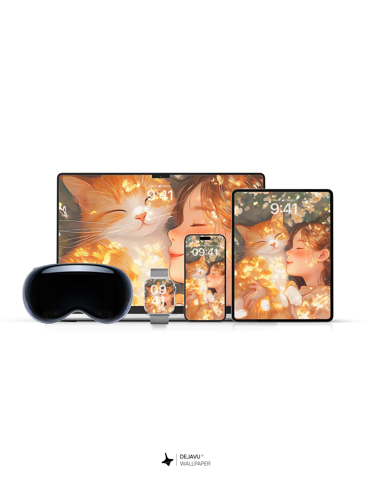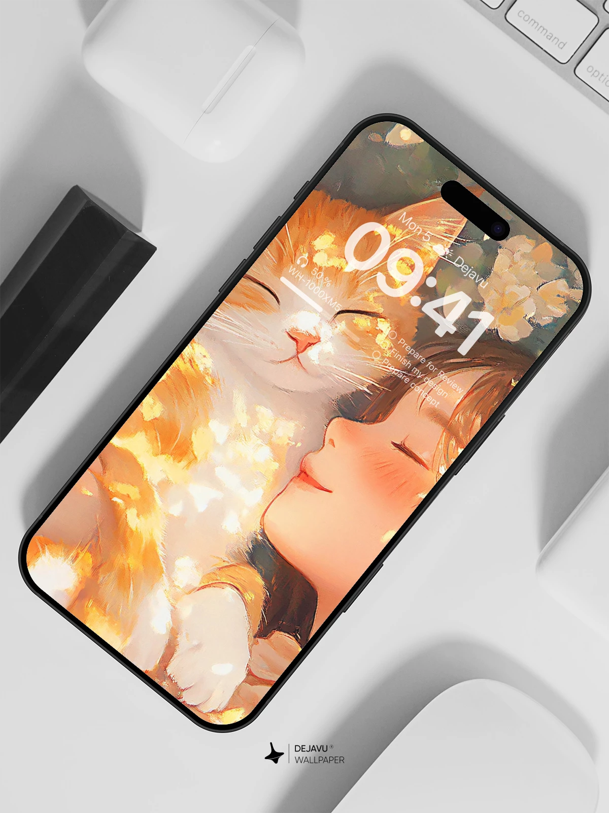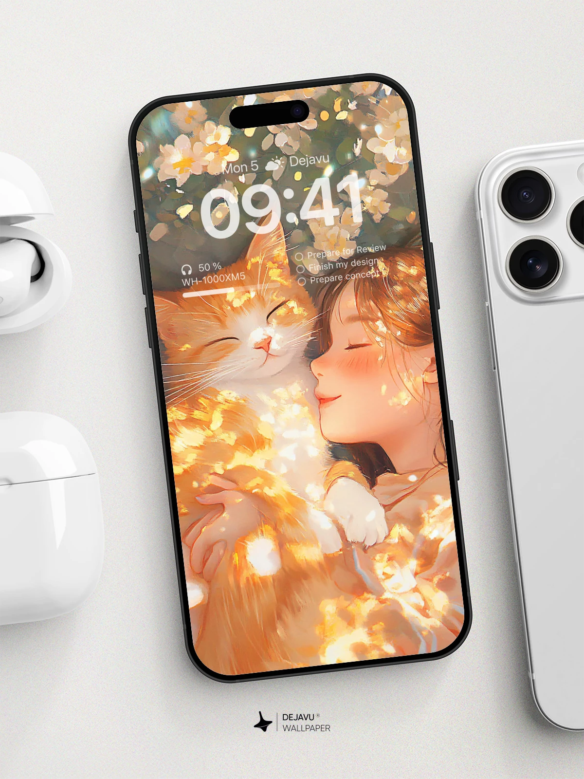 Immerse yourself in the heartwarming embrace of a girl and her fluffy orange cat, captured in a dreamlike setting adorned with golden blossoms. This 8K wallpaper, ideal for iPhone and Android devices, exudes a sense of serene joy and timeless companionship. The soft, glowing light and delicate floral backdrop create a magical atmosphere, evoking feelings of peace and affection. Whether displayed on a phone, tablet, or any screen, this artwork brings a touch of whimsical charm and emotional depth to your digital space, making it a delightful choice for those who appreciate creative and high-quality visual designs.