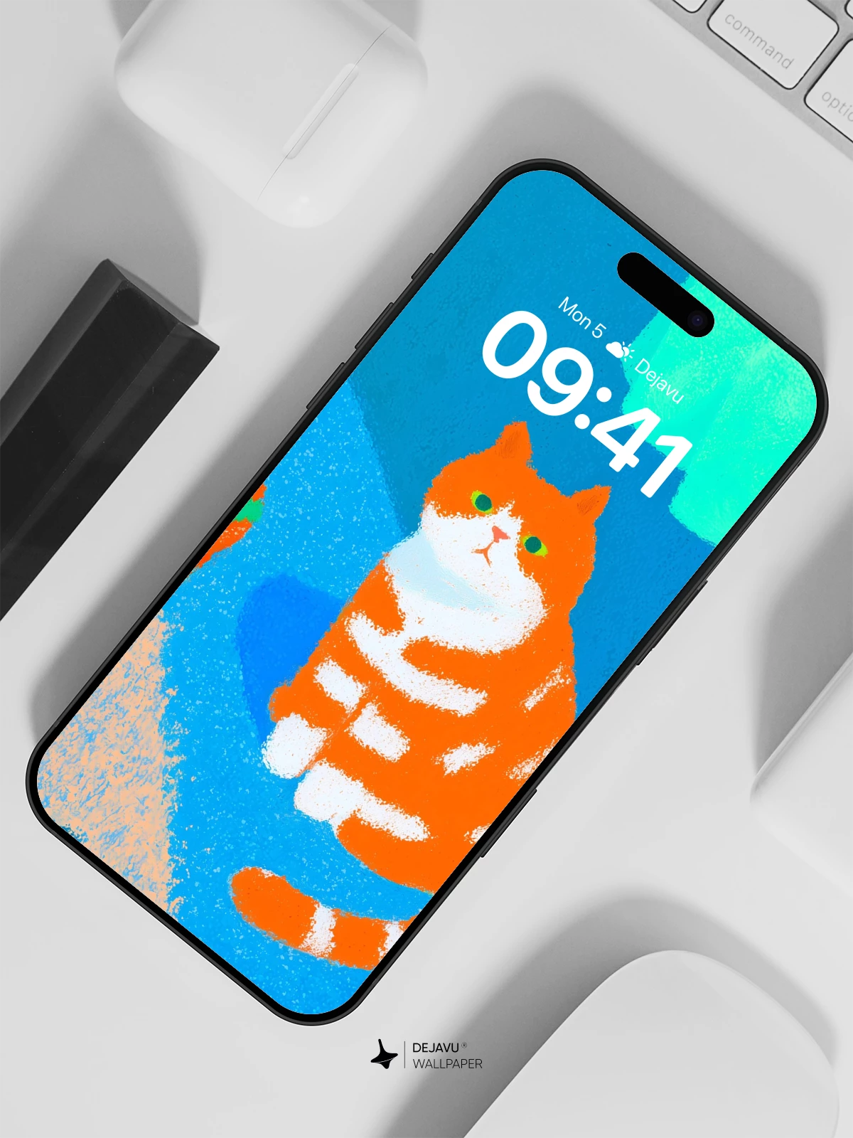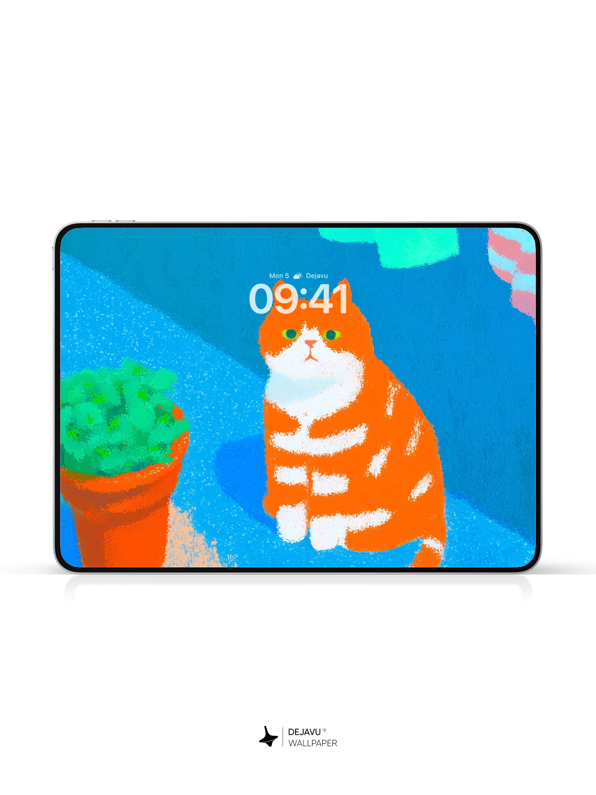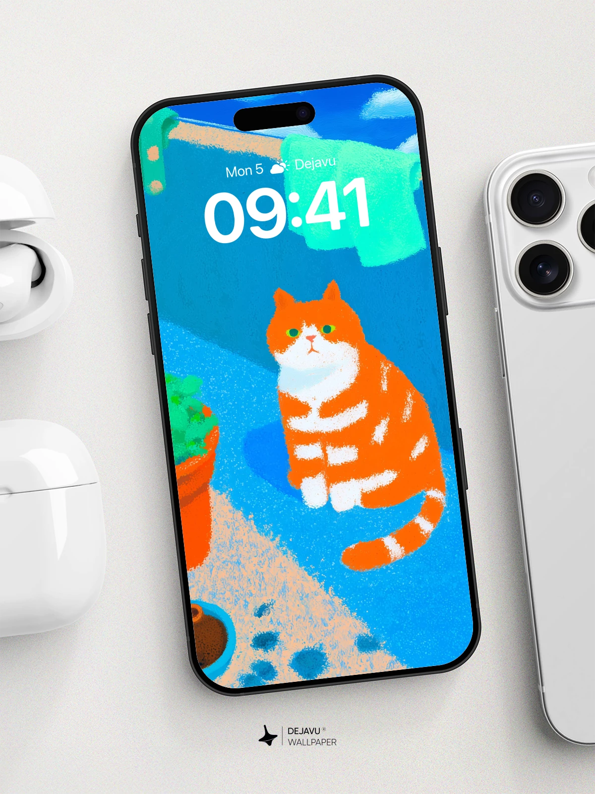 This delightful illustration features a cozy outdoor scene where a striped orange cat lounges beside a terracotta planter, beneath a clothesline fluttering with pastel towels. The vivid palette and soft brushstrokes evoke a joyful, cartoon-style aesthetic, ideal for brightening any iPhone or Android device. With its sunny mood and playful details, this 8K wallpaper brings warmth and whimsy to your screen.