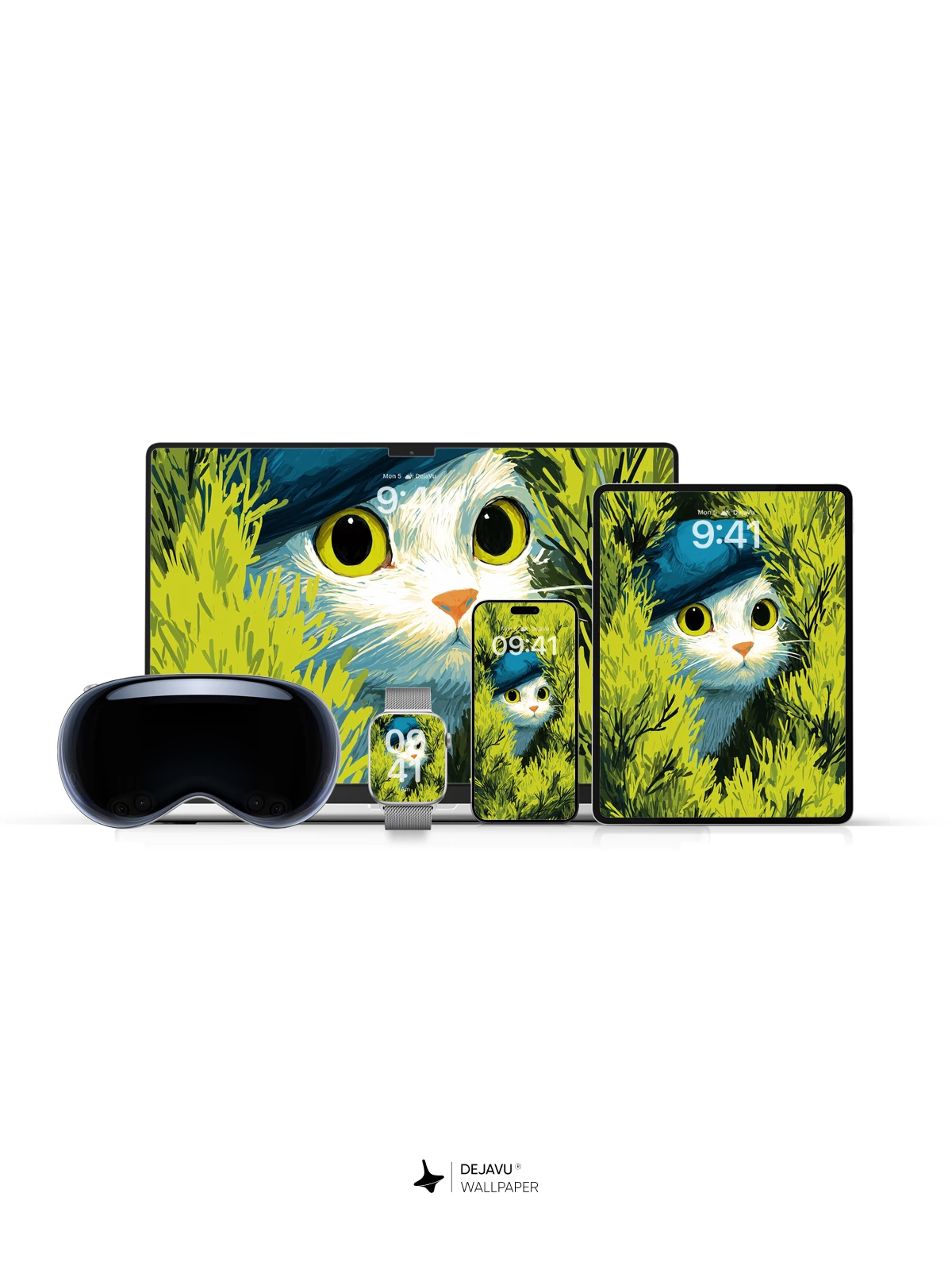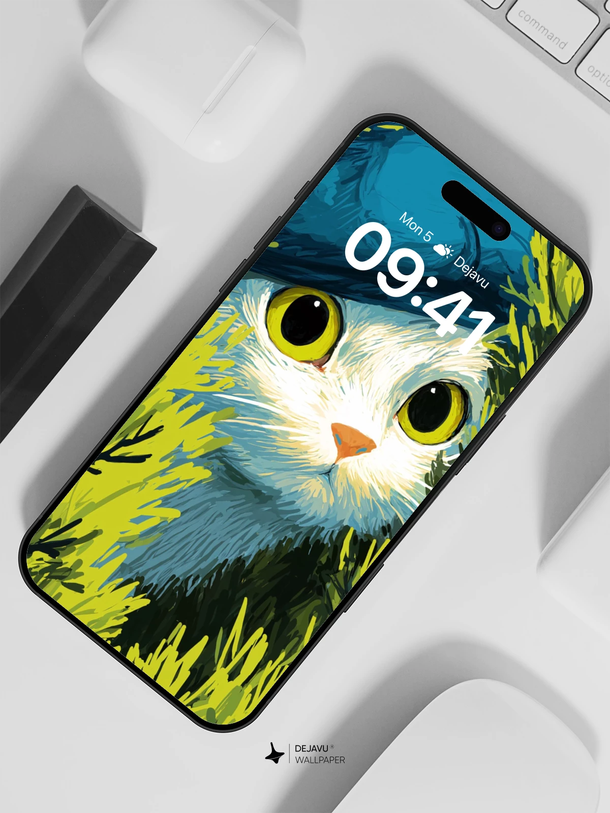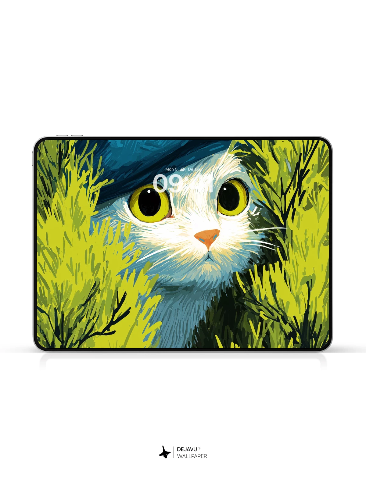 This enchanting 8K wallpaper features a curious white cat wearing a stylish blue hat, peeking through lush, sunlit greenery with vivid detail and expressive yellow eyes. Inspired by whimsical illustration art, the scene blends nature and fantasy into a delightful, dreamlike moment—ideal for iPhone, Android, or tablet screens. The rich textures and bold colors evoke a sense of wonder, making it a perfect choice for those who love quirky, artistic mobile backgrounds.