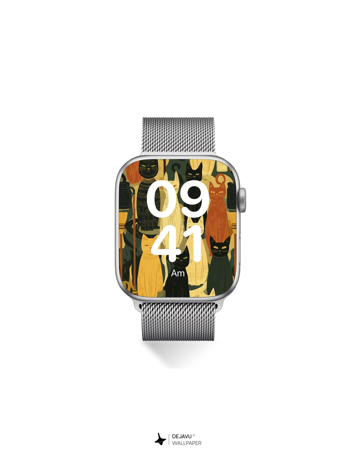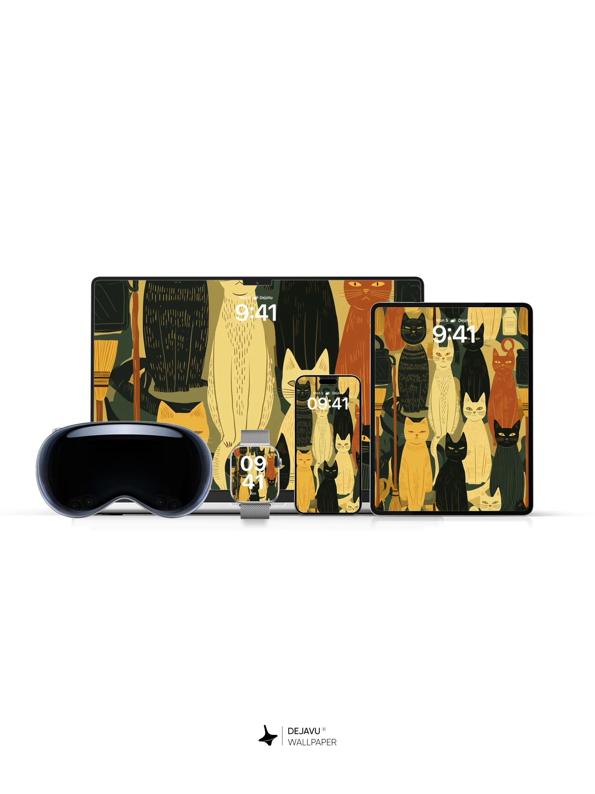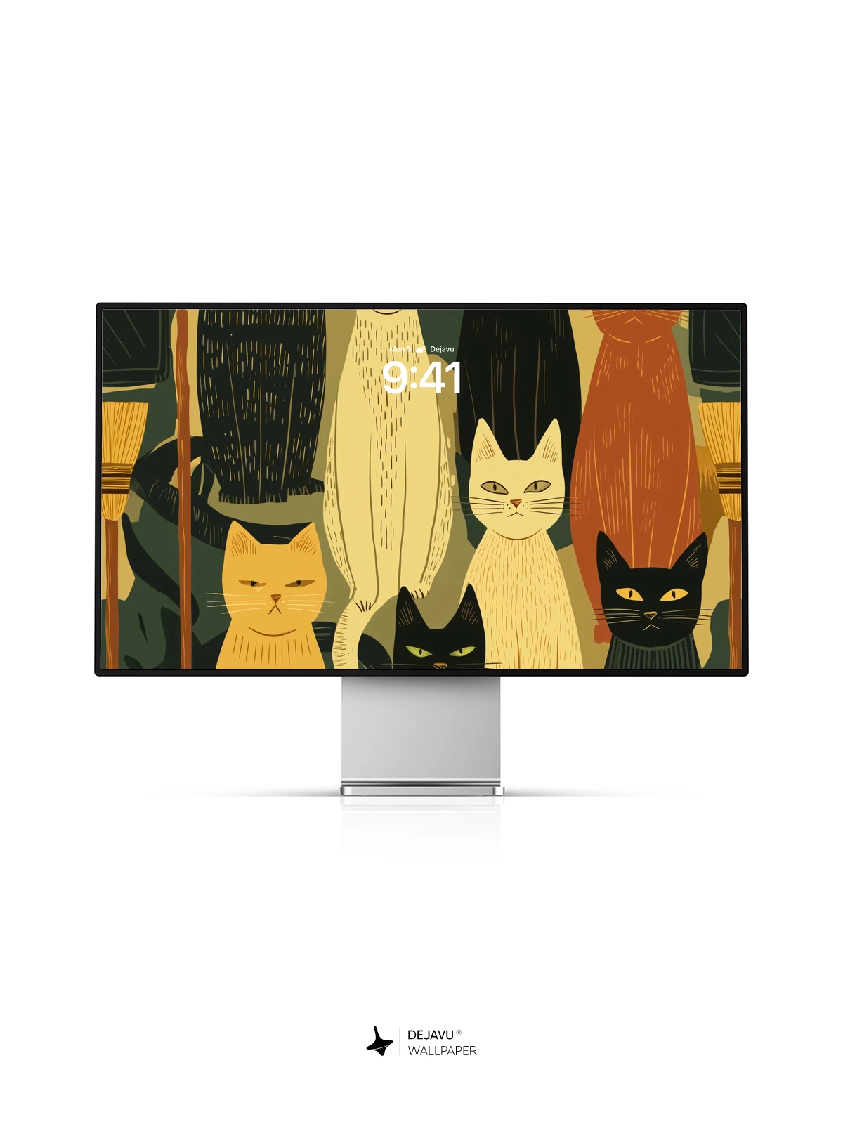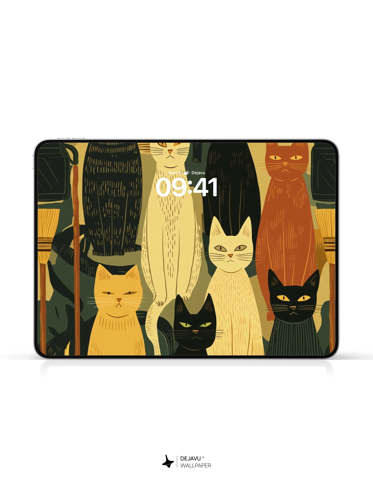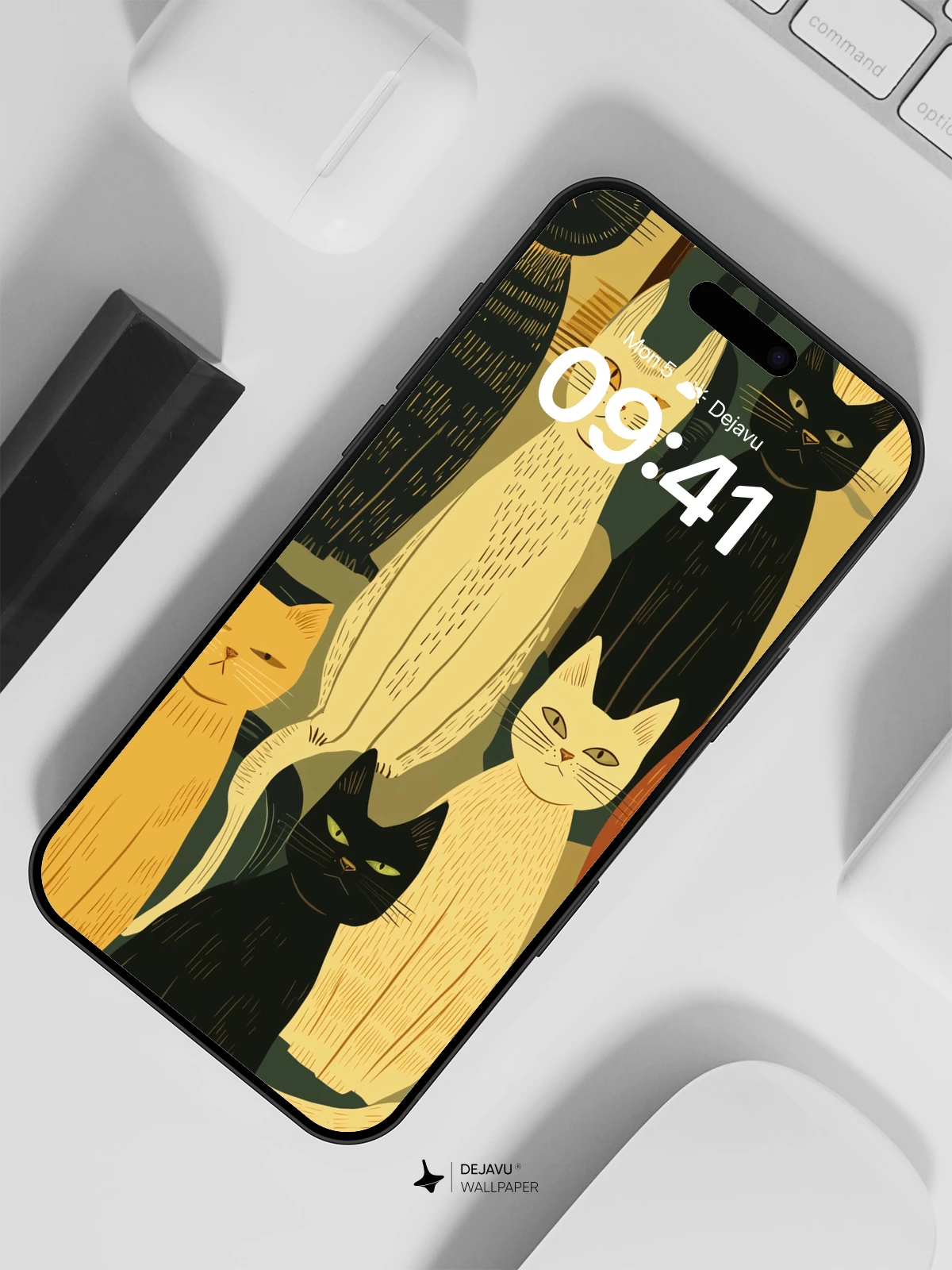 This delightful 8K wallpaper blends retro charm with modern appeal, showcasing a group of elegantly illustrated cats in rich hues and intricate textures. Inspired by mid-century graphic design, the artwork captures a whimsical, almost theatrical mood where each feline stands poised like a character from a storybook. The repeating pattern is ideal for iPhone, Android, and tablet screens, offering a unique blend of nostalgia and creativity that elevates everyday digital life.