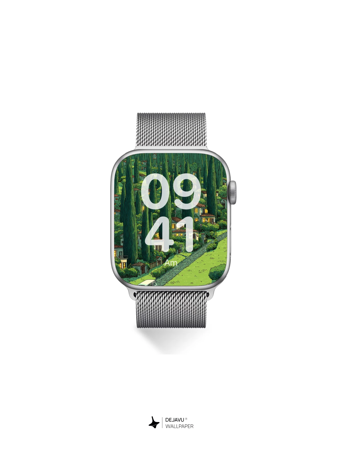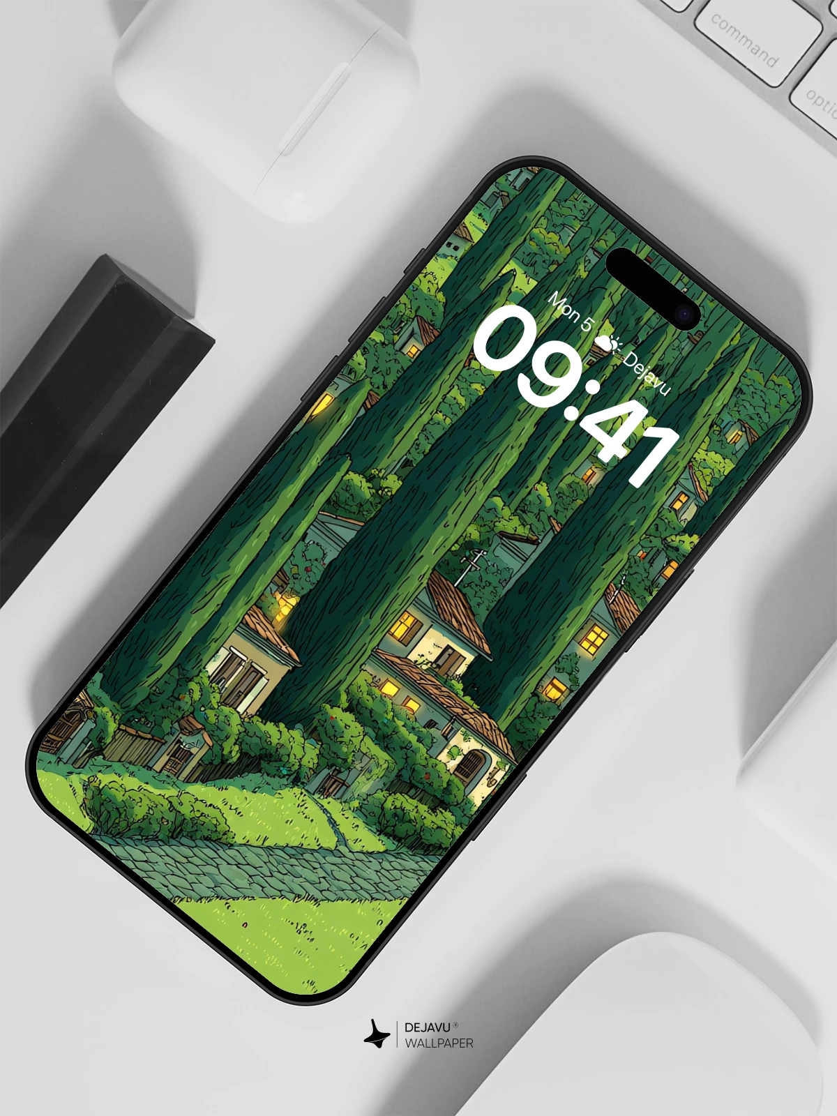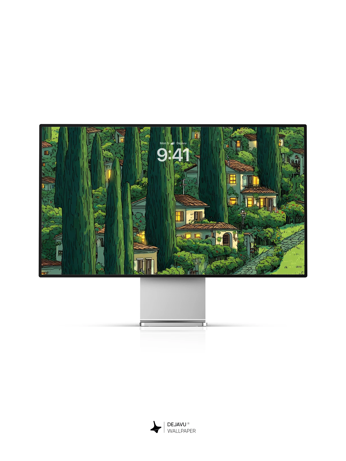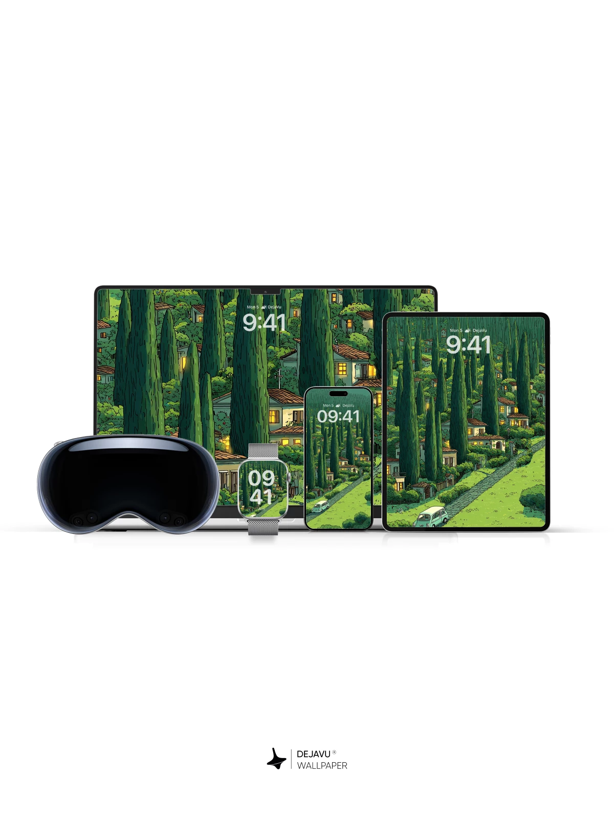 This enchanting illustration captures a serene, storybook village tucked into a lush forest of slender cypress trees, where soft golden lights spill from windows and a retro van travels along a cobblestone path. The whimsical, hand-drawn style evokes a sense of quiet magic and timeless charm, ideal as an 8K wallpaper for iPhone, Android, or tablet screens. Inspired by classic animated landscapes, it brings warmth and nostalgia to your device with its rich greens, detailed textures, and dreamy atmosphere.