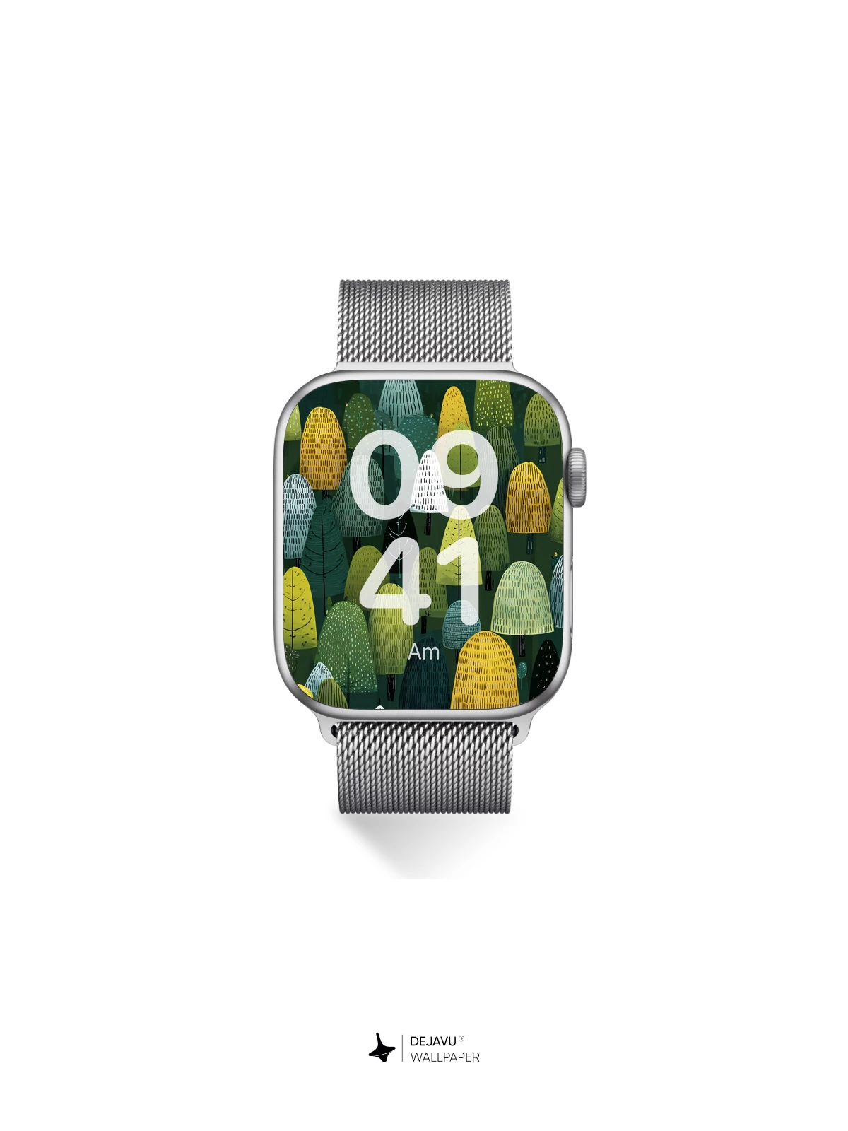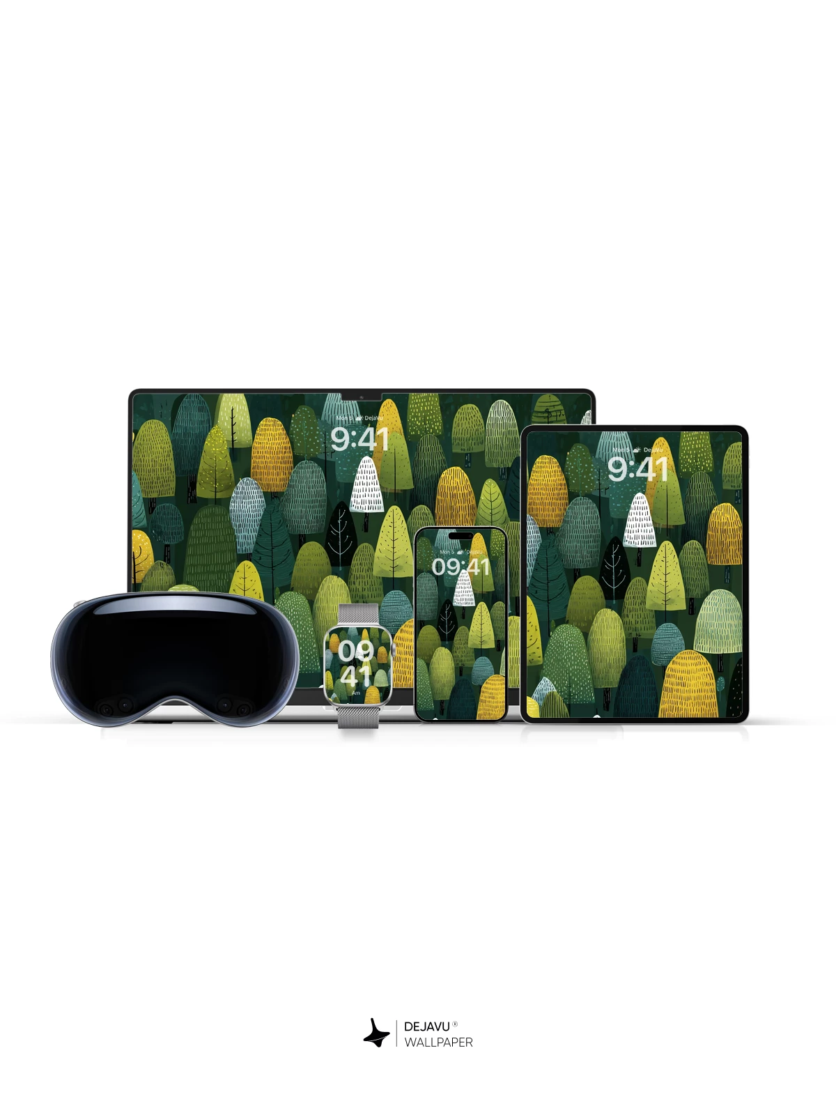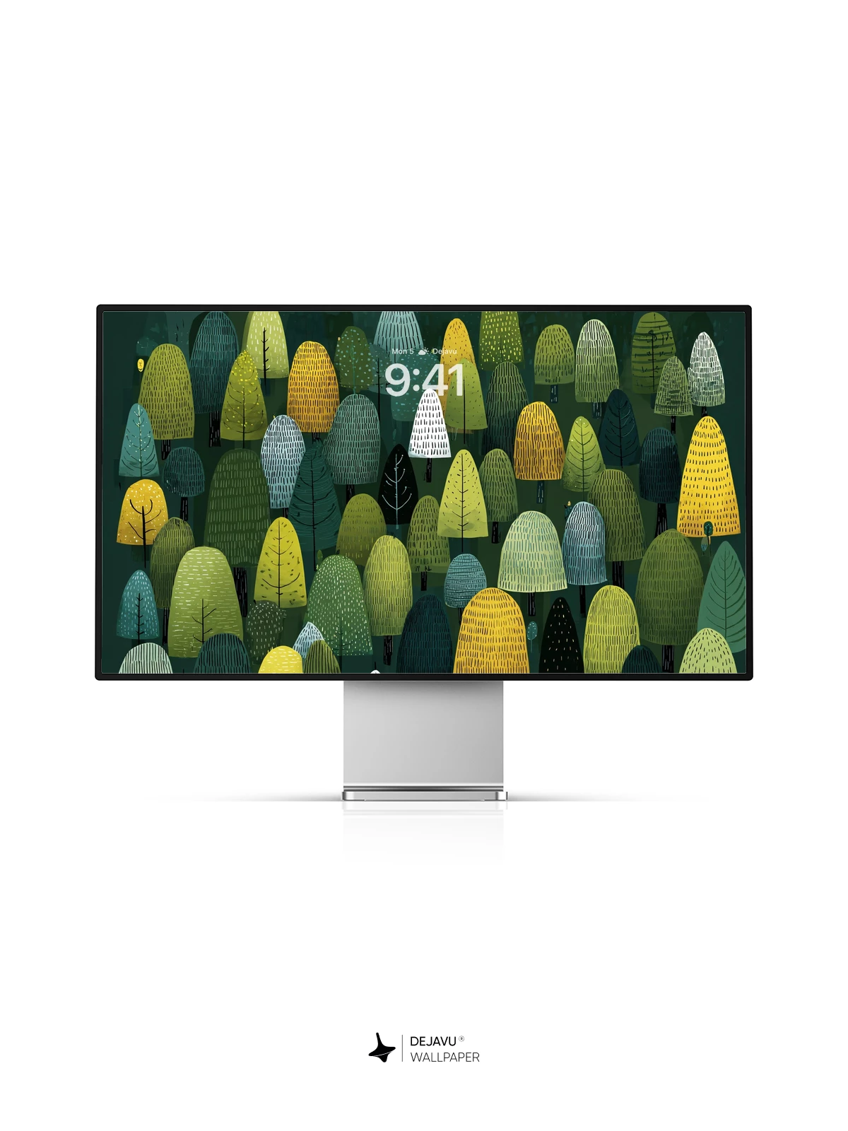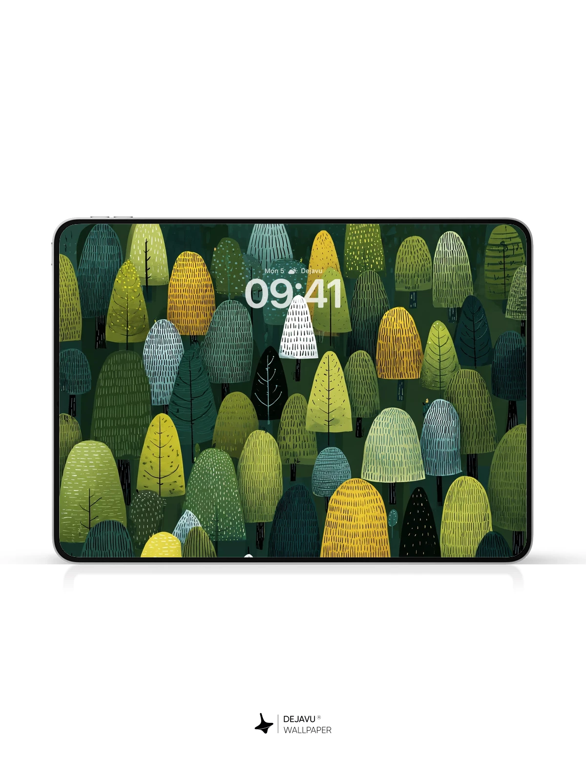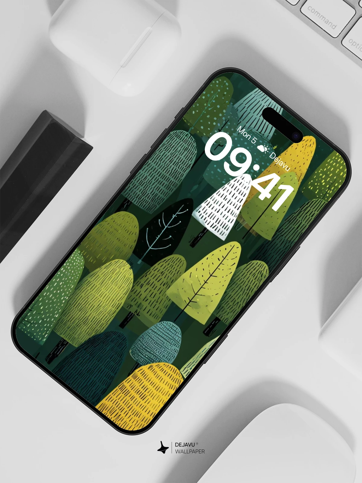 This enchanting wallpaper features a dense, dreamlike forest composed of hand-drawn, patterned trees in rich greens, yellows, and blues, evoking a sense of quiet wonder and natural harmony. Inspired by modern illustrative art, the design blends simplicity with depth, creating a soothing yet visually engaging backdrop. Whether you’re using an iPhone or Android device, this 8K resolution wallpaper brings a touch of whimsy and nature to your screen, transforming your mobile experience into a serene woodland journey.