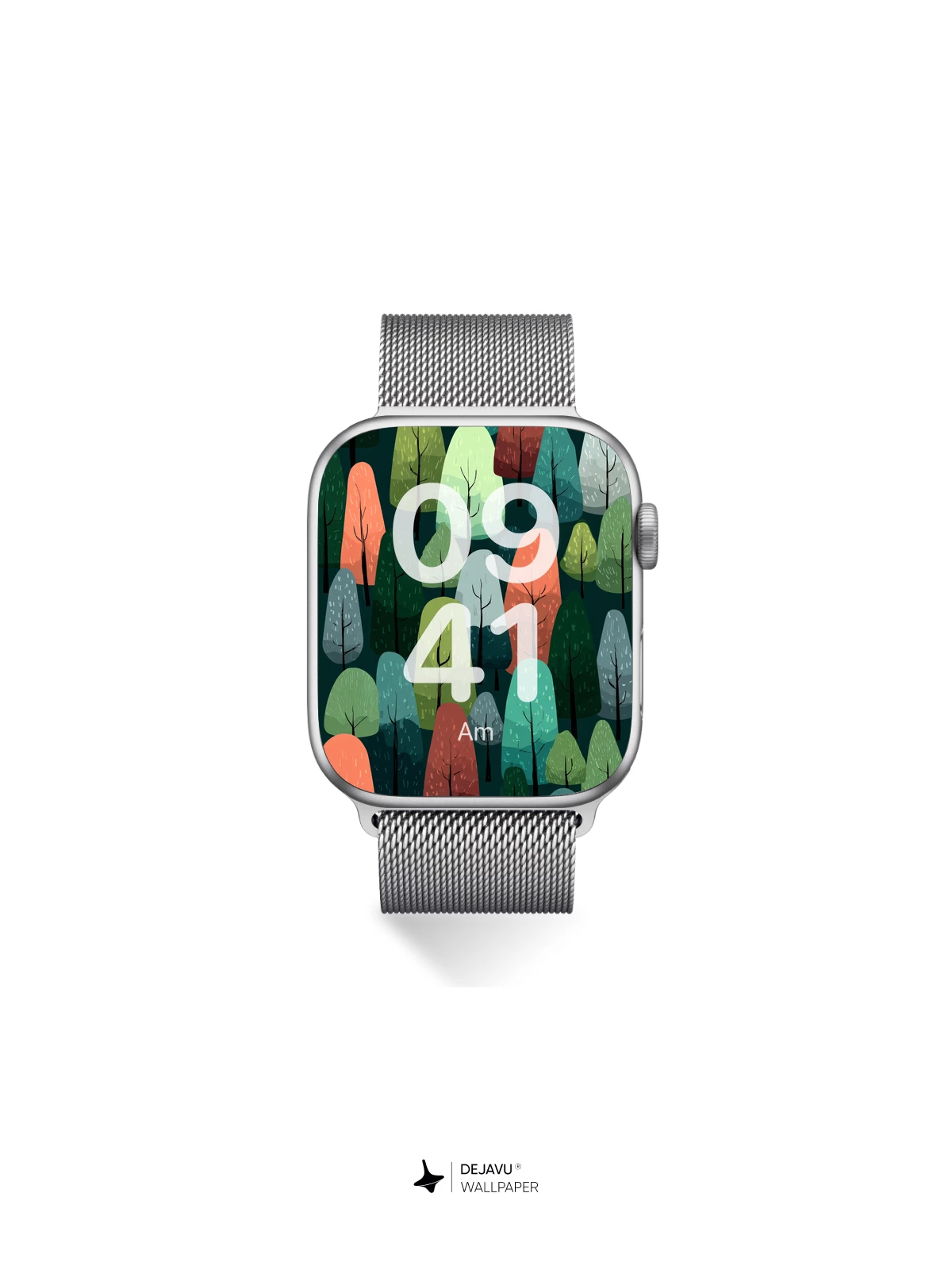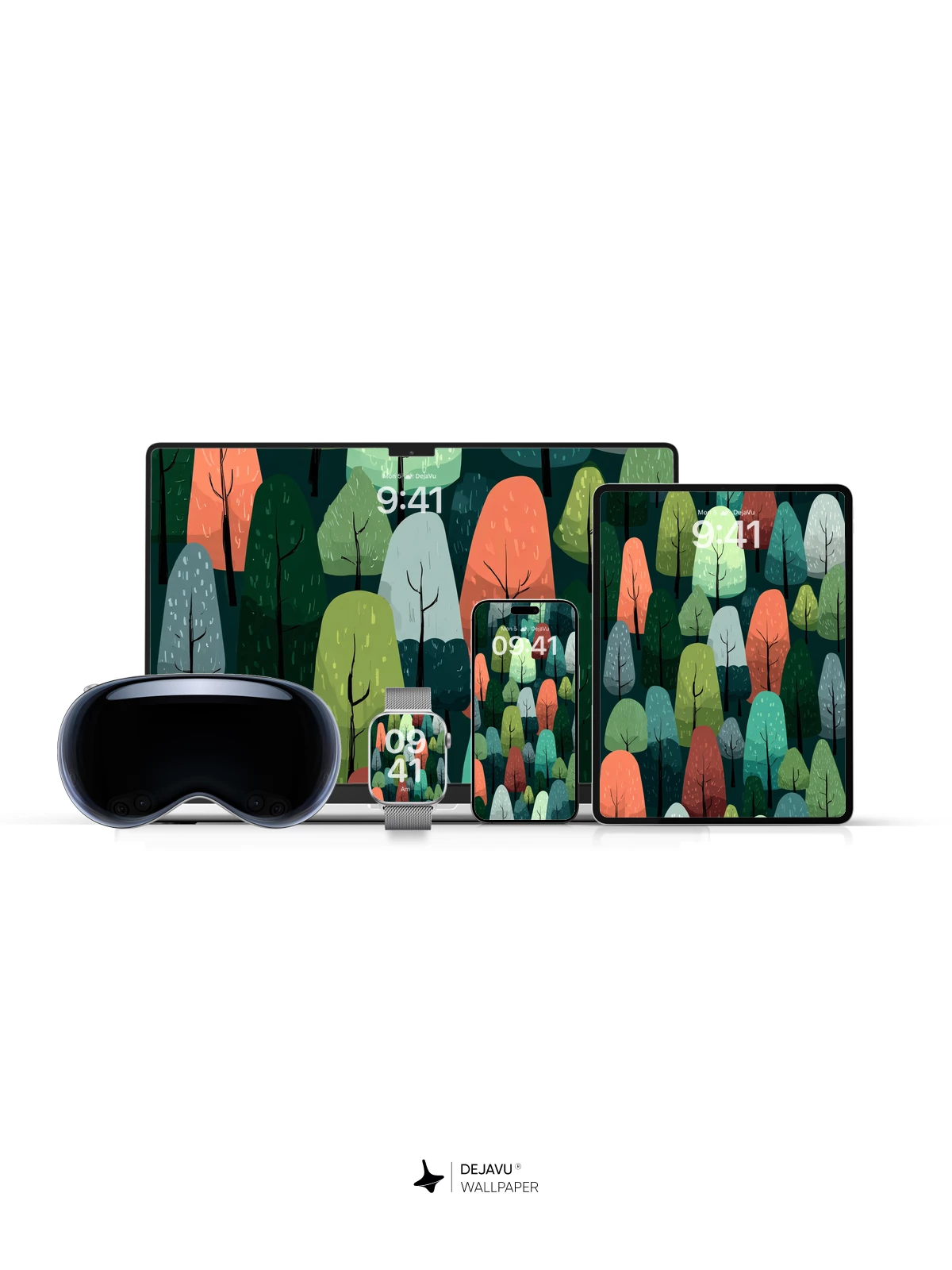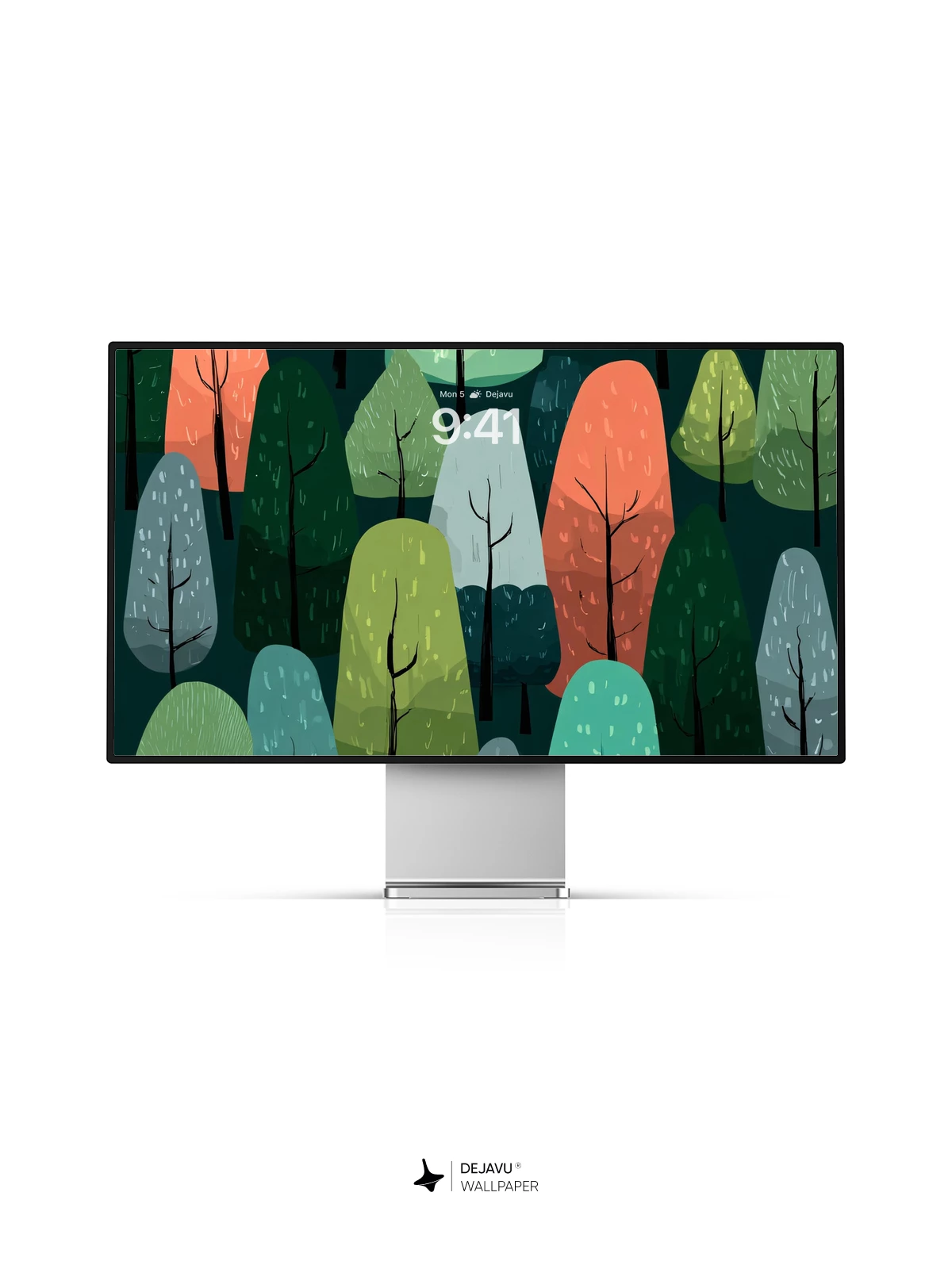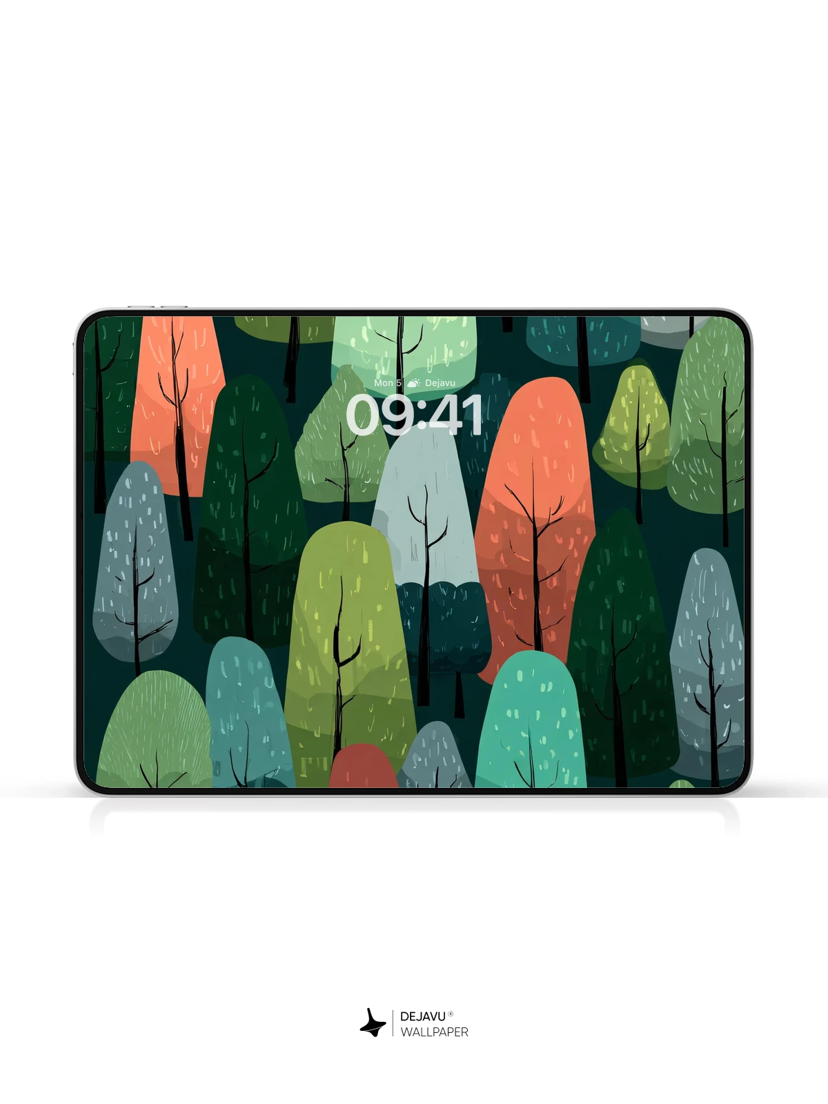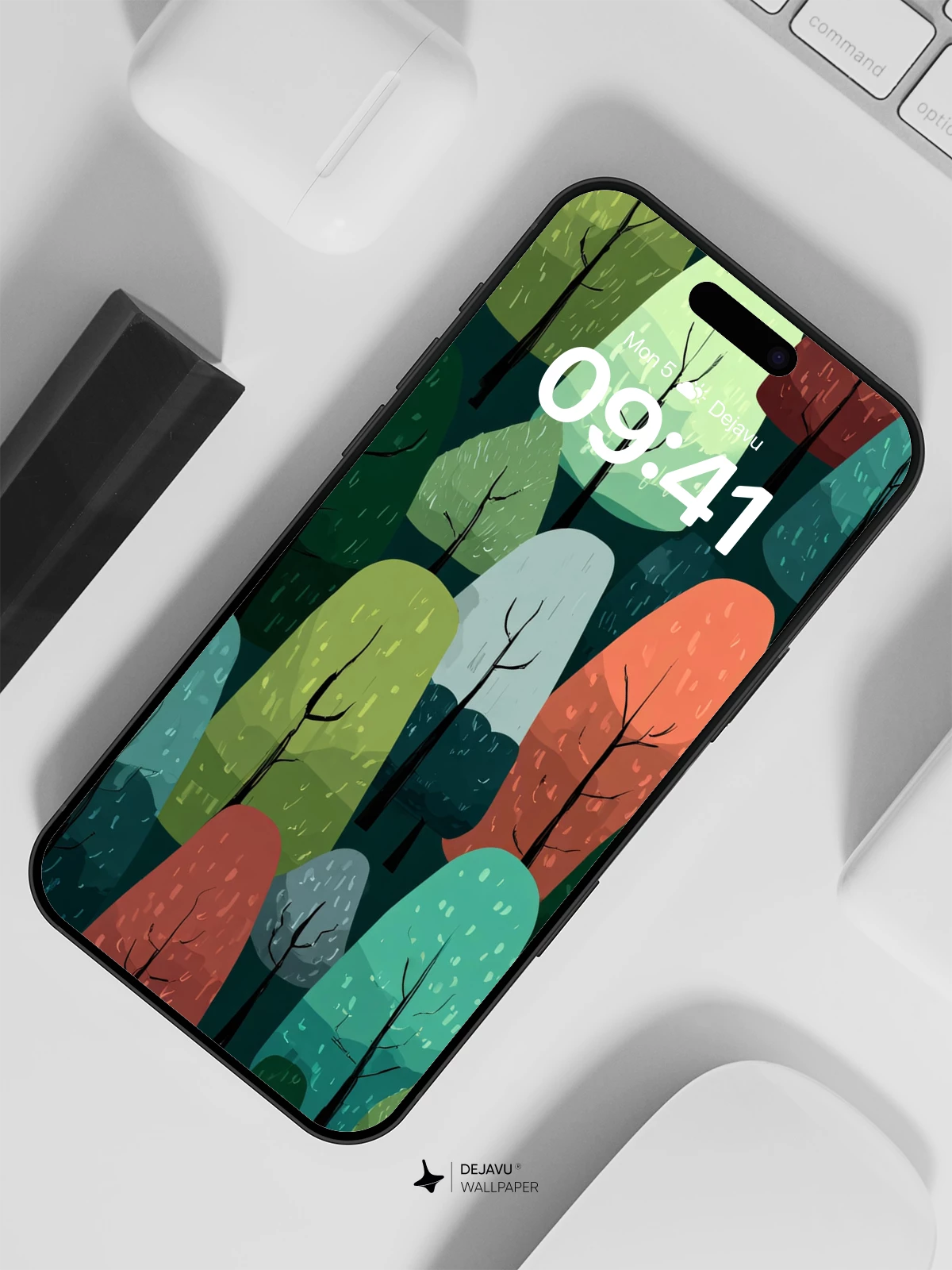 This enchanting wallpaper features a whimsical forest scene with abstract, softly rounded trees in bold hues of teal, coral, sage, and deep green, each adorned with delicate black branches. Inspired by modern illustrative art, the pattern evokes a sense of serene wonder and natural rhythm, perfect for adding a touch of fantasy to your iPhone or Android device. With its rich color palette and repeating motifs, it’s an ideal high-resolution 8K background for phones, tablets, and digital spaces—where every glance feels like a walk through a magical woodland.