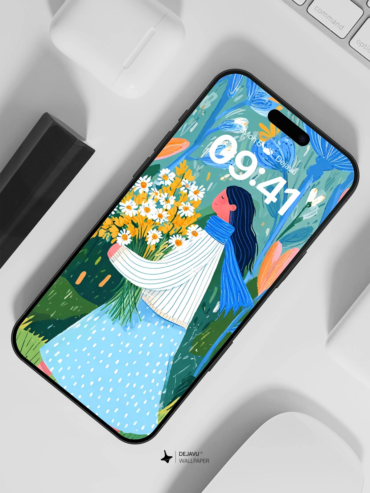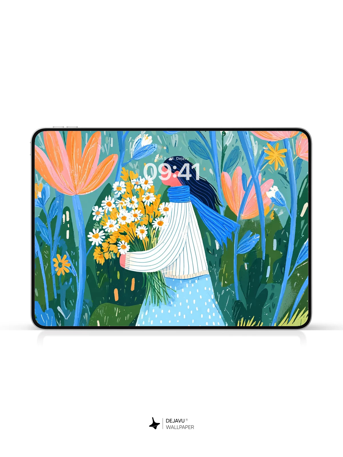 This enchanting illustration captures a serene moment of a young woman strolling through a fantastical garden bursting with oversized blue and peach blooms, accompanied by a curious white cat. Rendered in a delicate, hand-drawn style reminiscent of modern folk art, the scene blends whimsy with tranquility. The soft palette and flowing composition create a sense of gentle motion and harmony with nature. Ideal as an 8K wallpaper for iPhone, Android, or tablets, this artwork brings a touch of poetic charm to your mobile device.”.