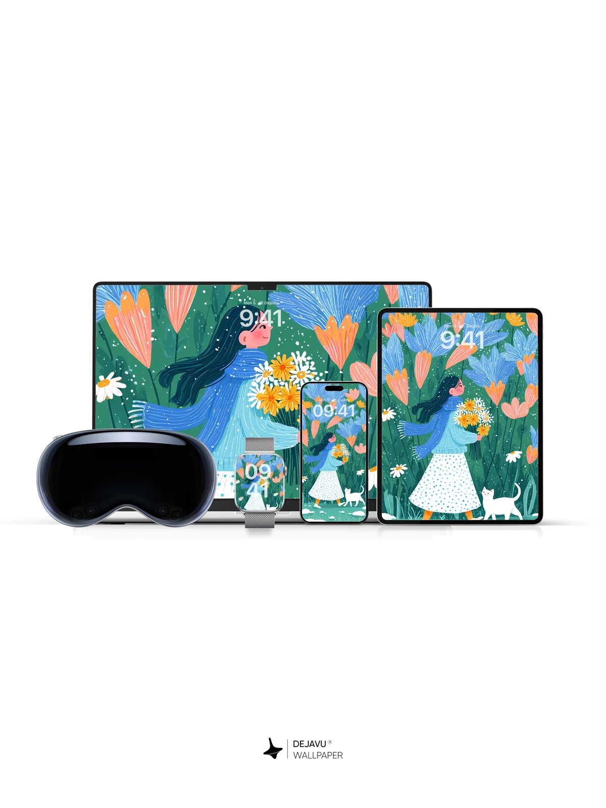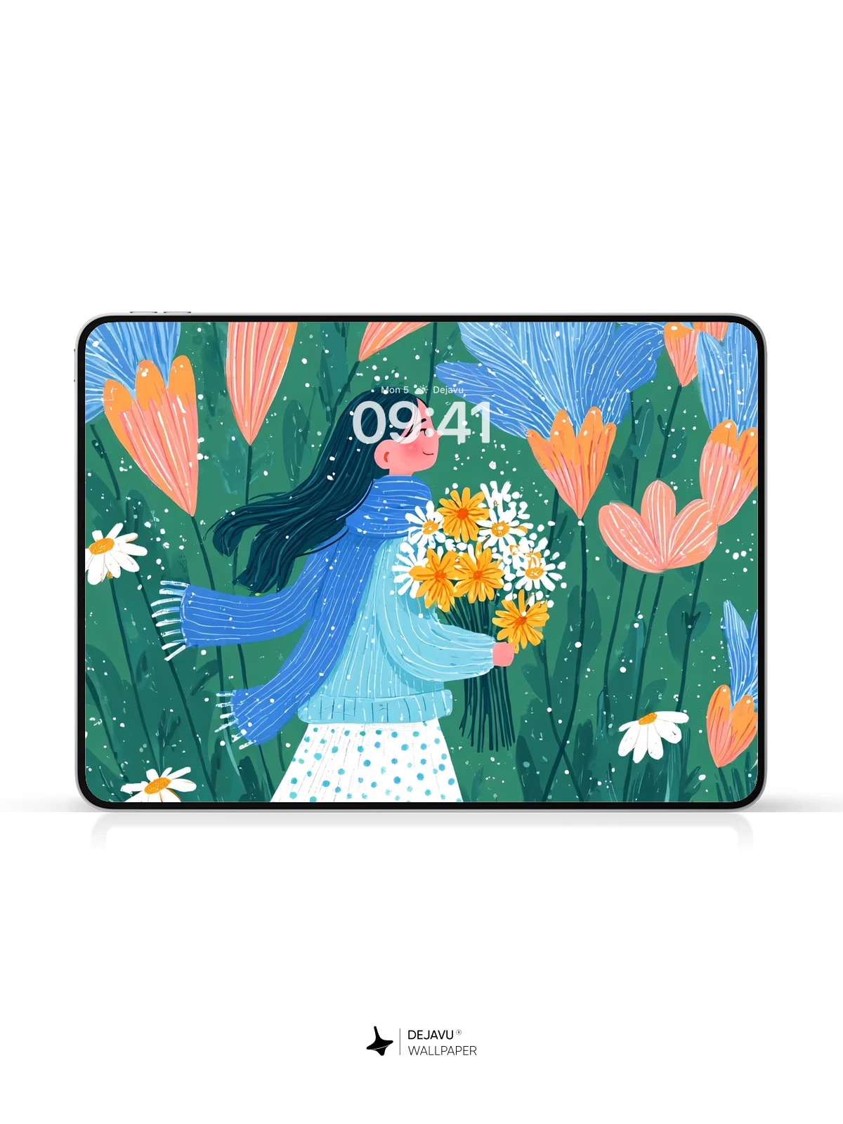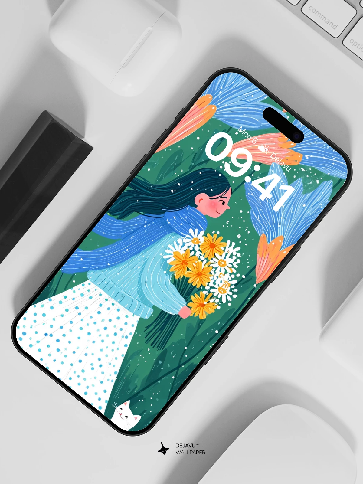 This enchanting 8K wallpaper captures a serene moment in a fantastical garden where oversized blue and orange blooms rise like gentle giants under a light dusting of snow. A young woman in a polka-dot dress and cozy scarf walks with a bouquet of daisies and sunflowers, accompanied by a curious white cat. The whimsical, hand-illustrated style evokes a sense of quiet wonder and timeless beauty, making it ideal for iPhone, Android, or tablet screens seeking a touch of magic and calm.”.